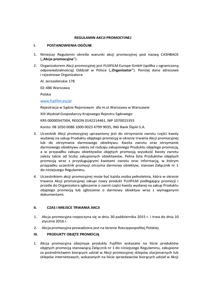 REGULAMIN AKCJI PROMOCYJNEJ I. POSTANOWIENIA OGÓLNE 1. Niniejszy Regulamin określa warunki akcji promocyjnej pod nazwą CASHBACK („Akcja promocyjna”). 2. Organizatorem Akcji promocyjnej jest FUJIFILM Europe GmbH (spółka z ograniczoną odpowiedzialnością) Oddział w Polsce („Organizator”). Poniżej dane adresowe i rejestrowe Organizatora: Al. Jerozolimskie 178 02-486 Warszawa Polska www.fujifilm.eu/pl Rejestracja w Sądzie Rejonowym dla m.st.Warszawa w Warszawie XIII Wydział Gospodarczy Krajowego Rejestru Sądowego KRS 00000347504, REGON 0142214461, NIP 1070015355 Konto: 08 1050 0086 1000 0023 4799 9035, ING Bank Śląski S.A. 3. Uczestnik Akcji promocyjnej uprawniony jest do otrzymania zwrotu części kwoty wydanej na zakup Produktu objętego promocją w okresie trwania Akcji promocyjnej lub do otrzymania darmowego obiektywu. Kwota zwrotu oraz otrzymanie darmowego obiektywu zależy od rodzaju zakupionego Produktu objętego promocją, a w przypadku zakupu obiektywów objętych promocją wysokość kwoty zwrotu zależy także od liczby zakupionych obiektywów. Pełna lista Produktów objętych promocją wraz z przysługującymi kwotami zwrotu oraz informacją, w którym przypadku uczestnik promocji otrzyma darmowy obiektyw, stanowi Załącznik nr 1 do niniejszego Regulaminu. 4. Uczestnikiem akcji promocyjnej może być każda osoba pełnoletnia, która w okresie trwania Akcji promocyjnej zakupi nowy produkt FUJIFILM podlegający promocji i prześle do Organizatora zgłoszenie o zwrot części kwoty wydanej na zakup Produktu objętego promocją lub zgłoszenie o darmowy obiektyw wraz z wymaganymi dokumentami. II. CZAS I MIEJSCE TRWANIA AKCJI 1. Akcja promocyjna rozpoczyna się w dniu 30 października 2015 r. i trwa do dnia 10 stycznia 2016 r. 2. Akcja promocyjna prowadzona jest na terenie Rzeczypospolitej Polskiej. III. PRODUKTY OBJĘTE PROMOCJĄ 1. Akcja promocyjna obejmuje produkty Fujifilm wskazane na liście produktów objętych promocją stanowiącą Załącznik nr 1 do niniejszego Regulaminu, zakupione za pośrednictwem biorących udział w Akcji promocyjnej sklepów stacjonarnych lub sklepów internetowych, wskazanych na liście sprzedawców biorących udział w Akcji promocyjnych, stanowiącej Załącznik nr 2 do niniejszego Regulaminu. 2. Akcja promocyjna nie obejmuje w szczególności używanych lub naprawianych produktów FUJIFILM oraz produktów FUJIFILM nie wymienionych na liście stanowiącej Załącznik nr 1, bądź zakupionych w inny sposób, niż za pośrednictwem sklepów stacjonarnych lub sklepów internetowych, wskazanych w Załączniku nr 2 do niniejszego Regulaminu. IV. ZGŁOSZENIE 1. Zgłoszenie o zwrot części kwoty wydanej na zakup Produktu objętego promocją lub o otrzymanie darmowego obiektywu należy składać w terminie 30-60 dni kalendarzowych od dnia zakupu Produktu objętego promocją. Termin na składanie zgłoszeń wynosi 60 dni, licząc od dokonaniu zakupu, a zgłoszenia otrzymane po tym terminie nie będą rozpatrywane. 2. Jedna osoba może przesłać nie więcej niż 3 zgłoszenia w okresie trwania Akcji promocyjnej, przy czym w sumie można wskazać nie więcej niż 10 Produktów objętych promocją. 3. Dwukrotne lub wielokrotne zgłoszenia dotyczące tego samego Produktu (tego samego modelu) objętego promocją są niedopuszczalne i nie będą rozpatrywane, przy czym przykładowo aparat X-T1 oraz zestawy X-T1 klasyfikuje się jako ten sam Produkt. Jeśli przedmiotem zakupu jest zestaw produktów to składowe wchodzące w zestaw nie mogą być zgłaszane jako osobne Produkty 4. W przypadku zakupu samych obiektywów, aby być uprawnionym do zwrotu części wydatkowanej kwoty z tytułu zakupu kilku obiektywów, zgłoszenie obejmujące obiektywy należy złożyć na jednym formularzu. Zakup wszystkich Produktów u tego samego sprzedawcy biorącego udział w Akcji promocyjnej nie jest wymagany. 5. W przypadku zakupu aparatu Fujifilm X-E2 lub zestawu składającego się z aparatu Fujifilm X-E2 i obiektywu Fujinon XF18-55mm, uczestnikowi promocji przysługuje darmowy obiektyw Fujinon XC 50-230mm, przy czym jeden uczestnik promocji może otrzymać tylko raz darmowy obiektyw Fujinon XC50-230mm w trakcie trwania promocji. 6. W przypadku zakupu kilku obiektywów, za zakup jednego zwrot wynosi 430zł, za zakup dwóch obiektywów 1290zł, za zakup 3 obiektywów 2150zł, a za każdy kolejny 430 zł. Jednakże, w przypadku zakupu kilku obiektywów tego samego modelu, Uczestnik promocji ma prawo do zwrotu tylko za jeden obiektyw. 7. Formularz zgłoszeniowy fujifilmcashback.com. dostępny jest na stronie internetowej 8. Aby wypełnić formularz zgłoszeniowy, należy wprowadzić swoje dane osobowe oraz dane na temat zakupu, w tym dołączyć: 1) dowód zakupu w postaci faktury lub paragonu, z wyraźnie widoczną datą zakupu, nazwą sprzedawcy oraz nazwą Produktu objętego promocją, 2) zdjęcie numeru seryjnego zakupionego Produktu objętego promocją znajdującego się na pudełku lub opakowaniu produktu. W przypadku produktów zakupionych za pośrednictwem internetu konieczne będzie także przedstawienie dowodu dostawy. 9. Zgłoszenia należy przesłać fujifilmcashback.com. za pośrednictwem strony internetowej 10. Po przesłaniu zgłoszenia uczestnik Akcji promocyjnej otrzyma wiadomość e-mail z potwierdzeniem otrzymania zgłoszenia przez Organizatora. V. ROZPATRYWANIE ZGŁOSZEŃ. ZWROT KWOTY. 1. W przypadku pozytywnego rozpatrzenia zgłoszenia kwota zwrotu zostanie przekazana na wskazany rachunek bankowy uczestnika Akcji promocyjnej, a darmowy obiektyw zostanie przesłany na adres podany w zgłoszeniu w terminie 14 dni kalendarzowych od daty pozytywnego rozpatrzenia zgłoszenia. Zwrot na rachunek jest jedynym możliwym sposobem przekazania zwrotu przez Organizatora. 2. Organizator zawiadomi uczestnika Akcji promocyjnej, jeśli złożone przez niego zgłoszenie ma braki. Zawiadomienie o brakach zgłoszenia przesłane zostanie do uczestnika Akcj