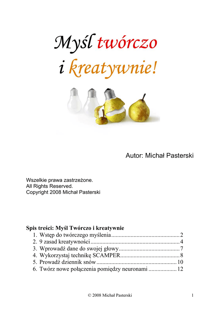 Autor: Michał Pasterski Wszelkie prawa zastrzeżone. All Rights Reserved. Copyright 2008 Michał Pasterski Spis treści: Myśl Twórczo i kreatywnie 1. Wstęp do twórczego myślenia.............................................. 2 2. 9 zasad kreatywności............................................................ 4 3. Wprowadź dane do swojej głowy......................................... 7 4. Wykorzystaj technikę SCAMPER........................................ 8 5. Prowadź dziennik snów...................................................... 10 6. Twórz nowe połączenia pomiędzy neuronami ................... 12 © 2008 Michał Pasterski 1 Wbrew powszechnej opinii kreatywność to nie cecha, z którą się trzeba urodzić. Używając prostych ćwiczeń twórczego myślenia możesz się nauczyć w każdym wieku. Znajdywanie pomysłów wymaga patrzenia na otaczający nas świat z różnych stron, przybierając nowe punkty widzenia. Twórcze myślenie polega na wychodzeniu poza utarte wzorce, na uwalnianiu się od wyuczonych schematów. Dostrzegania nowych możliwości może się nauczyć każdy. W tym dziale przygotowałem dla Ciebie kilka sposobów, dzięki których staniesz się bardziej kreatywny już zaraz. Zobaczysz, że twórcze myślenie jest niezwykle łatwe, a co więcej jest świetną zabawą. 1. Wstęp do twórczego myślenia Czym jest pomysł? Definicja pomysłu jest bardzo prosta: to nowa kombinacja starych elementów. Nie ma nowych elementów. Są tylko nowe kombinacje. Zapamiętaj to bardzo ważne zdanie, gdyż zawiera ono klucz do tworzenia nowych rozwiązań. Uświadom sobie, że: − Wszystkie obrazy świata są kombinacjami zaledwie trzech podstawowych kolorów − Cała muzyka jest kompozycją co najwyżej dwunastu nut − Cała literatura, która została napisana we współczesnym języku angielskim składa się z różnych zestawień zaledwie dwudziestu sześciu liter. Warto więc zobaczyć, że mówiąc o czymś „nowym”, w istocie mówimy o nowatorskim połączeniu istniejących już elementów. Uświadomienie sobie tego jest bardzo ważne- twórcze myślenie polega nie na wymyślaniu nowych elementów, ale na łączeniu tych już istniejących w nowe kombinacje. Zdaj sobie © 2008 Michał Pasterski 2 sprawę z tego, że wszystko, czego potrzebujesz, już jest w otaczającym Cię świecie. Za najlepszych wynalazców uważa się osoby stale zaabsorbowane nowymi kombinacjami. Î Kreatywność może być rozpatrywana na trzech obszarach. Weź pod uwagę każdy z nich, ich umiejętne połączenie to klucz do sukcesu. − Umiejętności- łączenia elementów, znajdywania możliwości gdzie inni ich nie znajdują, zmieniania istniejących już pomysłów. Umiejętności te każdy z nas posiada- jedni mniej rozwiniętą, inni bardziej. Najważniejsze jest to, że można ją w łatwy sposób wyćwiczyć. W tym dziale będziesz otrzymywał narzędzia, które Ci na to pozwolą. − podejście- nastawienie na znajdywanie nowych pomysłów jest bardzo ważne. Podejście to sposób myślenia. Mając otwarty umysł będziesz z dużo większą łatwością znajdywał nowe możliwości. Załóż, że wszystko, absolutnie wszystko jest możliwe. Mając takie przekonanie pomysły same będą Ci wpadały w ręce. Zdaj sobie sprawę z tego, że na świecie jest jeszcze ogromnie dużo rzeczy do odkrycia. − działanie- nie ma twórczego procesu bez działania. Aby znaleźć satysfakcjonujące Cię rozwiązanie, potrzebna jest praca. Mało jest kreatywnych pomysłów, które zostały stworzone w wyniku pojedynczego impulsu, nagłego olśnienia. Zdecydowana większość to wynik ciągłego tworzenia nowych rozwiązań, do czasu natrafienia na to jedno, najbardziej wyjątkowe. Twórcze myślenie polega na tym, że z setki stworzonych przez Ciebie przeciętnych pomysłów znajdujesz ten jeden niezwykły. Thomas Edison zanim wymyślił żarówkę, setki razy tworzył nieudane wynalazki. Był niezwykle uparty w dążeniu do swojego celu. Nawet po tylu niepowodzeniach wciąż tworzył. A teraz jest pamiętany jako jeden z najwybitniejszych wynalazców. Dlatego ważne jest, aby nie poddawać się po kilku niepowodzeniach, a działać bezustannie. Im więcej pomysłów, tym lepiej. © 2008 Michał Pasterski 3 2. 9 Zasad Kreatywności Oto kilka podstawowych zasad twórczego myślenia. Zapoznaj się z nimi koniecznie! Zastanów się nad każdym punktem, a pozwoli Ci to przyjąć pożądaną postawę. Gdy zbudujesz już odpowiednią postawę, zapoznaj się z technikami przedstawionymi w pozostałych rozdziałach, a przekonasz się, że możesz być kreatywny w każdej chwili swojego życia. 1. Model świata Nie traktuj świata jako całkowicie poznanego i opisanego. Zdaj sobie sprawę z tego, że tak naprawdę o tym świecie wiemy bardzo, ale to bardzo mało, i pozostała jeszcze ogromna ilość rzeczy do odkrycia. Otwórz się na nowe możliwości i przyjmij postawę- wszystko jest możliwe! Kiedyś Lord Kelvin powiedział, że niemożliwe jest istnienie latających maszyn cięższych od powietrza, prezes wytwórni Warner Bros powiedział, że nikt nie będzie chciał słuchać jak aktorzy gadają, a prezes Biura Patentowego USA chciał w 1899 roku je zlikwidować, bo według niego wszystko, co można było wynaleźć, już zostało wynalezione... 2. Poczekaj z oceną Zanim ocenisz jakiś problem, postaraj się go dokładnie zbadać z jak największą ilością obiektywizmu. Nie szufladkuj go jako dobrego lub złego, nie zastanawiaj się czy Ci się on podoba czy nie. Subiektywne odczucia ograniczają Twoją zdolność do znajdywania rozwiązań. Bądź otwarty na inne punkty widzenia, jeśli ktoś widzi problem inaczej niż Ty, zastanów się dlaczego. Staraj się patrzeć na problemy z różnych perspektyw, to pozwoli Ci znaleźć rozwiązania dotąd dla Ciebie niewidoczne. 3. Wizualizuj Znajdź czas na chwilę spokoju, zamknij oczy, odpręż się i pozwól, aby Twoja wyobraźnia sa