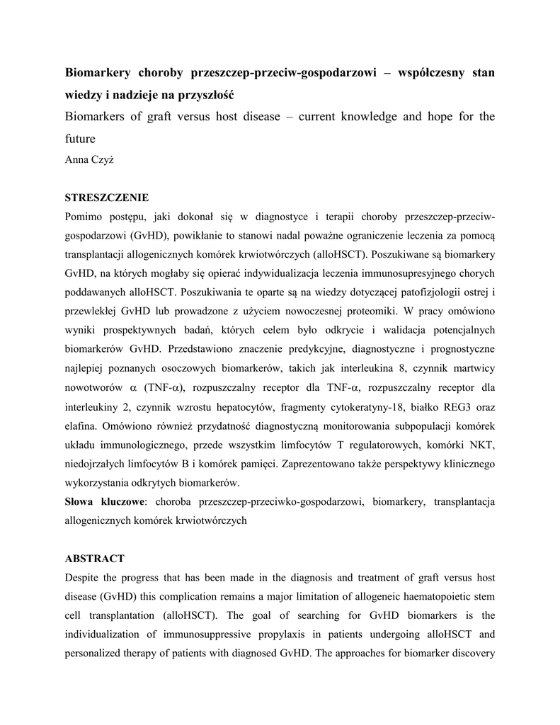 Biomarkery choroby przeszczep-przeciw-gospodarzowi ‒ współczesny stan wiedzy i nadzieje na przyszłość Biomarkers of graft versus host disease ‒ current knowledge and hope for the future Anna Czyż STRESZCZENIE Pomimo postępu, jaki dokonał się w diagnostyce i terapii choroby przeszczep-przeciwgospodarzowi (GvHD), powikłanie to stanowi nadal poważne ograniczenie leczenia za pomocą transplantacji allogenicznych komórek krwiotwórczych (alloHSCT). Poszukiwane są biomarkery GvHD, na których mogłaby się opierać indywidualizacja leczenia immunosupresyjnego chorych poddawanych alloHSCT. Poszukiwania te oparte są na wiedzy dotyczącej patofizjologii ostrej i przewlekłej GvHD lub prowadzone z użyciem nowoczesnej proteomiki. W pracy omówiono wyniki prospektywnych badań, których celem było odkrycie i walidacja potencjalnych biomarkerów GvHD. Przedstawiono znaczenie predykcyjne, diagnostyczne i prognostyczne najlepiej poznanych osoczowych biomarkerów, takich jak interleukina 8, czynnik martwicy nowotworów (TNF-), rozpuszczalny receptor dla TNF-, rozpuszczalny receptor dla interleukiny 2, czynnik wzrostu hepatocytów, fragmenty cytokeratyny-18, białko REG3 oraz elafina. Omówiono również przydatność diagnostyczną monitorowania subpopulacji komórek układu immunologicznego, przede wszystkim limfocytów T regulatorowych, komórki NKT, niedojrzałych limfocytów B i komórek pamięci. Zaprezentowano także perspektywy klinicznego wykorzystania odkrytych biomarkerów. Słowa kluczowe: choroba przeszczep-przeciwko-gospodarzowi, biomarkery, transplantacja allogenicznych komórek krwiotwórczych ABSTRACT Despite the progress that has been made in the diagnosis and treatment of graft versus host disease (GvHD) this complication remains a major limitation of allogeneic haematopoietic stem cell transplantation (alloHSCT). The goal of searching for GvHD biomarkers is the individualization of immunosuppressive propylaxis in patients undergoing alloHSCT and personalized therapy of patients with diagnosed GvHD. The approaches for biomarker discovery may be based on the knowledge of the pathophysiology of acute and chronic GvHD, or carried out with the use of modern proteomics. This paper presents the results of prospective studies aimed at the discovery and validation of GvHD biomarkers. The predictive, diagnostic and prognostic value of the biomarkers, such as interleukin 8, tumor necrosis factor (TNF-), soluble TNF receptor type 1, soluble receptor for interleukin 2, hepatocyte growth factor, cytokeratin-18 fragments, regenerating islet-derived 3- and elafin are discussed, along with the consideration on the usefulness of monitoring of immune cells subpopulations, such as regulatory T cells, NKT cells, naive B cells and memory B cells. The potential impact of biomarkers on GvHD prophylaxis and treatment is presented. Key words: Graft versus host disease, Biomarkers, Allogeneic haematopoietic stem cell transplantation