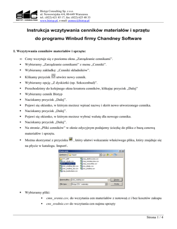 Bistyp Consulting Sp. z o.o. ul. Nowowiejska 4/4, 00-649 Warszawa tel.: (022) 621 85 17, fax: (022) 625 48 33 www.bistyp.pl, e-mail: [email protected] Instrukcja wczytywania cenników materiałów i sprztu do programu Winbud firmy Chandney Software I. Wczytywania cenników materiałów i sprz tu: • Ceny wczytuje si z poziomu okna „Zarzdzanie cennikami”. Wybieramy „Zarzdzanie cennikami” z menu „Cenniki”. Wybieramy zakładk: „Cenniki składników”. Klikamy przycisk Wybieramy opcj „Z dyskietki (np. Sekocenbud)”. Przechodzimy do kolejnego okna kreatora cenników, klikajc przycisk „Dalej” Wybieramy cennik Bistyp Naciskamy przycisk „Dalej”. Pojawi si okienko, w którym moesz wpisa nazw i skrót nowo utworzonego cennika. Naciskamy przycisk „Dalej”. Pojawi si okienko, w którym moesz wybra walut dla nowego cennika. Naciskamy przycisk „Dalej”. Na stronie „Pliki cenników” w oknie edycyjnym podajemy ciek do pliku z baz cenow utwórz nowy cennik. materiałów i sprztu. Mona skorzysta z przycisku , który ułatwi wskazanie właciwego pliku, który znajduje si na płycie w katalogu. Import\. Wybieramy pliki: cmn_srenie.csv, do wczytania cen materiałów z notowa z i bez kosztów zakupu cns_srednie.csv do wczytania cen najmu sprzty Strona 1 / 4 Bistyp Consulting Sp. z o.o. ul. Nowowiejska 4/4, 00-649 Warszawa tel.: (022) 621 85 17, fax: (022) 625 48 33 www.bistyp.pl, e-mail: [email protected] Wciskamy przycisk „Otwórz” - pojawia si ponownie okno pliki cenników Przed wczytaniem prosz sprawdzi opcje wczytywania materiału i sprz tu (przycisk opcje) Uwaga !!! Separator dziesitny musi by „ . ” (kropka) Wciskamy przycisk „Utwórz”. Po wczytaniu bazy cenowej wywietlana jest lista składników, które mona dopisa do bazy. Naciskamy przycisk „OK”. Ceny składników zostaj dopisane do bazy i powstaje raport o błdach zaistniałych przy odczycie pliku ródłowego. Po zatwierdzeniu raportu, cennik dodany zostaje do bazy cenników systemu WINBUD Kosztorys. Strona 2 / 4 Bistyp Consulting Sp. z o.o. ul. Nowowiejska 4/4, 00-649 Warszawa tel.: (022) 621 85 17, fax: (022) 625 48 33 www.bistyp.pl, e-mail: [email protected] II. Wczytywania cenników producentów: • Ceny wczytuje si z poziomu okna „Zarzdzanie cennikami”. Wybieramy „Zarzdzanie cennikami” z menu „Cenniki”. Wybieramy zakładk: „Cenniki składników”. Klikamy przycisk Wybieramy opcj „Z dyskietki (np. Sekocenbud)”. Przechodzimy do kolejnego okna kreatora cenników, klikajc przycisk „Dalej” Wybieramy cennik Bistyp (Cennik producentów) Naciskamy przycisk „Dalej”. Pojawi si okienko, w którym moesz wpisa nazw i skrót nowo utworzonego cennika. Naciskamy przycisk „Dalej”. Pojawi si okienko, w którym moesz wybra walut dla nowego cennika. Naciskamy przycisk „Dalej”. Na stronie „Pliki cenników” w oknie edycyjnym podajemy ciek do pliku z baz cenow utwórz nowy cennik. materiałów i sprztu. Mona skorzysta z przycisku , który ułatwi wskazanie właciwego pliku, który znajduje si na płycie w katalogu. Import\. Wybieramy pliki: cmp_wszytkie.csv, do wczytania cen materiałów z wszystkich działów lub z jednego wybranego: cmp_instalacyjne.csv; cmp_budowlane.csv; cmp_elektryczne.csv Wciskamy przycisk „Otwórz” - pojawia si ponownie okno pliki cenników Przed wczytaniem prosz sprawdzi opcje wczytywania materiału (przycisk opcje) Strona 3 / 4 Bistyp Consulting Sp. z o.o. ul. Nowowiejska 4/4, 00-649 Warszawa tel.: (022) 621 85 17, fax: (022) 625 48 33 www.bistyp.pl, e-mail: [email protected] Uwaga !!! Separator dziesitny musi by „ . ” (kropka) Wciskamy przycisk „Utwórz”. Po wczytaniu bazy cenowej wywietlana jest lista składników, które mona dopisa do bazy. Naciskamy przycisk „OK”. Ceny składników zostaj dopisane do bazy i powstaje raport o błdach zaistniałych przy odczycie pliku ródłowego. Po zatwierdzeniu raportu, cennik dodany zostaje do bazy cenników systemu WINBUD Kosztorys. yczymy udanej pracy z programem Kontakt z naszym Biurem Bistyp Consulting Sp. z o.o. ul. Nowowiejska 4/4, 00-649 Warszawa tel.: 022 621 85 17, fax: 022 625 48 33 Adres e-mail pomocy technicznej [email protected] Strona 4 / 4
