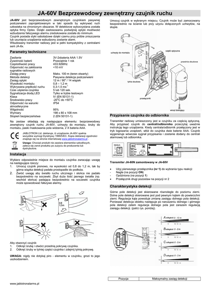 JA-60V Bezprzewodowy zewnętrzny czujnik ruchu JA-60V jest bezprzewodowym zewnętrznym czujnikiem pasywnej podczerwieni zaprojektowanym w taki sposób by wykrywać ruch człowieka na chronionym obszarze. W detektorze wykorzystana została optyka firmy Optex. Dzięki zastosowaniu podwójnej optyki możliwość wzbudzenia fałszywego alarmu zredukowana została do minimum. Czujnik posiada styki sabotażowe dzięki czemu przy próbie zniszczenia lub usunięcia urządzenia wzbudzony zostanie alarm. Wbudowany transmiter radiowy jest w pełni kompatybilny z centralami serii JA-6x. Umocuj czujnik w wybranym miejscu. Czujnik może być zamocowany bezpośrednio na ścianie lub przy użyciu dołączonych uchwytów, na słupie. Parametry techniczne Zasilanie Żywotność baterii Częstotliwość pracy Odporność na zakłócenia sygnałów radiowych Zasięg pracy Metoda detekcji Zasięg optyki Wysokość montażu Wykrywana prędkość ruchu Czas uśpienia czujnika Sygnalizacja diodą LED Klasa Środowisko pracy Odporność na warunki atmosferyczne Wilgotność Wymiary Stopień bezpieczeństwa 3V-2xbateria AAA 1.5V Przeciętnie 1 rok 433.92MHz <10 mV Maks. 100 m (teren otwarty) Pasywna detekcja podczerwieni 12 m / 90o / 14 wiązek 0,8 – 1,2 m 0,3-1,5 ms-1 5 lub 120 sek. Tylko w trybie testowym IV (EN 50131-1) -20oC do +50oC IP54 95% 198 x 80 x 108 mm 2 (EN 50131-1) Na zestaw składają się następujące elementu: bezprzewodowy zewnętrzny czujnik ruchu JA-60V, uchwyty do montażu, śruby do montażu, paski maskowania pola widzenia, 2 X bateria AAA. JABLOTRON Ltd. deklaruje, iż urządzenie JA-60V spełnia wszystkie wymogi Dyrektywy 1999/5/EC. Kopia deklaracji zgodności znajduje się na stronie internetowej www.jablotronalarms.pl . Przypisanie czujnika do odbiornika Transmiter radiowy umieszczony jest w czujniku za częścią optyczną. Aby przypisać czujnik do centrali/odbiornika przeczytaj uważnie instrukcję tego urządzenia. Kiedy centrala/odbiornik przełączony jest w tryb logowania urządzeń, włóż do czujnika dwie baterie AAA. Czujnik wygeneruje wówczas sygnał przypisania i zostanie dodany do centrali alarmowej lub odbiornika. Uwaga: Chociaż produkt nie zawiera elementów szkodliwych, zaleca się zwrot produktu po zużyciu do producenta lub dystrybutora. Instalacja Wybierz odpowiednie miejsce do montażu czujnika zwracając uwagę na następujące rzeczy: 1. Umocuj czujnik pionowo, na wysokości od 0,8 do 1,2 m, tak by górna wiązka detekcji padała prostopadle do podłoża. 2. Zwróć uwagę aby światło ruchu ulicznego i słońca nie padało bezpośrednio na soczewki. Zbyt duża ilość jasnego światła (np. wschód słońca) padająca bezpośrednio na soczewki czujnika może spowodować fałszywe alarmy. Transmiter JA-60N zamontowany w JA-60V • • Użyj pierwszego przełącznika (nr 1) do wybrania typu reakcji: Nagła (na pozycji ON) Opóźniona (na pozycji 1) Przełącznik drugi pozostaw na pozycji nr 2 Charakterystyka detekcji Górne pole detekcji jest skierowane równolegle do poziomu ziemi. Dolne pole detekcji skierowane jest pod pewnym kątem do powierzchni ziemi. Regulacja kąta powoduje zmianę zasięgu dolnego pola detekcji. Ponieważ detekcja obiektu następuje po naruszeniu dolnego i górnego pola detekcji zatem regulacja dolnego pola jest zarazem regulacją zasięgu detekcji. (patrz rys. poniżej). Aby otworzyć czujnik: 1. Odkręć śrubę i otwórz przednią pokrywę czujnika. 2. Odkręć śruby w tylniej części czujnika i zdejmij tylnią pokrywę. UWAGA: nigdy nie dotykaj piro - elementu w czujniku, grozi to jego uszkodzeniem. Pozycja www.jablotronalarms.pl Maksymalny zasięg detekcji Standardowy A B C D 12 m 8m 5m 2m Przy skrajnych temperaturach 10-15 m 6-10 m 4-5,5 m 1,5-2,5 m UWAGA: Maksymalny obszar detekcji może się różnić w zależności od temperatury. Czujnik automatycznie sprawdza poziom baterii. Jeżeli konieczna jest ich wymiana, to na około 2 tygodnie przed ich zupełnym rozładowaniem prześle o tym informację do centrali alarmowej. W tym czasie należy wymienić baterie na nowe. Przed wymianą baterii, centrala musi zostać przełączona w tryb, który zezwoli na otwarcie czujnika (tryb użytkownika lub programowania – zobacz instrukcja centrali alarmowej). Rozwiązywanie problemów Problem Czujnik wzbudza fałszywe alarmy Kąt widzenia 90o odpowiada 7 paskom na soczewce. Obracając zespół czujników można ustawić kąt w zakresie 180o ze skokiem o około 15o. Od czasu do czasu brak detekcji ruchu Czujnik nie pracuje Maskowanie pola widzenia – aby czujnik nie reagował na światła ruchu ulicznego lub odbicie światła podczas wschodu słońca, możliwe jest zamaskowanie pewnej części obszaru detekcji poprzez zastosowanie pasków dołączonych do zestawu. Prawdopodobna przyczyna Dolne pole detekcji jest niepotrzebnie zbyt wydłużone (złe ustawienie zasięgu – przełącznik ABCD). Czujnik narażony jest na ostre wiązki jasnego światła (wschód słońca, ruch uliczny, itp.). W pobliżu czujnika znajduje się źródło energii powodujące szybkie zmiany temperatur. W obszarze detekcji znajduje się ruchomy przedmiot . Obszar detekcji jest nieprawidłowo ustawiony. Czułość detekcji jest nieprawidłowo ustawiona. Słaba bateria Dioda LED nie świeci. Dioda LED świeci lecz nie ma reakcji na centrali. W czujniku możliwe jest ustawienie trzech poziomów czułości: L – niska czułość M – średnia czułość H – wysoka czułość Pozostałe parametry można ustawić posługując się przełącznikami: dioda LED włączona 120 s 4x dioda LED wyłączona 5 s czas uśpienia czujnika 2 x pobudzenie czujnika Dioda LED jest używana w czasie testowania czujnika. W normalnym trybie pracy zaleca się jej wyłączenie (oszczędność baterii). W zależności od ustawienia czasu uśpienia czujnika 5/120s, po wykryciu ruchu zostanie on zablokowany na okres 5 lub 120s. W zależności od ustawienia przełącznika ilości wzbudze