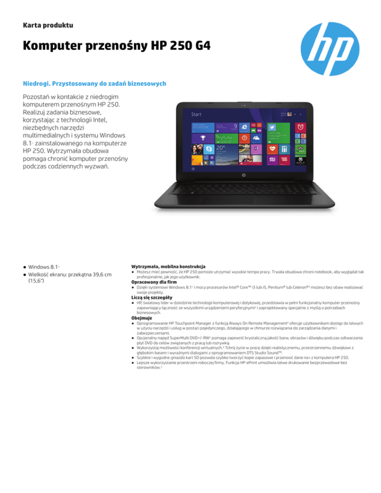 Karta produktu Komputer przenośny HP 250 G4 Niedrogi. Przystosowany do zadań biznesowych Pozostań w kontakcie z niedrogim komputerem przenośnym HP 250. Realizuj zadania biznesowe, korzystając z technologii Intel, niezbędnych narzędzi multimedialnych i systemu Windows 8.1 zainstalowanego na komputerze HP 250. Wytrzymała obudowa pomaga chronić komputer przenośny podczas codziennych wyzwań. 1 ● Windows 8.11 ● Wielkość ekranu: przekątna 39,6 cm (15,6") Wytrzymała, mobilna konstrukcja ● Możesz mieć pewność, że HP 250 pomoże utrzymać wysokie tempo pracy. Trwała obudowa chroni notebook, aby wyglądał tak profesjonalnie, jak jego użytkownik. Opracowany dla firm ● Dzięki systemowi Windows 8.11 i mocy procesorów Intel® Core™ i3 lub i5, Pentium® lub Celeron®3 możesz bez obaw realizować swoje projekty. Liczą się szczegóły ● HP, światowy lider w dziedzinie technologii komputerowej i dotykowej, przedstawia w pełni funkcjonalny komputer przenośny zapewniający łączność ze wszystkimi urządzeniami peryferyjnymi2 i zaprojektowany specjalnie z myślą o potrzebach biznesowych. Obejmuje ● Oprogramowanie HP Touchpoint Manager z funkcją Always On Remote Management6 oferuje użytkownikom dostęp do łatwych w użyciu narzędzi i usług w postaci pojedynczego, działającego w chmurze rozwiązania do zarządzania danymi i zabezpieczeniami. ● Opcjonalny napęd SuperMulti DVD+/-RW2 pomaga zapewnić krystaliczną jakość barw, obrazów i dźwięku podczas odtwarzania płyt DVD do celów związanych z pracą lub rozrywką. ● Wykorzystaj możliwości konferencji wirtualnych.4 Tchnij życie w pracę dzięki realistycznemu, przestrzennemu dźwiękowi z głębokim basem i wyraźnymi dialogami z oprogramowaniem DTS Studio Sound™. ● Szybkie i wygodne gniazdo kart SD pozwala szybko tworzyć kopie zapasowe i przenosić dane na i z komputera HP 250. ● Lepsze wykorzystanie przestrzeni roboczej firmy. Funkcja HP ePrint umożliwia łatwe drukowanie bezprzewodowe bez sterowników.5 Karta produktu Komputer przenośny HP 250 G4 Tabela specyfikacji Dostępny system operacyjny Windows 10 Pro 641 Windows 10 Home 641 Windows 8.1 Pro 641 Windows 8.1 641 Windows 7 Professional 64 (dostępny poprzez możliwość zmiany wersji systemu Windows 8.1 Pro na niższą)2 Windows 7 Home Basic 6418 FreeDOS 2.0 Rodzaj procesora5 Procesor Intel® Core™ i5; Procesor Intel® Core™ i3; Procesor Intel® Pentium®; Procesor Intel® Celeron® Dostępne procesory5 Intel® Core™ i5-5200U z kartą graficzną Intel HD Graphics 5500 (2,2 GHz, do 2,7 GHz z technologią Intel Turbo Boost, 3 MB pamięci podręcznej, 2 rdzenie); Intel® Core™ i3-4005U z kartą graficzną Intel HD Graphics 4400 (1,7 GHz, 3 MB pamięci podręcznej, 2 rdzenie); Intel® Celeron® N3050 z kartą graficzną Intel HD Graphics (1,6 GHz do 2,1 GHz, 2 MB pamięci podręcznej, 2 rdzenie); Intel® Pentium® 3825U z kartą graficzną Intel HD Graphics (1,9 GHz, 2 MB pamięci podręcznej, 2 rdzenie) Zestaw układów Układ Intel® SoC (chipset zintegrowany z procesorem) Maksymalna wielkość pamięci Maksymalnie 8 GB pamięci DDR3L-1600 SDRAM Informacje o standardowej pamięci: Szybkość transmisji do 1600 mln transferów/s. Obsługa technologii jednokanałowej. Gniazda pamięci 2 gniazda SODIMM (Core i5/i3); 1 gniazdo SODIMM (Pentium/Celeron) Wewnętrzna pamięć masowa 500 GB Maksymalnie 1 TB SATA (5400 obr./min)6 Optyczna pamięć masowa DVD+/-RW SuperMulti DL7 Wyświetlacz Płaski ekran LED o przekątnej 39,6 cm (15,6") HD SVA z powłoką antyrefleksyjną (1366 x 768)12 Dostępna karta graficzna Zintegrowany: Intel® HD Graphics 5500; Intel® HD Graphics 4400; Intel® HD Graphics12 Dedykowane: AMD Radeon™ R5 M330 (2 GB dedykowanej pamięci DDR3)13 Karta dźwiękowa DTS Studio Sound™; Dwa głośniki Technologie bezprzewodowe Karta sieci bezprzewodowej Realtek 802.11b/g/n (1 x 1) WiFi oraz moduł Bluetooth® 4.0 Combo (Produkt zgodny z urządzeniami z certyfikatem Miracast (modele z systemem Windows 8.1)) Komunikacja Karta sieciowa Realtek Ethernet (10/100); Karta sieciowa Realtek Ethernet (10/100/1000) (wybrane modele) Gniazda rozszerzeń 1 czytnik cyfrowych kart pamięci z obsługą wielu formatów; (obsługa kart pamięci SD, SDHC, SDXC) Porty i złącza 1 port USB 3.0; 2 porty USB 2.0; 1 port VGA; 1 port HDMI; 1 wyjście słuchawkowe/mikrofonowe combo; 1 gniazdo zasilacza pr. zm.; 1 port RJ-4511 Urządzenie wejściowe Pełnowymiarowa, fakturowana czarna klawiatura wyspowa z klawiaturą numeryczną Płytka dotykowa Touchpad z obsługą gestów wielopunktowych, domyślnie włączoną funkcją stuknięć, domyślnie włączonym przewijaniem i powiększaniem 2 palcami Kamera internetowa Kamera internetowa VGA14 Dostępne oprogramowanie Należy zakupić pakiet Office; Instalator Recovery Manager; CyberLink YouCam DE; CyberLink Power DVD (dostępne w wybranych modelach); CyberLink Media Suite; CyberLink Power2Go; HP Connected Photo; McAfee™ Internet Security; Instrukcja Rozpoczęcie pracy z systemem Windows 8.115 Zarządzanie bezpieczeństwem Moduł TPM z oprogramowaniem sprzętowym; Gniazdo blokady zabezpieczającej (blokadę należy zakupić osobno)16 Zasilanie Zasilacz pr. zm. 65 W Smart (modele oddzielne); Zasilacz pr. zm. 45 W Smart (modele zintegrowane); Zasilacz pr. zm. 65 W EM Smart (tylko dla Chin i Indii) 4-ogniwowy, 41 Wh, litowo-jonowy; 3-ogniwowy, 31 Wh, litowo-jonowy Wymiary 38,43 x 25,46 x 2,43 cm Waga Od 2,1 kg (Waga zależy od konfiguracji.) Spełniane normy w zakresie sprawności energetycznej Dostępne są konfiguracje z certyfikatami ENERGY STAR® i EPEAT® Silver Gwarancja Roczna ograniczona gwarancja (dostępne są sprzedawane oddzielnie opcjonalne pakiety Care Pack), roczna ograniczona gwarancja na akumulator główny Karta produktu Komputer przenośny HP 250 G4 Akcesoria i usługi (nie wchodzą w skład zestawu) Replikator portów USB 3.0 HP 3001pr Wygodne, niezależne od platformy i st