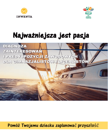 . Najwazniejsza jest pasja DIAGNOZA ZAINTERESOWAŃ I PREDYSPOZYCJI ZAWODOWYCH DLA GIMNAZJALISTÓW I LICEALISTÓW . Pomóz Twojemu dziecku zaplanować przyszłość D rogi Rodzicu, czy chciałbyś wesprzeć Twoje dziecko w wyborze odpowiedniej szkoły? Czy chciałbyś pomóc mu w wyborze przedmiotów, które powinien rozszerzać w liceum? A może Twoje dziecko potrzebuje wsparcia podczas podejmowania decyzji o przyszłych studiach? Z pewnością pragniesz wspierać tego młodego człowieka, aby dokonywał dobrych wyborów, aby wchodził w dorosłe życie zadowolony ze swoich decyzji i przygotowany do budowy satysfakcjonującej drogi zawodowej, aby zawsze czerpał z bogactwa swoich talentów. Odpowiednie wykorzystanie tych talentów to podążanie „zieloną ścieżką”, czyli harmonijny rozwój osobisty każdego człowieka. Firma Doradztwa Personalnego Inwenta oraz Fundacja Pasja do Edukacji przygotowały program, który wspiera dzieci i rodziców w podejmowaniu decydujących kroków edukacyjnych. Nasz program diagnostyczno-rozwojowy pomaga młodzieży i rodzicom w diagnozowaniu zainteresowań, odkrywaniu mocnych stron i predyspozycji zawodowych. OFERTA DLA UCZNIÓW GIMNAZJÓW I LICEÓW: Pomaga odkrywać najbardziej efektywny sposób uczenia się, Odpowiada na pytanie, jaką wybrać szkołę aby realizować swoją pasję i talenty? Pomaga uczniom odkrywać naturalne zdolności tak, aby umieli je wykorzystać do samorealizacji w życiu zawodowym. OFERTA DLA RODZICÓW: Pomaga poznać i zrozumieć predyspozycje dziecka, Uczy, jak wspierać dziecko w wyborze ścieżki edukacyjnej i zawodowej. Po co organizujemy program? Aby pomagać gimnazjalistom i licealistom w określeniu preferowanego zawodu, zgodnego z naturalnymi predyspozycjami – odszukanie „zielonej ścieżki” w życiu. Aby wesprzeć rodziców w poszukiwaniu odpowiedzi na pytanie: jak pomóc dziecku w okresie budowania swojej tożsamości, poszukiwania własnej drogi zawodowej, tak aby stało się szczęśliwym, osiągającym sukcesy człowiekiem. Aby wzmocnić naturalną motywację uczniów do uczenia się poprzez odkrywanie i uszanowanie osobistych wzorców myślenia i działania. Aby poprzez pracę grupową uczniowie przyjrzeli się sobie w kontekście innych osób – ich strategii poznawczych, naturalnych predyspozycji i stylów myślenia. Aby mogli odpowiedzieć na pytanie: co jest we mnie wyjątkowego – jakie mam talenty, które warto wykorzystać w ścieżce edukacyjnej i zawodowej. 1 Jak długo trwa diagnoza? Program jest rozłożony na 2 spotkania grupowe po trzy godziny każde. Jest to praca w dwóch odrębnych grupach - uczniów i rodziców. Całość programu kończy się podsumowującym, godzinnym spotkaniem indywidualnym dla ucznia wraz z rodzicem. Kiedy odbędą się najbliższe zajęcia? Miejsce spotkania Centrum Filtrowa ul. Filtrowa 75/17 Warszawa Tel: 22 50 234 70 Terminy spotkań Rodzaj zajęć 15.09. 2015.(wtorek) w godz. 17.00 –20.00 Spotkanie grupowe 22.09. 2015.(wtorek) w godz. 17.00 –20.00 Spotkanie grupowe Październik (terminy do ustalenia) Spotkania indywidualne NARZĘDZIA DIAGNOSTYCZNE WYKORZYSTYWANE W TRAKCIE WARSZTATÓW, na podstawie których zostanie przygotowany i omówiony INDYWIDUALNY RAPORT WSPIERAJĄCY UCZNIA Kwestionariusz preferowanych aktywności m.in. zawodowych, Kwestionariusz dominacji półkulowej – wpływającej na nasz sposób zbierania i przetwarzania danych oraz sposób emocjonalnego reagowania, Kwestionariusz dominacji sensorycznej – wpływającej m.in. na sposób uczenia się, Profil lateralny – określający dominujące części ciała, będące ważnym aspektem wpływającym na proces uczenia się i świadomej pracy pod presją czasu/stresu. Program Diagnozy zakłada również aktywne uczestnictwo rodzica (rodziców) w zajęciach. Każdy rodzic będzie miał unikalną możliwość poznania także swoich Indywidualnych Talentów, zgodnie z metodyką Instytutu Gallupa, tak aby rozumiejąc swoje Talenty potrafił pracować z dzieckiem w obszarze jego mocnych stron, aby nauczył się akceptować jego style poznawcze i preferencje dotyczące schematów działania. Zajęcia będą prowadzone w grupie ok. 15 osób. 2 PROGRAM ZAJĘĆ POMÓŻ TWOJEMU DZIECKU ZAPLANOWAĆ PRZYSZŁOŚĆ! UCZEŃ RODZIC diagnoza i trening rozwojowy trening i sesje poznawcze do diagnozy dziecka UCZNIOWE I sesja grupowa - 3 godziny w podziale na grupy: RODZICE Rozpoznanie swoich zasobów, w czym jestem dobry, co lubię, co sprawia mi przyjemność? Diagnoza potencjału efektywnego uczenia się – odkrycie i zrozumienie indywidualnego stylu uczenia się oraz określenie najlepszej indywidualnej strategii uczenia się w oparciu o: - Styl uczenia się - dominujący profil półkul mózgowych, - Indywidualne strategie uczenia się – piramidy percepcji, - Profil lateralny ciała. Wszystkie wykonane ćwiczenia i diagnozy są bogato komentowane, aby uczniowie rozumieli na każdym etapie zajęć, co ważnego z nich wynika. UCZNIOWE Każdy ma mózg – pytanie tylko jak on pracuje? Co wiemy z dziedziny neurodydaktyki i jak to wpływa na nas i nasze dziecko? Co to znaczy efektywność osobista mojego dziecka? Jak akceptować indywidualną kombinację wzorców zachowania, odczuwania i działania dziecka, aby współpracować, wspierać proces efektywnego uczenia się i budować relacje? Dostarczenie narzędzi wspierających rozwój i pracę z dzieckiem, m.in.: „komunikat ja”, „obserwacja bez osądu”, proaktywność i reaktywność w zachowaniach domowych, piramida percepcji, dominacja półkulowa i sensoryczna. Przygotowanie do kolejnej sesji opartej o metodykę talentów Instytutu Gallupa. II sesja grupowa - 3 godziny w podziale na grupy: RODZICE Kinezjologia – jak za pomocą prostych ćwiczeń Każdy ma talent, a nawet 5 kluczowych dla siebie pobudzić mózg do pracy i poprawić koncentrację, talentów – rozpoznaj je, abyś wiedział jak usprawnić zapamiętywanie, zwiększyć oddziałuj
