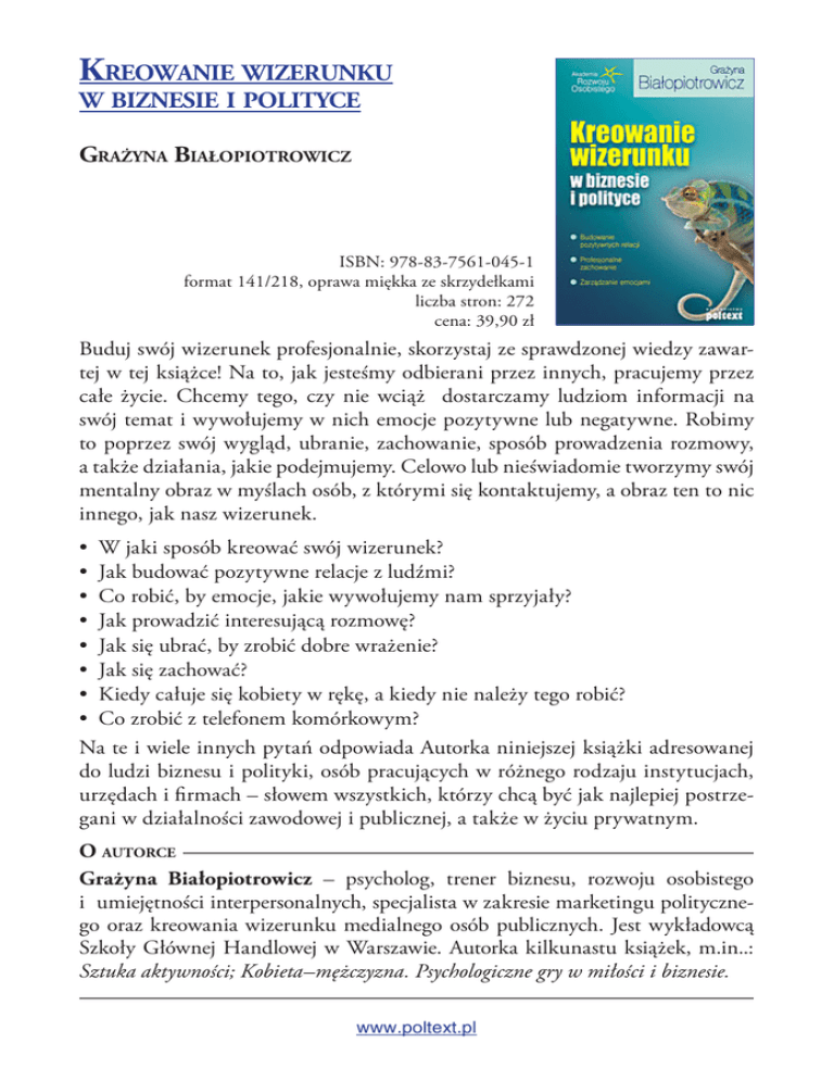 Kreowanie wizerunku w biznesie i polityce Grażyna Białopiotrowicz ISBN: 978-83-7561-045-1 format 141/218, oprawa miękka ze skrzydełkami liczba stron: 272 cena: 39,90 zł Buduj swój wizerunek profesjonalnie, skorzystaj ze sprawdzonej wiedzy zawartej w tej książce! Na to, jak jesteśmy odbierani przez innych, pracujemy przez całe życie. Chcemy tego, czy nie wciąż dostarczamy ludziom informacji na swój temat i wywołujemy w nich emocje pozytywne lub negatywne. Robimy to poprzez swój wygląd, ubranie, zachowanie, sposób prowadzenia rozmowy, a także działania, jakie podejmujemy. Celowo lub nieświadomie tworzymy swój mentalny obraz w myślach osób, z którymi się kontaktujemy, a obraz ten to nic innego, jak nasz wizerunek. • W jaki sposób kreować swój wizerunek? • Jak budować pozytywne relacje z ludźmi? • Co robić, by emocje, jakie wywołujemy nam sprzyjały? • Jak prowadzić interesującą rozmowę? • Jak się ubrać, by zrobić dobre wrażenie? • Jak się zachować? • Kiedy całuje się kobiety w rękę, a kiedy nie należy tego robić? • Co zrobić z telefonem komórkowym? Na te i wiele innych pytań odpowiada Autorka niniejszej książki adresowanej do ludzi biznesu i polityki, osób pracujących w różnego rodzaju instytucjach, urzędach i firmach – słowem wszystkich, którzy chcą być jak najlepiej postrzegani w działalności zawodowej i publicznej, a także w życiu prywatnym. O autorce Grażyna Białopiotrowicz – psycholog, trener biznesu, rozwoju osobistego i umiejętności interpersonalnych, specjalista w zakresie marketingu politycznego oraz kreowania wizerunku medialnego osób publicznych. Jest wykładowcą Szkoły Głównej Handlowej w Warszawie. Autorka kilkunastu książek, m.in..: Sztuka aktywności; Kobieta–mężczyzna. Psychologiczne gry w miłości i biznesie. www.poltext.pl Kreowanie wizerunku w biznesie i polityce SPIS TREŚCI WSTĘP . . . . . . . . . . . . . . . . . . . . . . . . . . . . . . . . . . . . . . . . . . . . . . . . ROZDZIAŁ I Co to jest wizerunek i na czym polega jego kreowanie? . . . . . . . Co składa się na wizerunek? . . . . . . . . . . . . . . . . . . . . . . . . . . . . . Prezencja, czyli jak wyglądamy?. . . . . . . . . . . . . . . . . . . . . . . . . . Zachowanie, czyli dobre maniery . . . . . . . . . . . . . . . . . . . . . . . . . Umiejętności interpersonalne, czyli sztuka budowania relacji . . . Kwalifikacje, umiejętności zawodowe i doświadczenie . . . . . . . . Sukcesy, osiągnięcia, czyli czym możemy się poszczycić? . . . . . Jakie znaczenie ma dorobek w kreowaniu pozytywnego wizerunku? Styl życia, czyli co w trawie piszczy? . . . . . . . . . . . . . . . . . . . . . . Czy szata zdobi człowieka? . . . . . . . . . . . . . . . . . . . . . . . . . . . . . . Czy nasz wygląd ma istotne znaczenie, czy też możemy się nim nie zajmować? . . . . . . . . . . . . . . . . . . . . . . . . . . . . . . . . . . . . . Czy to oznacza, że gdy zrobimy dobre pierwsze wrażenie, to już nie musimy się więcej starać? . . . . . . . . . . . . . . . . . . . . . . . . . Wizerunek pozytywny . . . . . . . . . . . . . . . . . . . . . . . . . . . . . . . . . Pozytywny wizerunek a czarny PR . . . . . . . . . . . . . . . . . . . . . . . . Do czego potrzebny jest pozytywny wizerunek?. . . . . . . . . . . . . . ROZDZIAŁ II Kreowanie wizerunku przez wygląd . . . . . . . . . . . . . . . . . . . . . . . Komunikaty niewerbalne, czyli mowa naszego ciała . . . . . . . . . . Jakie informacje można odczytać z wyglądu?. . . . . . . . . . . . . . . . Osoba zdyscyplinowana i uporządkowana . . . . . . . . . . . . . . . . Osoba chaotyczna . . . . . . . . . . . . . . . . . . . . . . . . . . . . . . . . . . . Osoba o zawyżonej samoocenie . . . . . . . . . . . . . . . . . . . . . . . . Osoba o niskiej samoocenie. . . . . . . . . . . . . . . . . . . . . . . . . . . . Osoba pogodna. . . . . . . . . . . . . . . . . . . . . . . . . . . . . . . . . . . . . . Osoba smutna, ponura, gniewna . . . . . . . . . . . . . . . . . . . . . . . . Znaczenie roli społecznej w kreowaniu wizerunku . . . . . . . . . . . . Kobiecy wizerunek, czyli jak ubrać się do pracy?. . . . . . . . . . . . . www.poltext.pl 11 15 17 18 19 20 22 24 25 26 27 29 31 33 34 36 41 41 44 45 46 46 47 47 47 49 53 Kreowanie wizerunku w biznesie i polityce Spis treści 6 Ubranie. . . . . . . . . . . . . . . . . . . . . . . . . . . . . . . . . . . . . . . . . . . . Najczęściej popełniane błędy w ubiorze . . . . . . . . . . . . . . . . Zasady doboru ubrań . . . . . . . . . . . . . . . . . . . . . . . . . . . . . . . Fryzura . . . . . . . . . . . . . . . . . . . . . . . . . . . . . . . . . . . . . . . . . . . . Rodzaj fryzury jako przekaz niewerbalny . . . . . . . . . . . . . . . Makijaż . . . . . . . . . . . . . . . . . . . . . . . . . . . . . . . . . . . . . . . . . . . Rajstopy, pończochy, skarpetki, podkolanówki . . . . . . . . . . . . . Męski wizerunek, czyli jak ubrać się do pracy? . . . . . . . . . . . . . . Fryzura . . . . . . . . . . . . . . . . . . . . . . . . . . . . . . . . . . . . . . . . . . . . Zarost . . . . . . . . . . . . . . . . . . . . . . . . . . . . . . . . . . . . . . . . . . . . . Garnitur . . . . . . . . . . . . . . . . . . . . . . . . . . . . . . . . . . . . . . . . . . . Koszula . . . . . . . . . . . . . . . . . . . . . . . . . . . . . . . . . . . . . . . . . . . Krawat i jego przekaz . . . . . . . . . . . . . . . . . . . . . . . . . . . . . . . . Skarpetki męskie . . . . . . . . . . . . . . . . . . . . . . . . . . . . . . . . . . . . Inne elementy wizerunku kobiet i mężczyzn. . . . . . . . . . . . . . . . . Płaszcz . . . . . . . . . . . . . . . . . . . . . . . . . . . . . . . . . . . . . . . . . . . . Torebki, aktówki, teczki w kreowaniu wizerunku . . . . . . . . . . Pasek do spodni . . . . . . . . . . . . . . . . . . . . . . . . . . . . . . . . . . . . . Obuwie . . . . . . . . . . . . . . . . . . . . . . . . . . . . . . .