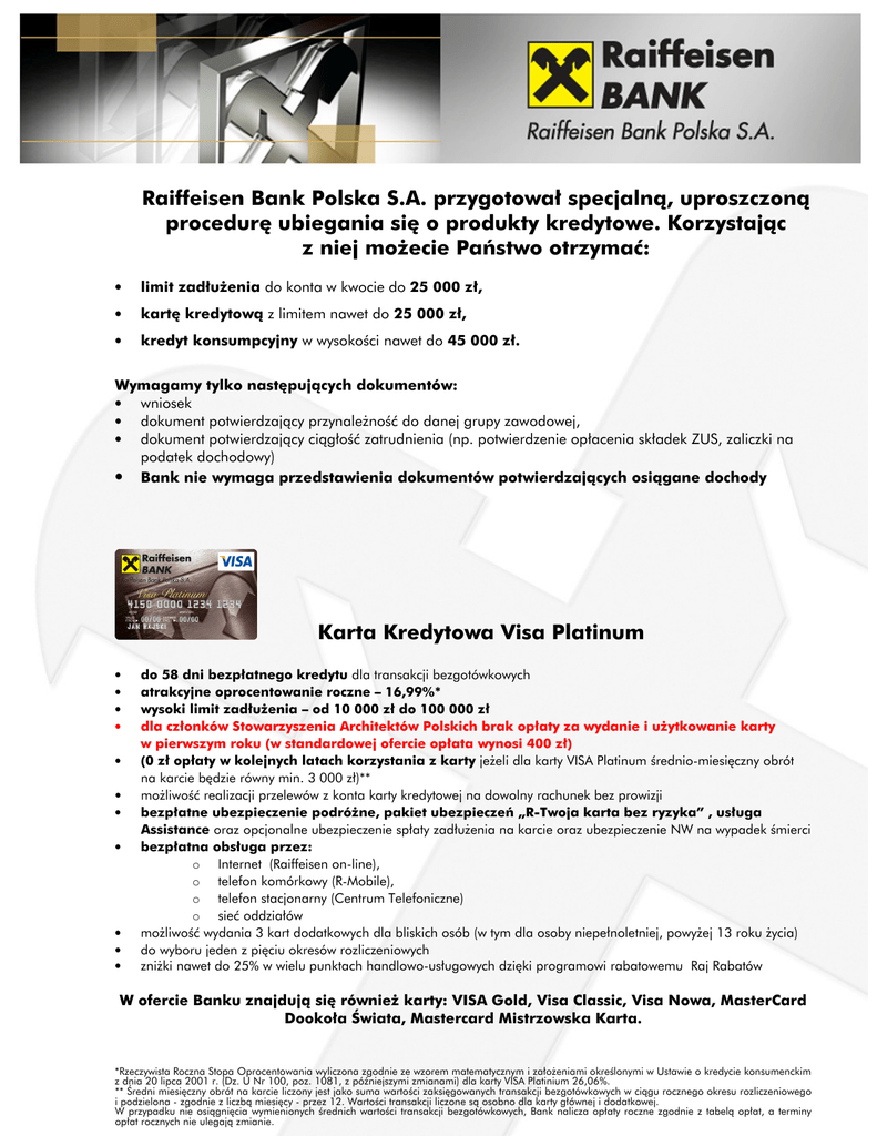 Raiffeisen Bank Polska S.A. przygotował specjalną, uproszczoną procedurę ubiegania się o produkty kredytowe. Korzystając z niej możecie Państwo otrzymać: • limit zadłużenia do konta w kwocie do 25 000 zł, • kartę kredytową z limitem nawet do 25 000 zł, • kredyt konsumpcyjny w wysokości nawet do 45 000 zł. Wymagamy tylko następujących dokumentów: • wniosek • dokument potwierdzający przynależność do danej grupy zawodowej, • dokument potwierdzający ciągłość zatrudnienia (np. potwierdzenie opłacenia składek ZUS, zaliczki na podatek dochodowy) • Bank nie wymaga przedstawienia dokumentów potwierdzających osiągane dochody Karta Kredytowa Visa Platinum • • • • • • • • • • • do 58 dni bezpłatnego kredytu dla transakcji bezgotówkowych atrakcyjne oprocentowanie roczne – 16,99%* wysoki limit zadłużenia – od 10 000 zł do 100 000 zł dla członków Stowarzyszenia Architektów Polskich brak opłaty za wydanie i użytkowanie karty w pierwszym roku (w standardowej ofercie opłata wynosi 400 zł) (0 zł opłaty w kolejnych latach korzystania z karty jeżeli dla karty VISA Platinum średnio-miesięczny obrót na karcie będzie równy min. 3 000 zł)** możliwość realizacji przelewów z konta karty kredytowej na dowolny rachunek bez prowizji bezpłatne ubezpieczenie podróżne, pakiet ubezpieczeń „R-Twoja karta bez ryzyka” , usługa Assistance oraz opcjonalne ubezpieczenie spłaty zadłużenia na karcie oraz ubezpieczenie NW na wypadek śmierci bezpłatna obsługa przez: o Internet (Raiffeisen on-line), o telefon komórkowy (R-Mobile), o telefon stacjonarny (Centrum Telefoniczne) o sieć oddziałów możliwość wydania 3 kart dodatkowych dla bliskich osób (w tym dla osoby niepełnoletniej, powyżej 13 roku życia) do wyboru jeden z pięciu okresów rozliczeniowych zniżki nawet do 25% w wielu punktach handlowo-usługowych dzięki programowi rabatowemu Raj Rabatów W ofercie Banku znajdują się również karty: VISA Gold, Visa Classic, Visa Nowa, MasterCard Dookoła Świata, Mastercard Mistrzowska Karta. *Rzeczywista Roczna Stopa Oprocentowania wyliczona zgodnie ze wzorem matematycznym i założeniami określonymi w Ustawie o kredycie konsumenckim z dnia 20 lipca 2001 r. (Dz. U Nr 100, poz. 1081, z późniejszymi zmianami) dla karty VISA Platinium 26,06%. ** Średni miesięczny obrót na karcie liczony jest jako suma wartości zaksięgowanych transakcji bezgotówkowych w ciągu rocznego okresu rozliczeniowego i podzielona - zgodnie z liczbą miesięcy - przez 12. Wartości transakcji liczone są osobno dla karty głównej i dodatkowej. W przypadku nie osiągnięcia wymienionych średnich wartości transakcji bezgotówkowych, Bank nalicza opłaty roczne zgodnie z tabelą opłat, a terminy opłat rocznych nie ulegają zmianie. Kredyt Konsumpcyjny • • • • • • • • dowolny cel kredytowania kwota kredytu - od 1 000 zł do 60 000 zł okres kredytowania – od 6 do 72 miesięcy prowizja od 0% dla członków Stowarzyszenia Architektów Polskich oprocentowanie już od 13%* (w standardowej ofercie od 14%) profesjonalna obsługa doradcza poprzez sieć mobilnych doradców klienta do kwoty 45 000 uproszczone formalności – wystarczą następujące dokumenty: o wniosek o dokument potwierdzający przynależność do danej grupy zawodowej, o dokument potwierdzający ciągłość zatrudnienia (np. potwierdzenie opłacenia składek ZUS, zaliczki na podatek dochodowy) o Bank nie wymaga przedstawienia dokumentów potwierdzających osiągane dochody brak zabezpieczeń i poręczycieli Przykładowe równe raty miesięczne dla kredytu konsumpcyjnego* Okres kredytowania Kwota kredytu wypłacana Klientowi 5 000,00 zł 8 000,00 zł 10 000,00 zł 12 000,00 zł 15 000,00 zł 20 000,00 zł 25 000,00 zł 35 000,00 zł 45 000,00 zł 6 m-cy 886,88 zł 1 419,00 zł 1 773,75 zł 2 128,50 zł 2 660,62 zł 3 547,59 zł 4 396,80 zł 6 120,57 zł 7 869,30 zł 12 m-cy 24 m-ce 36 m-cy 467,67 zł 259,47 zł 191,33 zł 889,20 zł 415,14 zł 306,13 zł 935,33 zł 518,93 zł 382,66 zł 1 122,39 zł 622,71 zł 459,19 zł 1 402,99 zł 778,39 zł 573,99 zł 1 870,65 zł 1 037,85 zł 765,32 zł 2 302,23 zł 1 260,26 zł 917,75 zł 3 189,67 zł 1 730,26 zł 1 249,27 zł 4 101,00 zł 2 224,62 zł 1 606,20 zł 48 m-cy 60 m-cy 158,23 zł 139,15 zł 253,17 zł 222,64 zł 316,46 zł 278,30 zł 379,75 zł 333,96 zł 474,69 zł 417,45 zł 632,92 zł 556,60 zł 750,19 zł 652,65 zł 1 012,98 zł 874,63 zł 1 302,40 zł 1 124,53 zł 72 m-ce 127,09 zł 203,34 zł 254,17 zł 305,01 zł 381,26 zł 508,34 zł 590,15 zł 785,31 zł 1 009,69 zł Wszystkie wartości rat zostały podane w przybliżeniu i nie mogą być podstawą jakichkolwiek roszczeń wobec Raiffeisen Bank Polska S.A. W celu uzyskania szczegółów oferty prosimy o kontakt z Doradcą Klienta: Robert Odziemczyk Regionalny Kierownik Sprzedaży tel.: 691 333 567 e-mail: [email protected] * Raty dotyczą kredytu konsumpcyjnego w ofercie dla Profesjonalistów z ubezpieczeniem w opcji podstawowej i prowizją 0%. Rzeczywista Roczna Stopa Oprocentowania dla kredytu w wysokości 10 000 zł na okres 72 miesięcy z ubezpieczeniem (opcja podstawowa), prowizją 0%, wyliczona na podstawie przepisów ustawy o kredycie konsumenckim z dnia 20 lipca 2001 r., wynosi 26,22%. .............................................................................................................................. Oferta obowiązuje do dnia: 30. 06. 2009 r. www.raiffeisen.pl ---------------------------------------------------------------------------------------------------------------------------------------------------------------------------------------Raiffeisen Bank Polska Spółka Akcyjna z siedzibą przy ul. Pięknej 20, 00-549 Warszawa wpisana do Krajowego Rejestru Sądowego, prowadzonego przez Sąd Rejonowy dla m.st. Warszawy, XII Wydział Gospodarczy pod nr KRS 14540, NIP 526-020-58-71, o opłaconym kapitale zakładowym w wysok