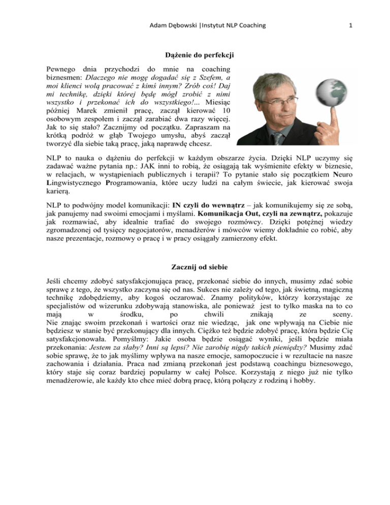 Adam Dębowski |Instytut NLP Coaching 1 Dążenie do perfekcji Pewnego dnia przychodzi do mnie na coaching biznesmen: Dlaczego nie mogę dogadać się z Szefem, a moi klienci wolą pracować z kimś innym? Zrób coś! Daj mi technikę, dzięki której będę mógł zrobić z nimi wszystko i przekonać ich do wszystkiego!... Miesiąc później Marek zmienił pracę, zaczął kierować 10 osobowym zespołem i zaczął zarabiać dwa razy więcej. Jak to się stało? Zacznijmy od początku. Zapraszam na krótką podróż w głąb Twojego umysłu, abyś zaczął tworzyć dla siebie taką pracę, jaką naprawdę chcesz. NLP to nauka o dążeniu do perfekcji w każdym obszarze życia. Dzięki NLP uczymy się zadawać ważne pytania np.: JAK inni to robią, że osiągają tak wyśmienite efekty w biznesie, w relacjach, w wystąpieniach publicznych i terapii? To pytanie stało się początkiem Neuro Lingwistycznego Programowania, które uczy ludzi na całym świecie, jak kierować swoja karierą. NLP to podwójny model komunikacji: IN czyli do wewnątrz – jak komunikujemy się ze sobą, jak panujemy nad swoimi emocjami i myślami. Komunikacja Out, czyli na zewnątrz, pokazuje jak rozmawiać, aby idealnie trafiać do swojego rozmówcy. Dzięki potężnej wiedzy zgromadzonej od tysięcy negocjatorów, menadżerów i mówców wiemy dokładnie co robić, aby nasze prezentacje, rozmowy o pracę i w pracy osiągały zamierzony efekt. Zacznij od siebie Jeśli chcemy zdobyć satysfakcjonująca pracę, przekonać siebie do innych, musimy zdać sobie sprawę z tego, że wszystko zaczyna się od nas. Sukces nie zależy od tego, jak świetną, magiczną technikę zdobędziemy, aby kogoś oczarować. Znamy polityków, którzy korzystając ze specjalistów od wizerunku zdobywają stanowiska, ale ponieważ jest to tylko maska na to co mają w środku, po chwili znikają ze sceny. Nie znając swoim przekonań i wartości oraz nie wiedząc, jak one wpływają na Ciebie nie będziesz w stanie być przekonujący dla innych. Ciężko też będzie zdobyć pracę, która będzie Cię satysfakcjonowała. Pomyślmy: Jakie osoba będzie osiągać wyniki, jeśli będzie miała przekonania: Jestem za słaby? Inni są lepsi? Nie zarobię nigdy takich pieniędzy? Musimy zdać sobie sprawę, że to jak myślimy wpływa na nasze emocje, samopoczucie i w rezultacie na nasze zachowania i działania. Praca nad zmianą przekonań jest podstawą coachingu biznesowego, który staje się coraz bardziej popularny w całej Polsce. Korzystają z niego już nie tylko menadżerowie, ale każdy kto chce mieć dobrą pracę, którą połączy z rodziną i hobby. Adam Dębowski |Instytut NLP Coaching 2 Krótki test: (Test jest stworzony na potrzeby tego artykułu, aby zaprezentować Twoje myślenie. Nie jest to pełna forma coachingu, która pozwala na kompleksowe wyszkolenie osoby) 1. Na początek zadaj sobie pytanie: Co jest dla mnie najważniejsze? Jakie są moje wartości? Zrób listę i uporządkuj od najważniejszego do najmniej ważnego 2. Jakie są moje przekonania odnośnie pracy? 3. Jaką pracę chcę mieć i jakie są moje cele? Tu zaczniesz sobie zdawać sprawę co tak naprawdę chcesz robić i dokąd zmierzasz. 4. Teraz sprawdź po kolei, czy twoje wartości i przekonania a także ich hierarchia, pozytywnie wpływają na twoje myślenie, emocje, zdrowie oraz czy pozwalają osiągać Ci twoje bliższe lub dalsze cele? Świadomość siebie, swoich celów i wartości to 50% sukcesu. Tak, aż 50%, czasami nawet więcej! Tak między nami, jest to najtrudniejsza część. Później jest już łatwiej. Gdy ułożysz wszystko co potrzebne w środku, masz gotowy fundament, aby zbudować niezwykłą budowlę, którą zobaczą inni. Gdybyśmy zbudowali przepiękny pałac ze złota i szkła, ale fundament byłby z drewna, w krótkim czasie inni zauważyliby, że jest tutaj niebezpiecznie i budunek łatwo może się zawalić. Mając silne podłoże, możesz stworzyć co tylko chcesz i trafić do ludzi, którzy z przyjemnością wejdą do tego pałacu. Jak więc budować dalej? Jeśli chcesz kogoś przekonać do siebie, czy do swojego projektu w rozmowie albo na prezentacji, zacznij od 4MAT System. Prosta metoda zapoczątkowana przez Davida Kolba, która pokazuje jak najlepiej przedstawić swoje informacje: 1. Dlaczego? - zbuduj motywację, dlaczego i po co mają Ciebie słuchać. Uzasadnij swoją wartość 2. Co? Przedstaw pełny zakres wiedzy i umiejętności. 3. Jak? Zaprezentuj jak chcesz to zrobić. Pokaż praktyczne zastosowania. 4.Co jeśli? Zbuduj wizje w przyszłości, przewidź wątpliwości i odpowiedz na pytania. Ten prosty system pozwoli Ci na precyzyjne przedstawienie siebie i swojej wiedzy w zrozumiały sposób. Cześć pierwsza Dlaczego? Jest najważniejsza, ponieważ buduje motywacje słuchacza. Aby idealnie trafić w jego potrzeby ważne są dwa elementy: Jego wartości – czyli co jest dla niego najważniejsze oraz Jego Metaprogramy – czyli sposób myślenia. Znając Metaprogramy osoby znamy jego mentalne DNA, kod dostępu do tego jak podejmuje decyzje. Przykładowo: osoba może być w Metaprogramie Ogólnym – taka osoba potrzebuje tylko ogólny obraz i wizję projektu, jeśli będzie on atrakcyjny będzie przekonany. M. Szczegółowy– tutaj musimy przekazać mnóstwo precyzyjnych danych, im więcej tym lepiej. Inny zestaw to M. OD/DO. Jeśli osoba ma M. OD oznacza, że musimy podawać argumenty dotyczące tego co może stracić, jakie mogą być przeszkody i jak nasz projekt temu zapobiegnie. Osoba z M. DO szuka tego co osiągnie dzięki projektowi, nie motywuje się strachem, ale zyskiem. Wiedząc jak osoba myśli możemy zbudować z nią idealny kontakt. Trafiamy wtedy w jej potrzeby. Aby rozpoznać Metaprogram słuchajmy tegp co i jak mówi. Obserwujmy jej zachowania. Ta wiedza jest nie do przecenienia. Ucząc się jej, zyskujemy to z czego Adam Dębowski |Instytut NLP Coaching 3 korzystają najlepsi negocjator