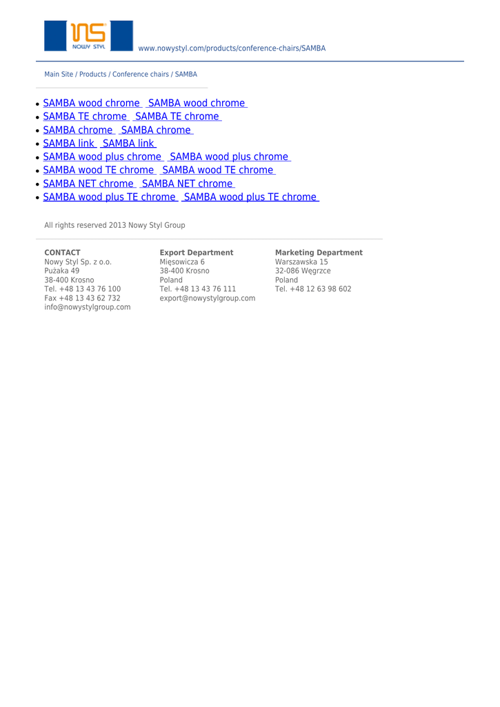 www.nowystyl.com/products/conference-chairs/SAMBA Main Site / Products / Conference chairs / SAMBA ● ● ● ● ● ● ● ● SAMBA wood chrome SAMBA wood chrome SAMBA TE chrome SAMBA TE chrome SAMBA chrome SAMBA chrome SAMBA link SAMBA link SAMBA wood plus chrome SAMBA wood plus chrome SAMBA wood TE chrome SAMBA wood TE chrome SAMBA NET chrome SAMBA NET chrome SAMBA wood plus TE chrome SAMBA wood plus TE chrome All rights reserved 2013 Nowy Styl Group CONTACT Nowy Styl Sp. z o.o. Pużaka 49 38-400 Krosno Tel. +48 13 43 76 100 Fax +48 13 43 62 732 [email protected] Export Department Mięsowicza 6 38-400 Krosno Poland Tel. +48 13 43 76 111 [email protected] Marketing Department Warszawska 15 32-086 Węgrzce Poland Tel. +48 12 63 98 602