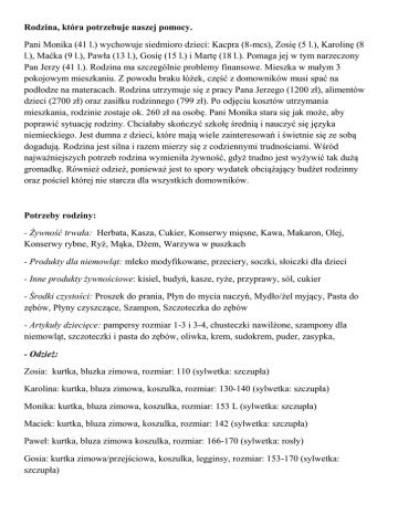 Rodzina, która potrzebuje naszej pomocy. Pani Monika (41 l.) wychowuje siedmioro dzieci: Kacpra (8-mcs), Zosię (5 l.), Karolinę (8 l.), Maćka (9 l.), Pawła (13 l.), Gosię (15 l.) i Martę (18 l.). Pomaga jej w tym narzeczony Pan Jerzy (41 l.). Rodzina ma szczególnie problemy finansowe. Mieszka w małym 3 pokojowym mieszkaniu. Z powodu braku łóżek, część z domowników musi spać na podłodze na materacach. Rodzina utrzymuje się z pracy Pana Jerzego (1200 zł), alimentów dzieci (2700 zł) oraz zasiłku rodzinnego (799 zł). Po odjęciu kosztów utrzymania mieszkania, rodzinie zostaje ok. 260 zł na osobę. Pani Monika stara się jak może, aby poprawić sytuację rodziny. Chciałaby skończyć szkołę średnią i nauczyć się języka niemieckiego. Jest dumna z dzieci, które mają wiele zainteresowań i świetnie się ze sobą dogadują. Rodzina jest silna i razem mierzy się z codziennymi trudnościami. Wśród najważniejszych potrzeb rodzina wymieniła żywność, gdyż trudno jest wyżywić tak dużą gromadkę. Również odzież, ponieważ jest to spory wydatek obciążający budżet rodzinny oraz pościel której nie starcza dla wszystkich domowników. Potrzeby rodziny: - Żywność trwała: Herbata, Kasza, Cukier, Konserwy mięsne, Kawa, Makaron, Olej, Konserwy rybne, Ryż, Mąka, Dżem, Warzywa w puszkach - Produkty dla niemowląt: mleko modyfikowane, przeciery, soczki, słoiczki dla dzieci - Inne produkty żywnościowe: kisiel, budyń, kasze, ryże, przyprawy, sól, cukier - Środki czystości: Proszek do prania, Płyn do mycia naczyń, Mydło/żel myjący, Pasta do zębów, Płyny czyszczące, Szampon, Szczoteczka do zębów - Artykuły dziecięce: pampersy rozmiar 1-3 i 3-4, chusteczki nawilżone, szampony dla niemowląt, szczoteczki i pasta do zębów, oliwka, krem, sudokrem, puder, zasypka, - Odzież: Zosia: kurtka, bluzka zimowa, rozmiar: 110 (sylwetka: szczupła) Karolina: kurtka, bluza zimowa, koszulka, rozmiar: 130-140 (sylwetka: szczupła) Monika: kurtka, bluza zimowa, koszulka, rozmiar: 153 L (sylwetka: szczupła) Maciek: kurtka, bluza zimowa, koszulka, rozmiar: 142 (sylwetka: szczupła) Paweł: kurtka, bluza zimowa koszulka, rozmiar: 166-170 (sylwetka: rosły) Gosia: kurtka zimowa/przejściowa, koszulka, legginsy, rozmiar: 153-170 (sylwetka: szczupła) Marta: kurtka zimowa/przejściowa, koszulka, legginsy, rozmiar: 153-170 (sylwetka: szczupła) Jerzy: koszula, rozmiar: XL (sylwetka: rosły) - Obuwie: Zosia: kozaki, trampki zimowe/przejściowe, ozmiar: 26/27 Karolina: kozaki zimowe, rozmiar: 32/33 Monika: kozaki zimowe, rozmiar: 36/37 Maciek: trapery zimowe, rozmiar: 34/35 Paweł: trapery zimowe, rozmiar: 41/42 Gosia: kozaki zimowe, rozmiar: 36/37 Marta: kozaki zimowe, kapcie, rozmiar: 37/38 - Pomoce szkolne: Zeszyty, Farbki, Papier kolorowy, Plecak, Bloki, Klej, Nożyczki, Przybory do pisania, Kredki, Plastelina, Piórnik. - Wyposażenie mieszkania: Kołdra, Koc, Ręczniki, Pościel, Poduszka. - Brakujące sprzęty: Mikser albo blender do robienia jedzenia dla niemowlaka. Garnki, kubeczki, miseczki dla dzieci. - Inne potrzeby: Rodzinie bardzo przydałoby sie łóżko piętrowe. - Marzenia: Maciek marzy o samochodzie zdalnie sterowanym. Zosia i Karolina ucieszyłyby się najbardziej z lalek i akcesoriów do nich. Paweł lubi gry i te na komputer i planszowe, jednak ucieszyłby się też z perfum męskich. Gosia i Marta chciałyby perfumy i kosmetyki, Pani Monika również ucieszyłaby się z perfum i rajstop. Mały Kacper zadowoliłby się zabawkami dla 8 miesięcznych dzieci, a Pan Jerzy również chciałby dostać perfumy męskie. Rzeczy, które podarujesz rodzinie powinny być dla niej prezentem. Nie muszą być one nowe, a jeśli są używane – niech będą zadbane. Paczka przygotowywana jest z myślą o drugim człowieku – jest jak prezent.