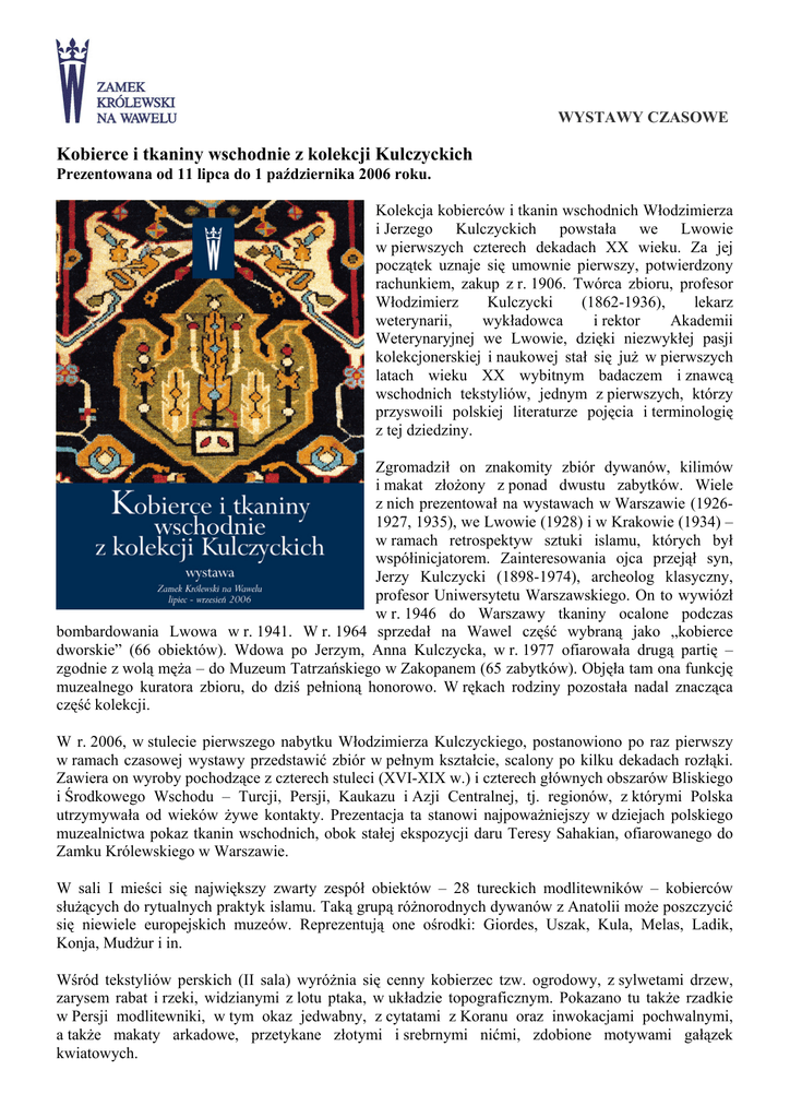 WYSTAWY CZASOWE Kobierce i tkaniny wschodnie z kolekcji Kulczyckich Prezentowana od 11 lipca do 1 października 2006 roku. Kolekcja kobierców i tkanin wschodnich Włodzimierza i Jerzego Kulczyckich powstała we Lwowie w pierwszych czterech dekadach XX wieku. Za jej początek uznaje się umownie pierwszy, potwierdzony rachunkiem, zakup z r. 1906. Twórca zbioru, profesor Włodzimierz Kulczycki (1862-1936), lekarz weterynarii, wykładowca i rektor Akademii Weterynaryjnej we Lwowie, dzięki niezwykłej pasji kolekcjonerskiej i naukowej stał się już w pierwszych latach wieku XX wybitnym badaczem i znawcą wschodnich tekstyliów, jednym z pierwszych, którzy przyswoili polskiej literaturze pojęcia i terminologię z tej dziedziny. Zgromadził on znakomity zbiór dywanów, kilimów i makat złożony z ponad dwustu zabytków. Wiele z nich prezentował na wystawach w Warszawie (19261927, 1935), we Lwowie (1928) i w Krakowie (1934) – w ramach retrospektyw sztuki islamu, których był współinicjatorem. Zainteresowania ojca przejął syn, Jerzy Kulczycki (1898-1974), archeolog klasyczny, profesor Uniwersytetu Warszawskiego. On to wywiózł w r. 1946 do Warszawy tkaniny ocalone podczas bombardowania Lwowa w r. 1941. W r. 1964 sprzedał na Wawel część wybraną jako „kobierce dworskie” (66 obiektów). Wdowa po Jerzym, Anna Kulczycka, w r. 1977 ofiarowała drugą partię – zgodnie z wolą męża – do Muzeum Tatrzańskiego w Zakopanem (65 zabytków). Objęła tam ona funkcję muzealnego kuratora zbioru, do dziś pełnioną honorowo. W rękach rodziny pozostała nadal znacząca część kolekcji. W r. 2006, w stulecie pierwszego nabytku Włodzimierza Kulczyckiego, postanowiono po raz pierwszy w ramach czasowej wystawy przedstawić zbiór w pełnym kształcie, scalony po kilku dekadach rozłąki. Zawiera on wyroby pochodzące z czterech stuleci (XVI-XIX w.) i czterech głównych obszarów Bliskiego i Środkowego Wschodu – Turcji, Persji, Kaukazu i Azji Centralnej, tj. regionów, z którymi Polska utrzymywała od wieków żywe kontakty. Prezentacja ta stanowi najpoważniejszy w dziejach polskiego muzealnictwa pokaz tkanin wschodnich, obok stałej ekspozycji daru Teresy Sahakian, ofiarowanego do Zamku Królewskiego w Warszawie. W sali I mieści się największy zwarty zespół obiektów – 28 tureckich modlitewników – kobierców służących do rytualnych praktyk islamu. Taką grupą różnorodnych dywanów z Anatolii może poszczycić się niewiele europejskich muzeów. Reprezentują one ośrodki: Giordes, Uszak, Kula, Melas, Ladik, Konja, Mudżur i in. Wśród tekstyliów perskich (II sala) wyróżnia się cenny kobierzec tzw. ogrodowy, z sylwetami drzew, zarysem rabat i rzeki, widzianymi z lotu ptaka, w układzie topograficznym. Pokazano tu także rzadkie w Persji modlitewniki, w tym okaz jedwabny, z cytatami z Koranu oraz inwokacjami pochwalnymi, a także makaty arkadowe, przetykane złotymi i srebrnymi nićmi, zdobione motywami gałązek kwiatowych. WYSTAWY CZASOWE Wyroby kaukaskie (sala IV) przyciągają barwą i sugestywnymi formami dekoracji „palmetowych” dywanów typu szirwan oraz kobierców należących do typów kazak i talisz. W grupie tkanin środkowoazjatyckich (sala III) przeważają mniejsze rozmiarami torby juczne, wykonane techniką kobierniczą o niezwykłej gęstości wiązań. Ich paleta barwna zdominowana jest przez nasyconą czerwień z domieszką fioletu, a ornamentyka operuje grą figur geometrycznych. Rarytasem tego zespołu są dwa dywany typu hotan, z pogranicza Turkiestanu i Chin, pokryte stylizowanymi wzorami roślinnymi. Ostatnie pomieszczenie (aneks) przeznaczono do wyeksponowania dokumentacji archiwalnej, związanej z twórcami i dziejami kolekcji. Koncepcja wystawy i scenariusz: Magdalena Piwocka Kurator wystawy: Magdalena Piwocka Współpraca: Magdalena Ozga Koordynacja merytoryczna: Jerzy T. Petrus – Zamek Królewski na Wawelu Koordynacja merytoryczna: Teresa Jabłońska – Muzeum Tatrzańskie im. Dra Tytusa Chałubińskiego Koordynacja prac technicznych: Stefan Zając Projekt plastyczny i nadzór nad realizacją wystawy: Triada Design: Marek Liskiewicz, Marek Suchowiak Nadzór konserwatorski: Jerzy Holc Główny sponsor wystawy: PZU S.A. Sponsorzy: Polpharma, Stacja Narciarska "Kotelnica" w Białce Tatrzańskiej, Villa Vita - Janusz Majcher Patroni medialni: What Where When, Dziennik Polski, Spotkania z Zabytkami, Dobre Wnętrze, Radio Kraków WYSTAWY CZASOWE Czaprak (fragm.), Kaukaz, w. XIX/XX, Kraków, Zamek Królewski na Wawelu Kobierzec modlitewny typu "kirman", Persja wschodnia, w. XIX, Kraków, Zamek Królewski na Wawelu WYSTAWY CZASOWE Kobierzec tzw. ogrodowy (fragm.), Persja północno-zachodnia, Kurdystan (?), w. XVIII, Kraków, Zamek Królewski na Wawelu Kobierzec tzw. ogrodowy, Persja północno-zachodnia, Kurdystan (?), w. XVIII, Kraków, Zamek Królewski na Wawelu WYSTAWY CZASOWE Kobierzec modlitewny typu "kirman", Persja wschodnia, w. XIX, Kraków, Zamek Królewski na Wawelu Makata arkadowa, Persja, w. XVII/XVIII, Kraków, Zamek Królewski na Wawelu