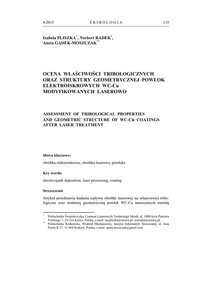 4-2015 TRIBOLOGIA 133 Izabela PLISZKA *, Norbert RADEK*, Aneta GĄDEK-MOSZCZAK ** OCENA WŁAŚCIWOŚCI TRIBOLOGICZNYCH ORAZ STRUKTURY GEOMETRYCZNEJ POWŁOK ELEKTROISKROWYCH WC-Cu MODYFIKOWANYCH LASEROWO ASSESSMENT OF TRIBOLOGICAL PROPERTIES AND GEOMETRIC STRUCTURE OF WC-Cu COATINGS AFTER LASER TREATMENT Słowa kluczowe: obróbka elektroiskrowa, obróbka laserowa, powłoka Key words: electro-spark deposition, laser processing, coating Streszczenie Artykuł przedstawia badania wpływu obróbki laserowej na właściwości tribologiczne oraz strukturę geometryczną powłok WC-Cu nanoszonych metodą * ** Politechnika Świętokrzyska, Centrum Laserowych Technologii Metali, al. 1000-lecia Państwa Polskiego 7, 25-314 Kielce, Polska, e-mail: [email protected], [email protected]. Politechnika Krakowska, Wydział Mechaniczny, Instytut Informatyki Stosowanej, al. Jana Pawła II 37, 31-864 Kraków, Polska, e-mail: [email protected]. 134 TRIBOLOGIA 4-2015 elektroiskrową. Na podstawie obserwacji badań oporów tarcia, pomiarów porowatości, odporności na korozję oraz zmian w strukturze powierzchni dokonano oceny właściwości powłok po obróbce laserowej. Docelowe badania przeprowadzono, wykorzystując elektrody WC-Cu, które wytworzono poprzez spiekanie nanostrukturalnych proszków metodą metalurgii proszków. Przeciwzużyciowe powłoki zostały naniesione elektroiskrowo na próbki ze stali C45 za pomocą urządzenia produkcji ukraińskiej, model EIL-8A, natomiast obróbkę laserową nałożonych powłok elektroiskrowych wykonano laserem Nd:YAG, model BLS 720. WPROWADZENIE Obróbki wykorzystujące skoncentrowany strumień energii stosowane są przede wszystkim przy obróbce elementów z trudnoobrabialnych tworzyw konstrukcyjnych, a także do wykonywania elementów o bardzo skomplikowanych kształtach. Wykorzystując biegunowość w obróbkach wspomaganych prądem elektrycznym, w większości przypadków można sterować przebiegiem procesu obróbki, dzięki czemu można realizować obróbkę przyrostową lub ubytkową. Obróbka elektroerozyjna ubytkowa (EDM) polega na usuwaniu zewnętrznych warstw materiału w postaci mikrocząsteczek przez działanie impulsowych wyładowań elektrycznych występujących w dielektryku między dwiema elektrodami. Obróbka elektroerozyjna przyrostowa (ESA), która w literaturze określana jest mianem obróbki elektroiskrowej wykorzystuje zjawisko erozji materiału elektrody i wyładowań iskrowych zachodzących między elektrodami, w efekcie czego tworzy się technologiczna warstwa powierzchniowa o innych właściwościach niż materiał podłoża. Podczas obróbki elektroiskrowej mamy do czynienia z transferem materii i energii oraz reakcjami: chemicznymi, elektrochemicznymi i elektrotermicznymi, które im towarzyszą. Stopowanie elektroiskrowe jest technologią obróbki powierzchniowej i cechuje się intensywnym dopływem ciepła i bardzo wąską strefą wpływu ciepła (SWC), również przy nakładaniu powłok z trudnotopliwych kompozytów [L. 1÷6]. Obróbkę elektroiskrową cechuje brak szkodliwych oddziaływań na środowisko. METODYKA BADAŃ Przedmiotem badań były powłoki nakładane elektrodą WC-Cu (o procentowym składzie 50% WC i 50% Cu) metodą elektroiskrową. Materiałem podłoża użytym w docelowych badaniach była stal węglowa konstrukcyjna wyższej jakości C45 w stanie normalizowanym. Jako gaz ochronny w tym procesie zastosowano argon. Do nanoszenia powłok elektroiskrowych użyto urządzenia produkcji ukraińskiej, model EIL-8A. Stosując zalecenia producenta urządzenia oraz własne 4-2015 TRIBOLOGIA 135 doświadczenia, ustalono następujące parametry: napięcie U = 230 V, pojemność kondensatorów C = 150 µF, natężenie prądu I = 0,7 A oraz czas nanoszenia τ = 2 min/cm2. Obróbkę laserową powłok elektroiskrowych przeprowadzono w Centrum Laserowych Technologii Metali, na laserze Nd:YAG, model BLS 720 niemieckiej firmy BAASEL LASERTECHNIK, o maksymalnej średniej mocy 150 W. Laser ten pracuje w trybie impulsowym. W badaniach zastosowano głowicę ogniskującą. Zadana wstępnie odległość między czołem dyszy a powierzchnią obrabianą utrzymywana była z dokładnością do około 0,01 mm w kierunku Z. Wiązka promieniowania laserowego posiadała mod TEM00, który określa rozkład energii promieniowania. Na podstawie analizy literatury na temat doświadczeń z przeprowadzonych prac badawczych oraz badań rozpoznawczych zostały dobrane parametry obróbki laserowej z uwzględnieniem tych parametrów, które mają decydujący wpływ na właściwości eksploatacyjne wytworzonych warstw powierzchniowych [L. 7, 8]. Obróbkę laserową wykonano przy następujących parametrach: • średnica plamki laserowej d = 0,7 mm, • moc lasera P = 50 W, 60 W, 70 W, • prędkość przesuwu próbki V = 250 mm/min, • odległość dysza – przedmiot obrabiany ∆l = 1 mm, • czas trwania impulsu ti = 0,4 ms, • częstotliwość powtarzania f = 50 Hz, • skok przesuwu wiązki S = 0,4 mm. Badania tribologiczne Badania oporów tarcia (tarcie technicznie suche) przeprowadzono na testerze tribologicznym T-01M typu trzpień–tarcza. Jako próbki stosowano pierścienie ze stali C45, na które naniesiono elektroiskrowo powłoki WC-Cu przed i po obróbce laserowej. Przeciwpróbką była kulka o średnicy φ6,3 mm wykonana ze stali 100Cr6. Do badań użyto 5 próbek z każdego wariantu powłokowego, co umożliwiło uśrednienie wyników badań. Dokładność pomiarowa wynosiła 0,1 mg. Badania na testerze przeprowadzono przy następujących parametrach tarcia: • prędkość liniowa v = 0,8 m/s, • czas próby t = 3600 s, • zakres zmian obciążenia Q = 4,9; 9,8; 14,7 N. Badania odporności na zacieranie wykonano na testerze tribologicznym T-09, w którym węzeł tarcia składa się z walca i dwóch pryzm. Jako próbki stosowano pryzmy z naniesionymi powłokami WC-Cu oraz stal C45 (nieobrobione i obrobione laserem), natomiast przeciwpróbką 