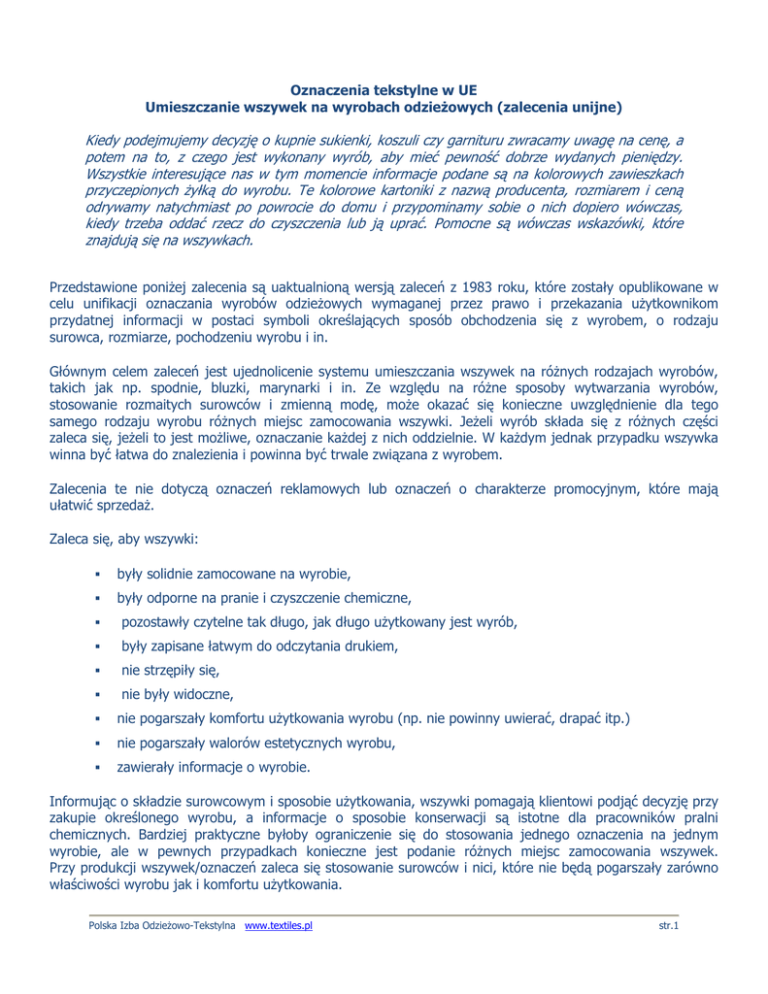 Oznaczenia tekstylne w UE Umieszczanie wszywek na wyrobach odzieŜowych (zalecenia unijne) Kiedy podejmujemy decyzję o kupnie sukienki, koszuli czy garnituru zwracamy uwagę na cenę, a potem na to, z czego jest wykonany wyrób, aby mieć pewność dobrze wydanych pieniędzy. Wszystkie interesujące nas w tym momencie informacje podane są na kolorowych zawieszkach przyczepionych Ŝyłką do wyrobu. Te kolorowe kartoniki z nazwą producenta, rozmiarem i ceną odrywamy natychmiast po powrocie do domu i przypominamy sobie o nich dopiero wówczas, kiedy trzeba oddać rzecz do czyszczenia lub ją uprać. Pomocne są wówczas wskazówki, które znajdują się na wszywkach. Przedstawione poniŜej zalecenia są uaktualnioną wersją zaleceń z 1983 roku, które zostały opublikowane w celu unifikacji oznaczania wyrobów odzieŜowych wymaganej przez prawo i przekazania uŜytkownikom przydatnej informacji w postaci symboli określających sposób obchodzenia się z wyrobem, o rodzaju surowca, rozmiarze, pochodzeniu wyrobu i in. Głównym celem zaleceń jest ujednolicenie systemu umieszczania wszywek na róŜnych rodzajach wyrobów, takich jak np. spodnie, bluzki, marynarki i in. Ze względu na róŜne sposoby wytwarzania wyrobów, stosowanie rozmaitych surowców i zmienną modę, moŜe okazać się konieczne uwzględnienie dla tego samego rodzaju wyrobu róŜnych miejsc zamocowania wszywki. JeŜeli wyrób składa się z róŜnych części zaleca się, jeŜeli to jest moŜliwe, oznaczanie kaŜdej z nich oddzielnie. W kaŜdym jednak przypadku wszywka winna być łatwa do znalezienia i powinna być trwale związana z wyrobem. Zalecenia te nie dotyczą oznaczeń reklamowych lub oznaczeń o charakterze promocyjnym, które mają ułatwić sprzedaŜ. Zaleca się, aby wszywki: były solidnie zamocowane na wyrobie, były odporne na pranie i czyszczenie chemiczne, pozostawły czytelne tak długo, jak długo uŜytkowany jest wyrób, były zapisane łatwym do odczytania drukiem, nie strzępiły się, nie były widoczne, nie pogarszały komfortu uŜytkowania wyrobu (np. nie powinny uwierać, drapać itp.) nie pogarszały walorów estetycznych wyrobu, zawierały informacje o wyrobie. Informując o składzie surowcowym i sposobie uŜytkowania, wszywki pomagają klientowi podjąć decyzję przy zakupie określonego wyrobu, a informacje o sposobie konserwacji są istotne dla pracowników pralni chemicznych. Bardziej praktyczne byłoby ograniczenie się do stosowania jednego oznaczenia na jednym wyrobie, ale w pewnych przypadkach konieczne jest podanie róŜnych miejsc zamocowania wszywek. Przy produkcji wszywek/oznaczeń zaleca się stosowanie surowców i nici, które nie będą pogarszały zarówno właściwości wyrobu jak i komfortu uŜytkowania. Polska Izba OdzieŜowo-Tekstylna www.textiles.pl str.1 Zalecane miejsca wszywania oznaczeń * *Wszystkie wszywki powinny znajdować się na wewnętrznej stronie wyrobu, za wyjątkiem spodni dŜinsowych, gdzie wszywka znajduje się w widocznym miejscu na zewnątrz Wyrób Miejsce wszycia Alternatywne umieszczenie płaszcze/kurtki/ Ŝakiety damskie na wysokości klatki piersiowej po lewej stronie na wysokości klatki piersiowej po lewej stronie przód lewej strony/szew na lewej stronie marynarki kamizelki na wewnętrznej kieszonce przód lewej strony suknie/bluzki szew po lewej stronie u dołu wyrobu fartuchy, kitle góra tyłu na środku szew na lewej stronie u dołu wyrobu lub na prawej szlufce dŜinsy/spodnie prawa tylna kieszeń lub góra tyłu na poziomie talii na zewnątrz wyrobu dla dŜinsów – przy zapięciu kombinezony/ ubrania robocze góra tyłu, na środku szew po lewej stronie spódnice góra tyłu (w pasku) góra tyłu, na środku szew po lewej stronie u dołu wyrobu pulowery/swetry/ bluzy/T-shirty góra tyłu (wewnętrzna strona kołnierzyka, na środku) szew po lewej stronie u dołu wyrobu wyroby niemowlęce szew po lewej stronie szew na lewym ramieniu; w przypadku kaftaników góra, zewnętrzny szew odzieŜ sportowa i gimnastyczna góra tyłu, na środku szew po lewej stronie ubiory narciarskie/kurtki góra tyłu, na środku wyroby dwustronne: w lewej kieszeni szlafroki/płaszcze kąpielowe/podomki góra tyłu, na środku szew na lewej stronie piŜamy/koszule nocne góra tyłu, na środku szew po lewej stronie u dołu wyrobu (z wyjątkiem spodni) stroje kąpielowe szew na lewej stronie, góra szew po lewej stronie u dołu wyrobu gorsety/biustonosze/ elastyczne majtki bielizna/majtki/ rajstopy/podwiązki z tyłu, lewa część wyrobu, dolny brzeg / na górze tyłu po środku szew po lewej stronie góra tyłu, na środku szew po lewej stronie bielizna/spodenki kąpielowe szew po lewej stronie wyroby pończosznicze/ skarpetki informacje na opakowaniu krawaty z tyłu, po wewnętrznej stronie etole i chusty/szale w rogu rękawiczki na lewej rękawiczce kapelusze/czapki wewnątrz wyrobu bluzki Polska Izba OdzieŜowo-Tekstylna www.textiles.pl szew po lewej stronie u dołu wyrobu środek tyłu dekoltu od wewnątrz nadruki str.2