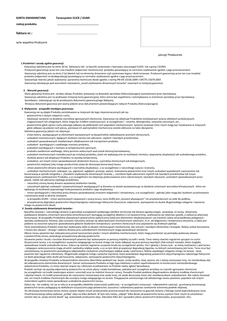 KARTA GWARANCYJNA Tarassystem CLICK / GUMI rodzaj produktu ………………………………………………… faktura nr.: …………………………………………………. w/w wypełnia Producent pieczęć Producenta 1.Przedmiot i zasady ogólne gwarancji: Gwarancja udzielana jest na okres 10 lat (dziesięciu lat) na łączniki systemowe z tworzywa sztucznego( CLICK) lub z gumy ( GUMI) . Producent gwarantuje przez ten czas trwałość (odporność mechaniczna) produktu pozwalającą na normalne użytkowanie zgodne z jego przeznaczeniem. Gwarancja udzielana jest na okres 2 lat (dwóch lat) na elementy drewniane czyli systemowe legary i deski tarasowe .Producent gwarantuje przez ten czas trwałość produktu (odporność na biodegradację) pozwalającą na normalne użytkowanie zgodne z jego przeznaczeniem . Gwarantuje również jakość wykonania i parametry techniczne desek zgodne z normą PN-EN 13226:2009 i CNT/TS 15679:2007. Gwarancja obowiązuje pod warunkiem stosowania „zasad użytkowania drewnianych tarasów” zawartych w niniejszej gwarancji. 2. Warunki gwarancji: Okres gwarancji liczony jest od daty zakupu Produktu wskazanej na dowodzie sprzedaży (faktura/paragon) wystawionym przez Sprzedawcę. Gwarancja udzielona jest na podstawie niniejszej karty gwarancyjnej, która winna być wypełniona i ostemplowana w momencie sprzedaży przez Sprzedawcę . Sprzedawca zobowiązuje się do przekazania dokumentu gwarancyjnego Nabywcy. Niniejszy dokument gwarancji jest ważny jedynie wraz dokumentem potwierdzającym nabycie Produktu (faktura/paragon). 3. Wyłączenia - przypadki nieobjęte gwarancja: Gwarancją nie są objęte Produkty zainstalowane w miejscach do tego nieprzeznaczonych jak np.: - powierzchnie o dużym natężeniu ruchu, - lokalizacje narażone na działanie czynników agresywnych chemicznie, Gwarancja nie obejmuje Produktów instalowanych w/przy obiektach produkcyjnych, magazynowych lub usługowych, które mogą być źródłem zanieczyszczeń, w szczególności – smarów, detergentów, nawozów sztucznych, etc., - powierzchnie gdzie oprócz ruchu pieszego odbywa się jakikolwiek ruch pojazdami mechanicznymi. Systemy tarasowe Click i Gumi mogą być instalowane w miejscach gdzie odbywa się jedynie ruch pieszy, ponieważ ich wytrzymałość mechaniczna została obliczona na takie obciążenie. Udzielona gwarancja jakości nie obejmuje: - zmian koloru, występujących w elementach wystawionych na bezpośrednie oddziaływanie promieni słonecznych, - uszkodzeń mechanicznych, będących skutkiem nacisku lub uderzenia ciężkich i twardych przedmiotów - uszkodzeń spowodowanych niewłaściwym składowaniem lub transportem produktu - uszkodzeń wynikających z wadliwego montażu produktu, - uszkodzeń wynikających z montażu w temperaturach ujemnych, - produktu ewidentnie wadliwego, który pomimo widocznych wad został ułożony/zainstalowany, - uszkodzeń mechanicznych niewidocznych po instalacji produktu, jeżeli nie wpływają one na możliwość montażu i poprawnej eksploatacji tak uszkodzonego produktu, - skutków pożaru lub ekspozycji Produktu na wysoką temperaturę, - uszkodzeń, ani innych zmian spowodowanych działaniem tłuszczu, czynników chemicznych lub biologicznych, - powierzchni olejowej (olej innego producenta) użytej do okresowej konserwacji tarasu - zmian powierzchni drewna wynikających z normalnej eksploatacji , a w szczególności z naturalnego zużycia i ścierania, - uszkodzeń mechanicznych, zadrapań, rys, wgnieceń, wgłębień, przecięć, wytarć, matowienia powierzchni oraz innych uszkodzeń wywołanych czyszczeniem lub konserwacją w sposób niezgodny z „Zasadami użytkowania drewnianych tarasów „, naciskiem bądź uderzeniem ciężkich lub twardych przedmiotów lub innym niepoprawnym użytkowaniem Produktu, a w szczególności nie obejmuje podziurawienia ostro zakończonymi, twardymi obcasami, uszkodzeń spowodowanych przez piasek, meble lub uderzenia ciężkiego przedmiotu, - naturalnej zmiany barwy drewna wywołanej działaniem światła, - naturalnych pęknięć czołowych i powierzchniowych występujących w drewnie na skutek wystawienia go na działanie zmiennych warunków klimatycznych, które nie wpływają na możliwość poprawnego funkcjonowania produktu i jego eksploatacji, - zmian wynikających z naturalnej pracy drewna spowodowanej zmianami wilgotności i temperatury, a w szczególności - pęknięć jakie mogą być skutkiem szczelinowania i zamarzania wody w okresie zimowym, - w przypadku GUMI – zmian wymiarowych związanych z pracą tarasu, taras GUMI jest „tarasem pływającym” nie przytwierdzonym na stałe do podłoża, - przyspieszonej degradacji powierzchni oleju/impregnatu nałożonego fabrycznie (łuszczenie, odparzanie, wymywanie) na skutek długotrwałego zalegania i topnienia śniegu na powierzchni desek. 4 Zasady użytkowania drewnianych tarasów : Specyfika tarasów z naturalnego drewna (z gatunków europejskich poddanego obróbce termicznej lub drewna egzotycznego), powoduje, że tarasy drewniane, poddawane działaniu zmiennych warunków atmosferycznych wymagają szczególnej dbałości o ich powierzchnię, użytkowania we właściwy sposób, a zwłaszcza właściwej konserwacji. W przypadku Produktów olejowanych powierzchnia wykończenia (olej) jest elementem eksploatacyjnym i jej trwałość zależy od prawidłowej pielęgnacji i sposobu użytkowania. Drewno, jako surowiec naturalny cechuje się właściwościami mechanicznymi zależnymi, m.in. od wilgotności i temperatury otoczenia, a także jest podatne na starzenie optyczne spowodowane głównie działaniem temperatury i promieni słonecznych oraz pojawianie się drobnych pęknięć. Taras (zainstalowany Produkt) może być użytkowany tylko w obuwiu nieniszczącym mechanicznie, bez ostrych i twardych elementów i krawędzi. Należy unikać korzystania z tarasu bez obuwia – drzazgi i zadziory drewna przy uszkodzeniach mech