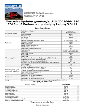 Cena katalogowa: 111 315 PLN Dopłata za lakier: Nie wybrano koloru lakieru Wyposażenie dod.:Nie wybrano Cena końcowa: 111 315 PLN Mercedes Sprinter generacja: 310 CDI 2006- 310 CDI Euro5 Podwozie z podwójną kabiną 3,5t L1 Dane Techniczne Informacje ogólne Nadwozie Układ napędowy Dane eksploatacyjne diesel (olej napędowy) Gwarancja Uwagi Rodzaj samochodu dostawczy Klasa Dostawczy MCV Rok modelowy 2013 Rok produkcji 2013 Nadwozie RAMA Liczba drzwi 4 Długość/Szerokość/Wysokość [mm] 5 305/ 1 990/ 2 385 Masa własna [kg] 1 815 Ładowność [kg] 1 665 Liczba miejsc siedzących 6 Rozstaw osi w [mm] 3 250 Minimalna średnica skrętu [m] 12 Rodzaj silnika diesel z doładowaniem Typ paliwa diesel (olej napędowy) Pojemność [cm3] 2 143 Moc w [KM] 95 Moc w [kW] 70 Prędkość obr. dla maksymalnej mocy - od [obr./min] 3 800 Maksymalny moment obrotowy [Nm] 240 Maksymalny moment obrotowy [kGm] 25 Prędkość obr. dla maksymalnego momentu obr [obr./min] 1 400 - 2 400 Typ napędu tył Skrzynia biegów manualna, liczba biegów 6 Zużycie paliwa cykl miejski [l/100km] 11.3 Zużycie paliwa cykl mieszany [l/100km] 8.9 Zużycie paliwa cykl pozamiejski [l/100km] 7.5 Pojemność zbiornika paliwa [l] 75 Emisja CO2 [g/km] 235 Gwarancja na silnik i podzespoły 2 lata Gwarancja na lakier 2 lata Gwarancja na perforację nadwozia 12 lat Załączone zdjęcie przedstawia wersje skrzyniową z podwójną kabiną. Kolorystyka nadwozia Nazwa koloru Cena(PLN) 0 PLN 0 PLN 0 PLN 0 PLN 0 PLN 0 PLN 0 PLN 4442 PLN 4442 PLN 4442 PLN 4442 PLN biel arktyczna błękit anemonu błękit stalowy czerwień hibiskusa czerwień welwetowa zieleń morska źółty kalcytowy błękit jaspisu metalik czerń węgla metalik czerwień bursztynowa metalik srebrny brylantowy metalik Wyposażenie standardowe Nazwa elementu akumulator 12V/72Ah alternator 14V/90A asystent hamowania (BAS) boczne listwy ochronne centralny zamek sterowany falami radiowymi dwudrożne głośniki z przodu filtr cząstek stałych filtr paliwa z separatorem wody hamulce tarczowe na przedniej i tylnej osi immobiliser instalacja elektryczna 12V kierunkowskazy boczne w obudowach lusterek zewnętrznych koło zapasowe kontrolka informująca o awarii oświetlenia pojazdu kontrolka informująca o braku płynu w spryskiwaczu lusterka zewnętrzne regulowane mechanicznie z dodatkowymi lusterkami szerokokątnymi ławka czteroosobowa ze schowkiem w przedziale pasażerskim mocowanie koła zapasowego na końcu ramy napinacze pasów bezpieczeństwa dla przednich foteli narzędzia ogumienie 235/65 R16 C ogumienie letnie osłony przeciwsłoneczne kierowcy i pasażera poduszka powietrzna kierowcy półka nad przednią szybą przygotowanie do montażu modułu PSM przygotowanie do montażu radia reflektory z przezroczystymi szkłami regulacja zasięgu reflektorów resor piórowy poprzeczny z przodu resory tylne paraboliczne schowki na desce rozdzielczej siedzenie kierowcy w pełni regulowane stabilizator osi przedniej system stabilizacji toru jazdy ADAPTIVE ESP szyby przednie sterowane elektrycznie tapicerka materiałowa czarna "Brasao" trzypunktowe pasy bezpieczeństwa (dla wszystkich miejsc) układ hamulcowy hydrauliczny dwuobwodowy układ hamulcowy wyposażony w układy ABS i EBV wieszak w przestrzeni pasażerskiej wspomaganie układu kierowniczego wyłącznik główny napięcia zagłówek regulowany dla siedzenia kierowcy i pasażera zderzak przedni ze zintegrowanym stopniem złącze rozruchowe (dodatkowy biegun dodatni) Wyposażenie dodatkowe Lista wyposażenia dodatkowego [A50] oś przednia wzmocniona [BE2] składana dźwignia hamulca ręcznego [C17] resory tylne obniżające wysokość krawędzi ramy [C21] resory tylne dwustopniowe [C33] wzmocnione resory tylne [C42] stabilizator tylnej osi pod ramą [C43] wzmocniony stabilizator tylej osi pod ramą [C45] wzmocniony stabilizator przedniej osi [C47] amortyzatory wzmocnione [C57] boczne belki przeciw najazdowe [C71] belka przeciw najazdowa tylna [C72] zderzaki do lakierowania [C94] rezygnacja z zderzaka przedniego [CF2] Pakiet A [CF3] Pakiet B [CF4] Pakiet C [CF5] Pakiet D [CL1] regulowana kolumna kierownicy w dwóch płaszczyznach [CL4] kierownica wielofunkcyjna z komputerem pokładowym [CM9] boczne listwy ochronne białe [CT1] tłumiki drgań [E07] asystent ruszania Cena 920 PLN 180 PLN 677 PLN 493 PLN 493 PLN 606 PLN 737 PLN 451 PLN 363 PLN 1068 PLN 571 PLN 758 PLN -102 PLN 1057 PLN 1991 PLN 1857 PLN 2477 PLN 405 PLN 1307 PLN 499 PLN 293 PLN 325 PLN [E28] akumulator dodatkowy [E36] przekaźnik oddzielający przy dodatkowym akumulatorze [E43] gniazdo wtykowe przyczepy, 13 stykowe [E46] gniazdo elektryczne 12V [E57] przygotowanie do montażu gniazda do haka holowniczego [ED3] antena sieci GSM, GPS, UMTS [ED4] akumulator AGM 12V 95Ah [ED5] parametrowany moduł specjalny [EE8] akumulator 12V/100Ah [EH4] zestaw głośnomówiący komfortowy [ET5] zestaw głośnomówiący standardowy [EV3] przygotowanie do montażu platformy załadunkowej [EV9] przygotowanie do podłączenia urządzeń przenośnych [F35] okno w tylnej ścianie kabiny [F46] spryskiwacze reflektorów [F49] ogrzewana szyba przednia [F61] lusterko wsteczne wewnętrzne [F66] schowek zamykany [FF8] wneka 1-DIN z przodu w podsufitce [FJ1] pokrywa schowka na środku deski rozdzielczej [FK1] osłona chłodnicy lakierowana na kolor (MB 9678) [FK3] atrapa chłodnicy chromowana [FR7] przygotowanie elektryczne do pomocy cofania [FR9] przygotowanie do montażu kamery cofania wraz z montażem [FY1] alarm antywłamaniowy EDW II, syrena z akumulatora [FY7] kluczyk z trzema przyciskami [FZ4] alarm antywłamaniowy EDW II [FZ5] alarm antywłamaniowy [FZ8] komfortowe otwieranie i zamykanie pilotem [FZ9] dwa dodatkowe klucze do pojazdu [G40] automatyczna skrzynia biegów [GK4] przygotowanie do montażu chłodnicy oleju skrzyni biegów [H04] izolacja cieplna przestrzeni kierowcy [H12] dodatkowe ogrzewanie wodne [H15] ogrzewanie siedzenia pasażera [H16] ogrzewanie siedzenia kierowc