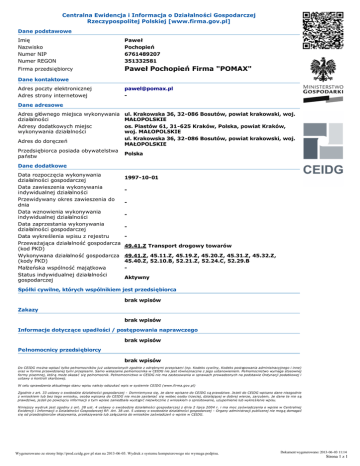 Centralna Ewidencja i Informacja o Działalności Gospodarczej Rzeczypospolitej Polskiej [www.firma.gov.pl] Dane podstawowe Imię Nazwisko Numer NIP Numer REGON Paweł Pochopień 6761489207 351332581 Firma przedsiębiorcy Paweł Pochopień Firma "POMAX" Dane kontaktowe Adres poczty elektronicznej Adres strony internetowej [email protected] Dane adresowe Adres głównego miejsca wykonywania działalności Adresy dodatkowych miejsc wykonywania działalności Adres do doręczeń ul. Krakowska 36, 32086 Bosutów, powiat krakowski, woj. MAŁOPOLSKIE os. Piastów 61, 31625 Kraków, Polska, powiat Kraków, woj. MAŁOPOLSKIE ul. Krakowska 36, 32086 Bosutów, powiat krakowski, woj. MAŁOPOLSKIE Przedsiębiorca posiada obywatelstwa Polska państw Dane dodatkowe Data rozpoczęcia wykonywania działalności gospodarczej Data zawieszenia wykonywania indywidualnej działalności Przewidywany okres zawieszenia do dnia Data wznowienia wykonywania indywidualnej działalności Data zaprzestania wykonywania działalności gospodarczej Data wykreślenia wpisu z rejestru Przeważająca działalność gospodarcza (kod PKD) Wykonywana działalność gospodarcza (kody PKD) Małżeńska wspólność majątkowa Status indywidualnej działalności gospodarczej 19971001 49.41.Z Transport drogowy towarów 49.41.Z, 45.11.Z, 45.19.Z, 45.20.Z, 45.31.Z, 45.32.Z, 45.40.Z, 52.10.B, 52.21.Z, 52.24.C, 52.29.B Aktywny Spółki cywilne, których wspólnikiem jest przedsiębiorca brak wpisów Zakazy brak wpisów Informacje dotyczące upadłości / postępowania naprawczego brak wpisów Pełnomocnicy przedsiębiorcy brak wpisów Do CEIDG mo żna wpisać tylko pełnomocników ju ż ustanowionych zgodnie z odrębnymi przepisami (np. Kodeks cywilny, Kodeks post ępowania administracyjnego i inne) oraz w formie przewidzianej tymi przepisami. Samo wskazanie pe łnomocnika w CEIDG nie jest równoznaczne z jego ustanowieniem. Pe łnomocnictwo wymaga stosownej formy pisemnej, któr ą może okazać si ę pełnomocnik. Pe łnomocnictwo w CEIDG nie ma zastosowania w sprawach prowadzonych na podstawie Ordynacji podatkowej i ustawy o kontroli skarbowej. W celu sprawdzenia aktualnego stanu wpisu nale ży odszukać wpis w systemie CEIDG (www.firma.gov.pl) Zgodnie z art. 33 ustawy o swobodzie dzia łalności gospodarczej Domniemywa się, że dane wpisane do CEIDG s ą prawdziwe. Je żeli do CEIDG wpisano dane niezgodnie z wnioskiem lub bez tego wniosku, osoba wpisana do CEIDG nie mo że zas łaniać si ę wobec osoby trzeciej, dzia łającej w dobrej wierze, zarzutem, że dane te nie s ą prawdziwe, je żeli po powzięciu informacji o tym wpisie zaniedba ła wyst ąpi ć niezwłocznie z wnioskiem o sprostowanie, uzupe łnienie lub wykreślenie wpisu. Niniejszy wydruk jest zgodny z art. 38 ust. 4 ustawy o swobodzie dzia łalności gospodarczej z dnia 2 lipca 2004 r. i ma moc za świadczenia o wpisie w Centralnej Ewidencji i Informacji o Dzia łalności Gospodarczej RP. Art. 38 ust. 5 ustawy o swobodzie dzia łalności gospodarczej Organy administracji publicznej nie mog ą domagać si ę od przedsiębiorców okazywania, przekazywania lub załączania do wniosków zaświadczeń o wpisie w CEIDG. Wygenerowano ze strony http://prod.ceidg.gov.pl stan na 20130603. Wydruk z systemu komputerowego nie wymaga podpisu. Dokument wygenerowano: 20130603 11:14 Strona 1 z 1