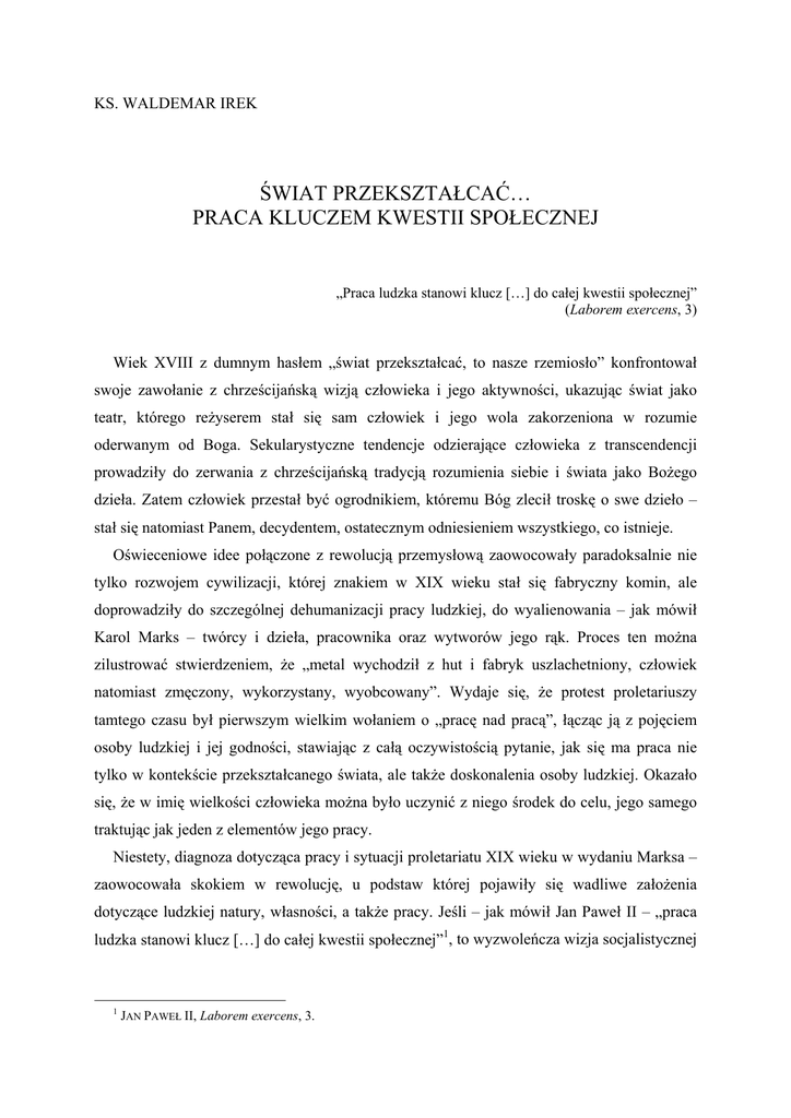 KS. WALDEMAR IREK ŚWIAT PRZEKSZTAŁCAĆ… PRACA KLUCZEM KWESTII SPOŁECZNEJ „Praca ludzka stanowi klucz […] do całej kwestii społecznej” (Laborem exercens, 3) Wiek XVIII z dumnym hasłem „świat przekształcać, to nasze rzemiosło” konfrontował swoje zawołanie z chrześcijańską wizją człowieka i jego aktywności, ukazując świat jako teatr, którego reżyserem stał się sam człowiek i jego wola zakorzeniona w rozumie oderwanym od Boga. Sekularystyczne tendencje odzierające człowieka z transcendencji prowadziły do zerwania z chrześcijańską tradycją rozumienia siebie i świata jako Bożego dzieła. Zatem człowiek przestał być ogrodnikiem, któremu Bóg zlecił troskę o swe dzieło – stał się natomiast Panem, decydentem, ostatecznym odniesieniem wszystkiego, co istnieje. Oświeceniowe idee połączone z rewolucją przemysłową zaowocowały paradoksalnie nie tylko rozwojem cywilizacji, której znakiem w XIX wieku stał się fabryczny komin, ale doprowadziły do szczególnej dehumanizacji pracy ludzkiej, do wyalienowania – jak mówił Karol Marks – twórcy i dzieła, pracownika oraz wytworów jego rąk. Proces ten można zilustrować stwierdzeniem, że „metal wychodził z hut i fabryk uszlachetniony, człowiek natomiast zmęczony, wykorzystany, wyobcowany”. Wydaje się, że protest proletariuszy tamtego czasu był pierwszym wielkim wołaniem o „pracę nad pracą”, łącząc ją z pojęciem osoby ludzkiej i jej godności, stawiając z całą oczywistością pytanie, jak się ma praca nie tylko w kontekście przekształcanego świata, ale także doskonalenia osoby ludzkiej. Okazało się, że w imię wielkości człowieka można było uczynić z niego środek do celu, jego samego traktując jak jeden z elementów jego pracy. Niestety, diagnoza dotycząca pracy i sytuacji proletariatu XIX wieku w wydaniu Marksa – zaowocowała skokiem w rewolucję, u podstaw której pojawiły się wadliwe założenia dotyczące ludzkiej natury, własności, a także pracy. Jeśli – jak mówił Jan Paweł II – „praca ludzka stanowi klucz […] do całej kwestii społecznej”1, to wyzwoleńcza wizja socjalistycznej 1 JAN PAWEŁ II, Laborem exercens, 3. koncepcji pracy stanowi w tym względzie błąd antropologiczny2. Człowiek przestał być celem samym w sobie, podmiotem, ale właśnie w kontekście pracy – kwestionując Boga, jako instancję zabezpieczającą „inność” człowieka – postrzegano go jak przedmiot, jeden z elementów procesu produkcyjnego świata. Tradycja judeo-chrześcijańska odnajduje w Biblii prawdy, pozwalające zbudować wizję poprawnych odniesień człowieka do świata oraz aktywność, jaką jest praca. Człowiek stworzony przez Boga na Jego obraz i podobieństwo (Rdz 1,27), został powołany do tego, by czynił sobie ziemię poddaną, by ją uprawiał i żeby jej doglądał (Rdz 2,15). Sam człowiek decyduje o tym, w jaki sposób wypełni swe zadanie. Zadanie panowania ma znaczenie całkowicie pozytywne. Człowieka porównuje się z księciem, na którym spoczywa odpowiedzialność za całość oraz za przyszłość terytorium, nad którym sprawuje władzę. Panowanie nie upoważnia go do stosowania pomocy, lecz zobowiązuje do służby i troski3. Człowiek ma więc zapanować nad ziemią i doskonalić ją przez swoją pracę, uczestnicząc niejako w ten sposób w dziele stworzenia. Człowiek osadzony w ogrodzie Eden otrzymał zadania uprawiania ziemi. W tych nakazach wyraźnie zawiera się stwórcza funkcja pracy człowieka. Praca jest upodobnieniem człowieka do Boga poprzez domenę stwórczego działania. Bóg polecił człowiekowi zdobywać wszechświat, uprawiać go i udoskonalać. Ziemia oczekuje ludzkiej pracy. Człowiek ma ją wziąć w posiadanie oraz przekształcać. Bóg w naturze człowieka złożył dyspozycje i siły, aktywizujące się poprzez działanie. Człowiek kontynuuje akt stwórczy, nie jest biernym przedmiotem Bożego działania i Opatrzności, ale aktywnym podmiotem. Jego rozumny i wolny podmiot ma włączyć się w akty stwórcze i aktywnie współdziałać z Bogiem. Człowiek, stworzony na obraz Boga, przez swoją pracę uczestniczy w dziele swego Stwórcy i na miarę swoich ludzkich możliwości dalej poniekąd próbuje je rozwijać i dopełniać, postępując wciąż naprzód w odsłanianiu ukrytych w całym stworzeniu zasobów i wartości. Bóg, jakby świadomie, ze względu na człowieka „nie dokończył” dzieła stworzenia. Wprawdzie sam zasadził ogród w Eden na wschodzie (Rdz 2,8), następnie wziął człowieka i umieścił go w ogrodzie Eden, aby uprawiał go i doglądał (Rdz 2,15). Zasadzony przez Boga świat staje się w pełni sobą dopiero wówczas, gdy doznaje uczłowieczenia dzięki uprawianiu i doglądaniu go przez tego, którego Stwórca zechciał uczynić współpracownikiem swoich zamiarów. Wszelka ludzka praca jest więc już u swych 2 A. ZWOLIŃSKI, „Laborem exercens” jako encyklika o błędzie antropologicznym, w: Praca kluczem polityki społecznej, red. J. MAZUR, Lublin 2007, s. 84n. 3 K. LEHMANN, Stworzoność człowieka podstawą jego odpowiedzialności za ziemię, „Communio” (1992) nr 6, s. 52. korzeni współpracą z Bogiem oraz pomocą, której Bóg niejako potrzebuje, by świat, a w nim przede wszystkim człowiek uzyskał przeznaczoną mu pełnię i piękno. Najważniejszym warunkiem doskonałości ziemskiego stworzenia jest, by był on owocem współdziałania Boga i człowieka4. Przedłużać działanie Stwórcy – oto podstawowe znaczenia działania człowieka we wszechświecie5. Człowiek wykonuje swą pracę z mandatu Bożego, lecz nie jest to zadanie pracy przymusowej. Ludzkość musi pracować, gdyż sama przestrzeń życiowa, powierzona jej przez Stwórcę, tego wymaga. Praca, do której należy przede wszystkim uprawianie i doglądanie roli, ma swe osobliwe znaczenie. Funkcję pracy omawiają dokumenty II Soboru Watykańskiego. Konstytucja Ga