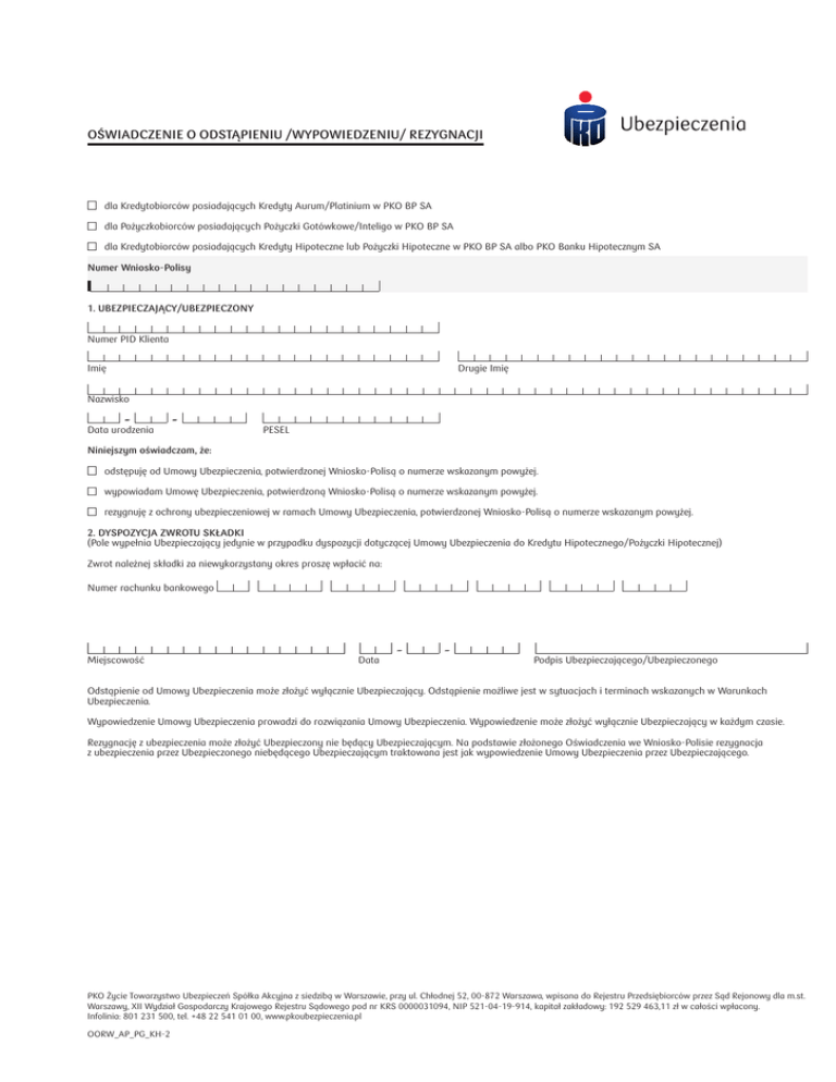 OŚWIADCZENIE O ODSTĄPIENIU /WYPOWIEDZENIU/ REZYGNACJI dla Kredytobiorców posiadających Kredyty Aurum/Platinium w PKO BP SA dla Pożyczkobiorców posiadających Pożyczki Gotówkowe/Inteligo w PKO BP SA dla Kredytobiorców posiadających Kredyty Hipoteczne lub Pożyczki Hipoteczne w PKO BP SA albo PKO Banku Hipotecznym SA Numer Wniosko-Polisy 1. UBEZPIECZAJĄCY/UBEZPIECZONY Numer PID Klienta Imię Drugie Imię Nazwisko – Data urodzenia – PESEL Niniejszym oświadczam, że: odstępuję od Umowy Ubezpieczenia, potwierdzonej Wniosko-Polisą o numerze wskazanym powyżej. wypowiadam Umowę Ubezpieczenia, potwierdzoną Wniosko-Polisą o numerze wskazanym powyżej. rezygnuję z ochrony ubezpieczeniowej w ramach Umowy Ubezpieczenia, potwierdzonej Wniosko-Polisą o numerze wskazanym powyżej. 2. DYSPOZYCJA ZWROTU SKŁADKI (Pole wypełnia Ubezpieczający jedynie w przypadku dyspozycji dotyczącej Umowy Ubezpieczenia do Kredytu Hipotecznego/Pożyczki Hipotecznej) Zwrot należnej składki za niewykorzystany okres proszę wpłacić na: Numer rachunku bankowego Miejscowość Data – – Podpis Ubezpieczającego/Ubezpieczonego Odstąpienie od Umowy Ubezpieczenia może złożyć wyłącznie Ubezpieczający. Odstąpienie możliwe jest w sytuacjach i terminach wskazanych w Warunkach Ubezpieczenia. Wypowiedzenie Umowy Ubezpieczenia prowadzi do rozwiązania Umowy Ubezpieczenia. Wypowiedzenie może złożyć wyłącznie Ubezpieczający w każdym czasie. Rezygnację z ubezpieczenia może złożyć Ubezpieczony nie będący Ubezpieczającym. Na podstawie złożonego Oświadczenia we Wniosko-Polisie rezygnacja z ubezpieczenia przez Ubezpieczonego niebędącego Ubezpieczającym traktowana jest jak wypowiedzenie Umowy Ubezpieczenia przez Ubezpieczającego. PKO Życie Towarzystwo Ubezpieczeń Spółka Akcyjna z siedzibą w Warszawie, przy ul. Chłodnej 52, 00-872 Warszawa, wpisana do Rejestru Przedsiębiorców przez Sąd Rejonowy dla m.st. Warszawy, XII Wydział Gospodarczy Krajowego Rejestru Sądowego pod nr KRS 0000031094, NIP 521-04-19-914, kapitał zakładowy: 192 529 463,11 zł w całości wpłacony. Infolinia: 801 231 500, tel. +48 22 541 01 00, www.pkoubezpieczenia.pl OORW_AP_PG_KH-2