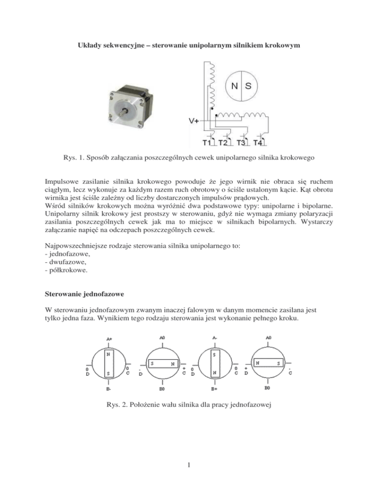 Układy sekwencyjne – sterowanie unipolarnym silnikiem krokowym Rys. 1. Sposób zał czania poszczególnych cewek unipolarnego silnika krokowego Impulsowe zasilanie silnika krokowego powoduje e jego wirnik nie obraca si ruchem ci głym, lecz wykonuje za ka dym razem ruch obrotowy o ci le ustalonym k cie. K t obrotu wirnika jest ci le zale ny od liczby dostarczonych impulsów pr dowych. W ród silników krokowych mo na wyró ni dwa podstawowe typy: unipolarne i bipolarne. Unipolarny silnik krokowy jest prostszy w sterowaniu, gdy nie wymaga zmiany polaryzacji zasilania poszczególnych cewek jak ma to miejsce w silnikach bipolarnych. Wystarczy zał czanie napi na odczepach poszczególnych cewek. Najpowszechniejsze rodzaje sterowania silnika unipolarnego to: - jednofazowe, - dwufazowe, - półkrokowe. Sterowanie jednofazowe W sterowaniu jednofazowym zwanym inaczej falowym w danym momencie zasilana jest tylko jedna faza. Wynikiem tego rodzaju sterowania jest wykonanie pełnego kroku. Rys. 2. Poło enie wału silnika dla pracy jednofazowej 1 Rys. 3. Przebiegi sterowania dla pracy jednofazowej Sterowanie dwufazowe W sterowaniu dwufazowym inaczej pełnokrokowym w ka dej chwili czasu zasilane s dwie fazy. Wynikiem tego rodzaju sterowania s takie same ruchy jak przy sterowaniu jednofazowym z tym, e pozycja wirnika jest przesuni ta o pół kroku. Rys. 4. Poło enie wału silnika dla pracy dwufazowej Rys. 5. Przebiegi sterowania dla pracy dwufazowej 2 Sterowanie półkrokowe Sterowanie półkrokowe jest kombinacj sterowania dwufazowego i jednofazowego. Co drugi krok jest zasilana tylko jedna faza a w pozostałych krokach dwie fazy. Wynikiem tego s obroty wirnika równe połowie tych ze sterowania z jedn lub dwiema fazami wł czonymi. Rys. 6. Poło enia wału silnika dla pracy półkrokowej Rys. 7. Przebiegi sterowania dla pracy półkrokowej 3 Przykładowy schemat sterowania jednofazowego Podł czy wtyk silnika do wyprowadze Altery: GND,16,17,18,21. Przebiegi Wa ne!!! Projektuj c schemat dla ka dego z zada uwzgl dni wył czanie wszystkich cewek silnika w przypadku gdy wał nie obraca si . Zadania wykona dla sterowania: - jednofazowego, - dwufazowego, - półkrokowego. Zadania 1 Przy pomocy edytora graficznego wykona sterowanie silnika krokowego ze zmian kierunku. Zadania 2 Przy pomocy edytora graficznego wykona sterowanie silnika w tym samym kierunku z ustawian na zadajnikach pr dko ci . 4 Zadania 3 Przy pomocy edytora graficznego wykona sterowanie silnika krokowego w sekwencji: 2 kroki w prawo, 3 kroki w lewo, 1 krok w prawo. Zadania 4 Przy pomocy edytora graficznego wykona sterowanie silnika dwoma przyciskami. Po wci ni ciu pierwszego ma zosta wykonany obrót o 4 kroki w prawo, drugiego – o 8 kroków w lewo. Powy sze zadanie mo na równie wykona w j zyku VHDL. 5