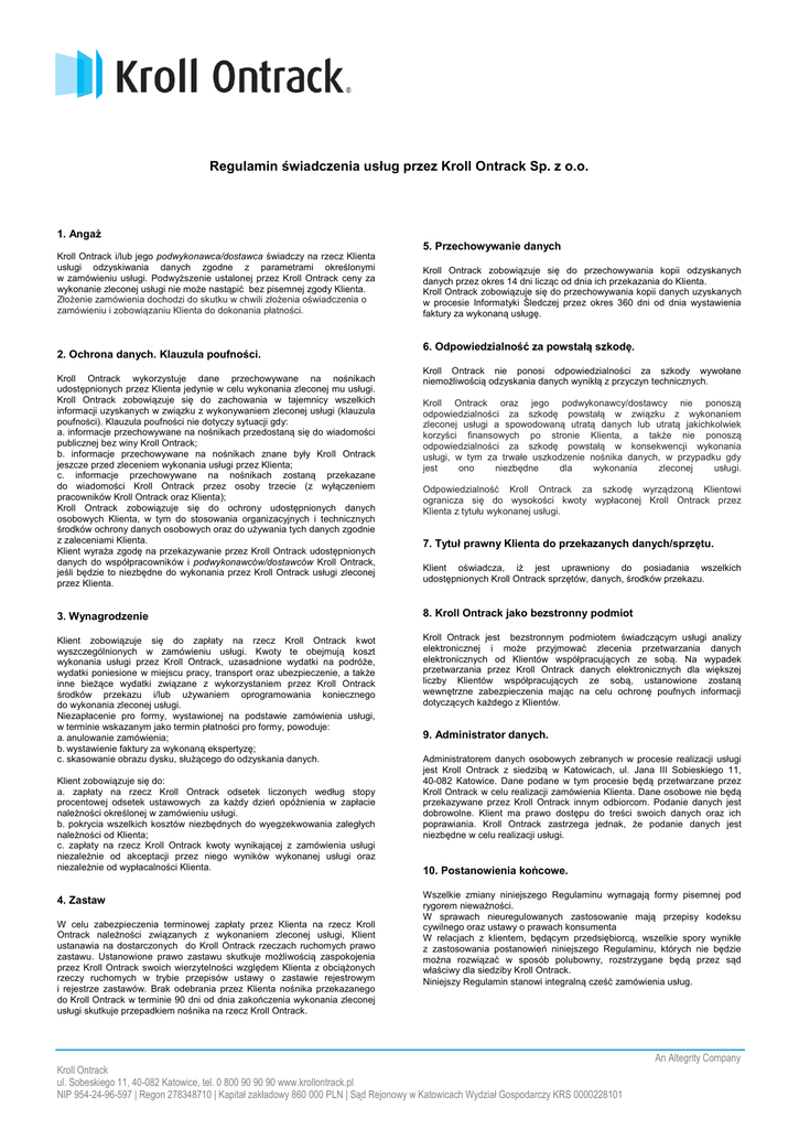 Regulamin świadczenia usług przez Kroll Ontrack Sp. z o.o. 1. Angaż Kroll Ontrack i/lub jego podwykonawca/dostawca świadczy na rzecz Klienta usługi odzyskiwania danych zgodne z parametrami określonymi w zamówieniu usługi. Podwyższenie ustalonej przez Kroll Ontrack ceny za wykonanie zleconej usługi nie może nastąpić bez pisemnej zgody Klienta. Złożenie zamówienia dochodzi do skutku w chwili złożenia oświadczenia o zamówieniu i zobowiązaniu Klienta do dokonania płatności. 2. Ochrona danych. Klauzula poufności. Kroll Ontrack wykorzystuje dane przechowywane na nośnikach udostępnionych przez Klienta jedynie w celu wykonania zleconej mu usługi. Kroll Ontrack zobowiązuje się do zachowania w tajemnicy wszelkich informacji uzyskanych w związku z wykonywaniem zleconej usługi (klauzula poufności). Klauzula poufności nie dotyczy sytuacji gdy: a. informacje przechowywane na nośnikach przedostaną się do wiadomości publicznej bez winy Kroll Ontrack; b. informacje przechowywane na nośnikach znane były Kroll Ontrack jeszcze przed zleceniem wykonania usługi przez Klienta; c. informacje przechowywane na nośnikach zostaną przekazane do wiadomości Kroll Ontrack przez osoby trzecie (z wyłączeniem pracowników Kroll Ontrack oraz Klienta); Kroll Ontrack zobowiązuje się do ochrony udostępnionych danych osobowych Klienta, w tym do stosowania organizacyjnych i technicznych środków ochrony danych osobowych oraz do używania tych danych zgodnie z zaleceniami Klienta. Klient wyraża zgodę na przekazywanie przez Kroll Ontrack udostępnionych danych do współpracowników i podwykonawców/dostawców Kroll Ontrack, jeśli będzie to niezbędne do wykonania przez Kroll Ontrack usługi zleconej przez Klienta. 5. Przechowywanie danych Kroll Ontrack zobowiązuje się do przechowywania kopii odzyskanych danych przez okres 14 dni licząc od dnia ich przekazania do Klienta. Kroll Ontrack zobowiązuje się do przechowywania kopii danych uzyskanych w procesie Informatyki Śledczej przez okres 360 dni od dnia wystawienia faktury za wykonaną usługę. 6. Odpowiedzialność za powstałą szkodę. Kroll Ontrack nie ponosi odpowiedzialności za szkody wywołane niemożliwością odzyskania danych wynikłą z przyczyn technicznych. Kroll Ontrack oraz jego podwykonawcy/dostawcy nie ponoszą odpowiedzialności za szkodę powstałą w związku z wykonaniem zleconej usługi a spowodowaną utratą danych lub utratą jakichkolwiek korzyści finansowych po stronie Klienta, a także nie ponoszą odpowiedzialności za szkodę powstałą w konsekwencji wykonania usługi, w tym za trwałe uszkodzenie nośnika danych, w przypadku gdy jest ono niezbędne dla wykonania zleconej usługi. Odpowiedzialność Kroll Ontrack za szkodę wyrządzoną Klientowi ogranicza się do wysokości kwoty wypłaconej Kroll Ontrack przez Klienta z tytułu wykonanej usługi. 7. Tytuł prawny Klienta do przekazanych danych/sprzętu. Klient oświadcza, iż jest uprawniony do posiadania wszelkich udostępnionych Kroll Ontrack sprzętów, danych, środków przekazu. 3. Wynagrodzenie 8. Kroll Ontrack jako bezstronny podmiot Klient zobowiązuje się do zapłaty na rzecz Kroll Ontrack kwot wyszczególnionych w zamówieniu usługi. Kwoty te obejmują koszt wykonania usługi przez Kroll Ontrack, uzasadnione wydatki na podróże, wydatki poniesione w miejscu pracy, transport oraz ubezpieczenie, a także inne bieżące wydatki związane z wykorzystaniem przez Kroll Ontrack środków przekazu i/lub używaniem oprogramowania koniecznego do wykonania zleconej usługi. Niezapłacenie pro formy, wystawionej na podstawie zamówienia usługi, w terminie wskazanym jako termin płatności pro formy, powoduje: a. anulowanie zamówienia; b. wystawienie faktury za wykonaną ekspertyzę; c. skasowanie obrazu dysku, służącego do odzyskania danych. Kroll Ontrack jest bezstronnym podmiotem świadczącym usługi analizy elektronicznej i może przyjmować zlecenia przetwarzania danych elektronicznych od Klientów współpracujących ze sobą. Na wypadek przetwarzania przez Kroll Ontrack danych elektronicznych dla większej liczby Klientów współpracujących ze sobą, ustanowione zostaną wewnętrzne zabezpieczenia mając na celu ochronę poufnych informacji dotyczących każdego z Klientów. Klient zobowiązuje się do: a. zapłaty na rzecz Kroll Ontrack odsetek liczonych według stopy procentowej odsetek ustawowych za każdy dzień opóźnienia w zapłacie należności określonej w zamówieniu usługi. b. pokrycia wszelkich kosztów niezbędnych do wyegzekwowania zaległych należności od Klienta; c. zapłaty na rzecz Kroll Ontrack kwoty wynikającej z zamówienia usługi niezależnie od akceptacji przez niego wyników wykonanej usługi oraz niezależnie od wypłacalności Klienta. 4. Zastaw W celu zabezpieczenia terminowej zapłaty przez Klienta na rzecz Kroll Ontrack należności związanych z wykonaniem zleconej usługi, Klient ustanawia na dostarczonych do Kroll Ontrack rzeczach ruchomych prawo zastawu. Ustanowione prawo zastawu skutkuje możliwością zaspokojenia przez Kroll Ontrack swoich wierzytelności względem Klienta z obciążonych rzeczy ruchomych w trybie przepisów ustawy o zastawie rejestrowym i rejestrze zastawów. Brak odebrania przez Klienta nośnika przekazanego do Kroll Ontrack w terminie 90 dni od dnia zakończenia wykonania zleconej usługi skutkuje przepadkiem nośnika na rzecz Kroll Ontrack. 9. Administrator danych. Administratorem danych osobowych zebranych w procesie realizacji usługi jest Kroll Ontrack z siedzibą w Katowicach, ul. Jana III Sobieskiego 11, 40-082 Katowice. Dane podane w tym procesie będą przetwarzane przez Kroll Ontrack w celu realizacji zamówienia Klienta. Dane osobowe nie będą przekazywane przez Kroll Ontrack innym odbiorcom. Podanie danych jest dobrowolne. Klient ma prawo dostępu do treści swoich danych oraz ich poprawiania. Kroll Ontrack zastrzega jednak, że podanie danych jest ni