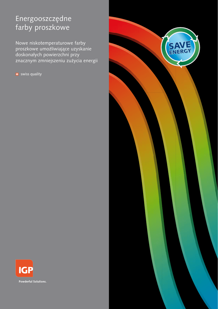 Energooszczędne farby proszkowe Nowe niskotemperaturowe farby proszkowe umożliwiające uzyskanie doskonałych powierzchni przy znacznym zmniejszeniu zużycia energii Niskotemperaturowe systemy IGP Asortyment farb niskotemperaturowych do zastosowań wewnątrz budynków Asortyment farb niskotemperaturowych do zastosowań na zewnątrz budynków Warunki wypalania 140 °C/10 minut: • IGP-DURA®mix 3807 (na zamówienie) Poliestrowo-epoksydowa farba proszkowa, gładka, satyna Warunki wypalania 160 °C/10 minut: • IGP-DURA®pol 6807 Poliestrowa farba proszkowa, gładka, satyna • IGP-DURA®pol 681M (na zamówienie) Poliestrowa farba proszkowa, drobna struktura, mat • IGP-DURA®mix 381M Poliestrowo-epoksydowa farba proszkowa, drobna struktura, mat • IGP-DURA®mix 382SA (na zamówienie) Poliestrowo-epoksydowa farba proszkowa, gruba struktura, mat Warunki wypalania 160 °C/10 minut: • IGP-DURA®mix 3103 Poliestrowo-epoksydowa farba proszkowa, gładka, mat Asortyment farb niskotemperaturowych do zastosowań antykorozyjnych Warunki wypalania 140 °C/10 minut: • IGP-KORROPRIMER 1809 Podkładowa farba proszkowa (primer) do malowania stali • IGP-DURA®mix 312M (na zamówienie) Poliestrowo-epoksydowa farba proszkowa, gruba struktura, mat Uzupełnieniem tych nowych farb proszkowych są sprawdzone systemy farb proszkowych IGP-DURA®mix o temperaturze wypalania 160 °C”: 3107, 3109, 3507, 3509, 312SA 07.10 · GA · DF IGP Pulvertechnik AG · Industrie Stelz, Kirchberg · 9500 Wil · Szwajcaria · Telefon +41 (0)71 929 81 11 · Telefax +41 (0)71 929 81 81 · www.igp.ch · [email protected] Firma IGP oferuje Państwu bogaty asortyment farb proszkowych o niskich temperaturach wypalania do zastosowań wewnątrz i na zewnątrz budynków. Niskotemperaturowe farby proszkowe firmy IGP pozwolą Państwu obniżyć koszty energii zużywanej do wypalania a jednocześnie zoptymalizują czasy cyklów technologicznych w procesie produkcji. Informacja dotycząca użycia: Należy przestrzegać naszych „Informacji Technicznych”.