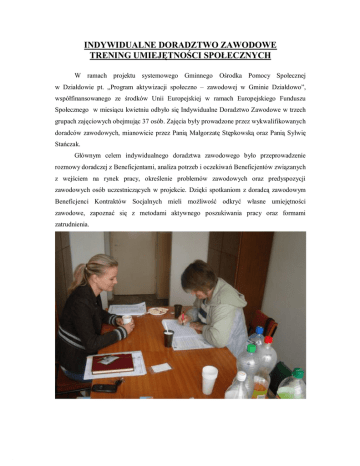 INDYWIDUALNE DORADZTWO ZAWODOWE TRENING UMIEJĘTNOŚCI SPOŁECZNYCH W ramach projektu systemowego Gminnego Ośrodka Pomocy Społecznej w Działdowie pt. „Program aktywizacji społeczno – zawodowej w Gminie Działdowo”, współfinansowanego ze środków Unii Europejskiej w ramach Europejskiego Funduszu Społecznego w miesiącu kwietniu odbyło się Indywidualne Doradztwo Zawodowe w trzech grupach zajęciowych obejmując 37 osób. Zajęcia były prowadzone przez wykwalifikowanych doradców zawodowych, mianowicie przez Panią Małgorzatę Stępkowską oraz Panią Sylwię Stańczak. Głównym celem indywidualnego doradztwa zawodowego było przeprowadzenie rozmowy doradczej z Beneficjentami, analiza potrzeb i oczekiwań Beneficjentów związanych z wejściem na rynek pracy, określenie problemów zawodowych oraz predyspozycji zawodowych osób uczestniczących w projekcie. Dzięki spotkaniom z doradcą zawodowym Beneficjenci Kontraktów Socjalnych mieli możliwość odkryć własne umiejętności zawodowe, zapoznać się z metodami aktywnego poszukiwania pracy oraz formami zatrudnienia. Również w kwietniu odbyły się czterodniowe warsztaty treningu umiejętności społecznych, obejmujące 11 uczestniczek z grupy 2. Zajęcia te prowadzone były w oparciu o aktywne techniki pracy z grupą, takie jak: ćwiczenia interaktywne, analiza doświadczeń, dyskusja z uczestnikami, mini wykład. Dzięki Pani psycholog Magdalenie Szklarskiej Beneficjentki zaznajomiły się z podstawowymi wiadomościami z zakresu psychologii, określiły własny typ osobowości, udoskonaliły własne umiejętności komunikacyjne w zakresie komunikacji werbalnej i niewerbalnej, przeanalizowały własne relacje z innymi ludźmi. Warsztaty psychologiczne miały na celu wzmocnić samoakceptację Beneficjentek, rozwinąć ich kreatywność, nauczyć je konstruktywnego rozwiązywania konfliktów oraz radzenia sobie ze stresem.