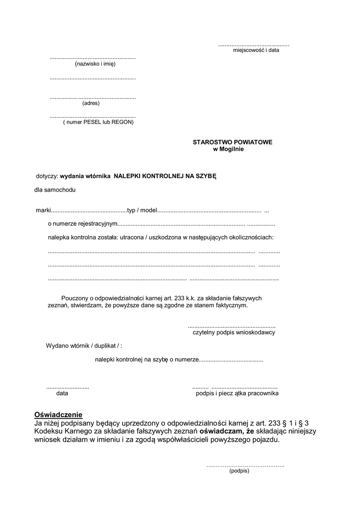 ........................................... miejscowość i data .................................................... (nazwisko i imię) .................................................... .................................................... (adres) .................................................... ( numer PESEL lub REGON) STAROSTWO POWIATOWE w Mogilnie dotyczy: wydania wtórnika NALEPKI KONTROLNEJ NA SZYBĘ dla samochodu marki..............................................typ / model............................................................... ... o numerze rejestracyjnym............................................................................. ................. nalepka kontrolna została: utracona / uszkodzona w następujących okolicznościach: ............................................................................................................................. ............. ............................................................................................................................. ............. .................................................................................... ...................................................... Pouczony o odpowiedzialności karnej art. 233 k.k. za składanie fałszywych zeznań, stwierdzam, że powyższe dane są zgodne ze stanem faktycznym. ..................................................... czytelny podpis wnioskodawcy Wydano wtórnik / duplikat / : nalepki kontrolnej na szybę o numerze....................................... .......................... data .......... ........................................ podpis i piecz ątka pracownika Oświadczenie Ja niżej podpisany będący uprzedzony o odpowiedzialności karnej z art. 233 § 1 i § 3 Kodeksu Karnego za składanie fałszywych zeznań oświadczam, że składając niniejszy wniosek działam w imieniu i za zgodą współwłaścicieli powyższego pojazdu. ……………………………………. (podpis)