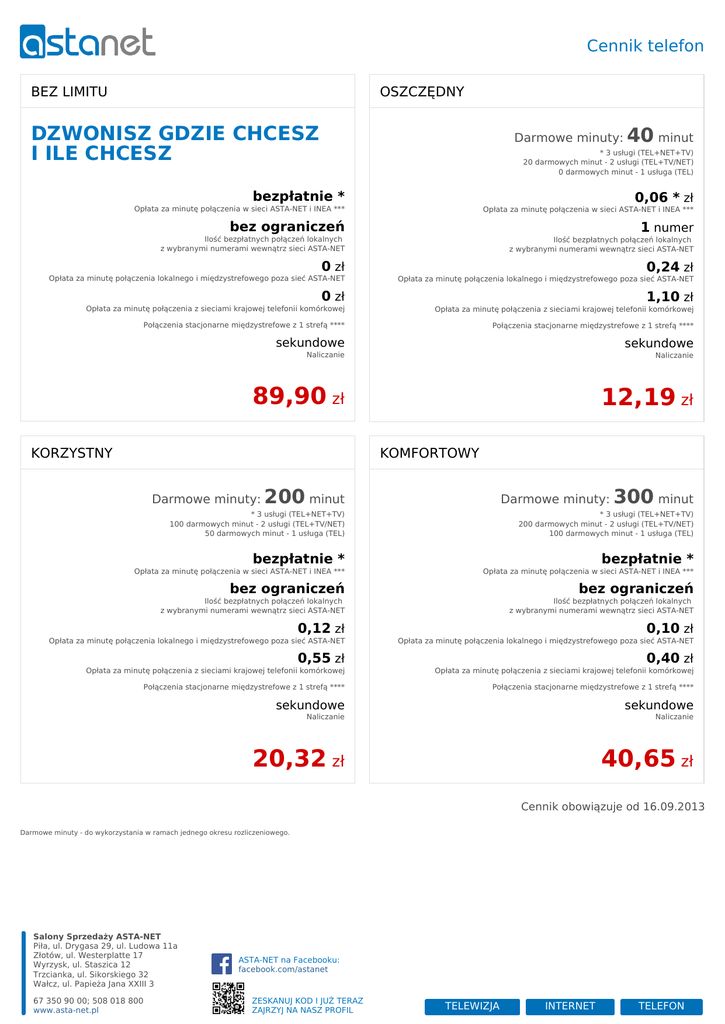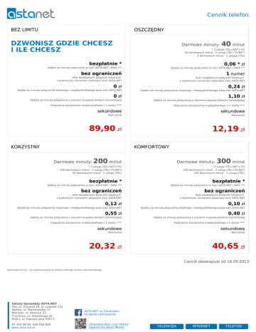 Cennik telefon BEZ LIMITU OSZCZĘDNY DZWONISZ GDZIE CHCESZ I ILE CHCESZ Darmowe minuty: 40 minut * 3 usługi (TEL+NET+TV) 20 darmowych minut - 2 usługi (TEL+TV/NET) 0 darmowych minut - 1 usługa (TEL) bezpłatnie * 0,06 * zł Opłata za minutę połączenia w sieci ASTA-NET i INEA *** Opłata za minutę połączenia w sieci ASTA-NET i INEA *** bez ograniczeń 1 numer Ilość bezpłatnych połączeń lokalnych z wybranymi numerami wewnątrz sieci ASTA-NET Ilość bezpłatnych połączeń lokalnych z wybranymi numerami wewnątrz sieci ASTA-NET 0 zł Opłata za minutę połączenia lokalnego i międzystrefowego poza sieć ASTA-NET 0,24 zł Opłata za minutę połączenia lokalnego i międzystrefowego poza sieć ASTA-NET 0 zł 1,10 zł Opłata za minutę połączenia z sieciami krajowej telefonii komórkowej Opłata za minutę połączenia z sieciami krajowej telefonii komórkowej Połączenia stacjonarne międzystrefowe z 1 strefą **** Połączenia stacjonarne międzystrefowe z 1 strefą **** sekundowe sekundowe Naliczanie Naliczanie 89,90 zł KORZYSTNY 12,19 zł KOMFORTOWY Darmowe minuty: 200 minut Darmowe minuty: * 3 usługi (TEL+NET+TV) 100 darmowych minut - 2 usługi (TEL+TV/NET) 50 darmowych minut - 1 usługa (TEL) 300 minut * 3 usługi (TEL+NET+TV) 200 darmowych minut - 2 usługi (TEL+TV/NET) 100 darmowych minut - 1 usługa (TEL) bezpłatnie * bezpłatnie * Opłata za minutę połączenia w sieci ASTA-NET i INEA *** Opłata za minutę połączenia w sieci ASTA-NET i INEA *** bez ograniczeń bez ograniczeń Ilość bezpłatnych połączeń lokalnych z wybranymi numerami wewnątrz sieci ASTA-NET Ilość bezpłatnych połączeń lokalnych z wybranymi numerami wewnątrz sieci ASTA-NET 0,12 zł 0,10 zł Opłata za minutę połączenia lokalnego i międzystrefowego poza sieć ASTA-NET Opłata za minutę połączenia lokalnego i międzystrefowego poza sieć ASTA-NET 0,55 zł 0,40 zł Opłata za minutę połączenia z sieciami krajowej telefonii komórkowej Opłata za minutę połączenia z sieciami krajowej telefonii komórkowej Połączenia stacjonarne międzystrefowe z 1 strefą **** Połączenia stacjonarne międzystrefowe z 1 strefą **** sekundowe sekundowe Naliczanie Naliczanie 20,32 zł 40,65 zł Cennik obowiązuje od 16.09.2013 Darmowe minuty - do wykorzystania w ramach jednego okresu rozliczeniowego. Salony Sprzedaży ASTA-NET Piła, ul. Drygasa 29, ul. Ludowa 11a Złotów, ul. Westerplatte 17 Wyrzysk, ul. Staszica 12 Trzcianka, ul. Sikorskiego 32 Wałcz, ul. Papieża Jana XXIII 3 67 350 90 00; 508 018 800 www.asta-net.pl ASTA-NET na Facebooku: facebook.com/astanet ZESKANUJ KOD I JUŻ TERAZ ZAJRZYJ NA NASZ PROFIL TELEWIZJA INTERNET TELEFON Cennik telefon Połączenia do sieci inteligentnych Cena Numery 0 800 bezpłatnie Numery 0 801-0, 0 801-2, 0 801-3, 0 801-7, 0 801-8, 0 801-9 0,37 zł (opłata za połączenie) Numery 0 801-4 0,55 zł/min. Numery 0 801-5, 0 801-6, 0 804-1 0,37 zł/min. Numery 0 804-2 0,48 zł/min. Do sieci przywoławczych na numer 0-6422 5,70 zł/min. Do sieci przywoławczych na numer 0-64xx poza 0-6422 0,20 zł/min. Połączenia o podwyższonej opłacie Cena Numery 700 4, 701 4, 703 4, 708 4 2.58 zł/min. Numery 700 5, 701 5, 703 5, 708 5 3.69 zł/min. Numery 700 6, 701 6, 703 6, 708 6 4.26 zł/min. Numery 700 7, 701 7, 703 7, 708 7 4.92 zł/min. Numery 700 8, 701 8, 703 8, 708 8 7.69 zł/min. Numery 700 9, 701 9, 703 9, 708 9 9.99 zł/min. Numery 704 0 0.71 zł/poł. Numery 704 1 1.43 zł/poł. Numery 704 2 2.50 zł/poł. Numery 704 3 3.92 zł/poł. Numery 704 4 4.99 zł/poł. Numery 704 5 6.42 zł/poł. Numery 704 6 9.99 zł/poł. Numery 704 7 12.48 zł/poł. Usługi telefoniczne *21* ‹numer_tel› # - aktywacja bezwarunkowego przekierowania połączeń PRZEKIEROWANIE POŁĄCZEŃ *#21# - sprawdzenie stanu usługi #21# - deaktywacja bezwarunkowego przekierowania połączeń PRZEKIEROWANIE POŁĄCZEŃ GDY NIE ODBIERAMY *61* ‹numer_tel› # - aktywacja przekierowania gdy nie odbieramy *#61# - sprawdzenie stanu usługi #61# - deaktywacja przekierowania PRZEKIEROWANIE POŁĄCZEŃ GDY NUMER JEST ZAJĘTY *67* ‹numer_tel› # - aktywacja przekierowania *#67# - sprawdzenie stanu usługi #67# - deaktywacja przekierowania ZASTRZEŻENIE NUMERU PRZED POŁĄCZENIEM *27# - aktywacja zastrzeżenia *#27# - sprawdzenie stanu usługi #27# - usunięcie zastrzeżenia *26# - aktywacja usługi USŁUGA "NIE PRZESZKADZAĆ" *#26# - sprawdzenie stanu usługi #26# - deaktywacja usługi *55*XXXX# - aktywacja usługi budzenie na telefon XXXX – czas, np. godz. 07:45 = 0745 BUDZENIE NA TELEFON *#55# - kod sprawdzenia usługi #55# - deaktywacja usługi budzenie na telefon Salony Sprzedaży ASTA-NET Piła, ul. Drygasa 29, ul. Ludowa 11a Złotów, ul. Westerplatte 17 Wyrzysk, ul. Staszica 12 Trzcianka, ul. Sikorskiego 32 Wałcz, ul. Papieża Jana XXIII 3 67 350 90 00; 508 018 800 www.asta-net.pl ASTA-NET na Facebooku: facebook.com/astanet ZESKANUJ KOD I JUŻ TERAZ ZAJRZYJ NA NASZ PROFIL TELEWIZJA INTERNET TELEFON Cennik telefon Inne opłaty Cena Przeniesienie numeru do ASTA-NET bezpłatnie Comiesięczna lub jednorazowa specyfikacja połączeń za 1 miesiąc dla 1 numeru telefonu 5 zł Blokada połączeń wychodzących 3,66 zł (opłata miesięczna) Prezentacja numeru przychodzącego bezpłatnie Numer złoty 300 zł Numer srebrny 150 zł Zmiana numeru na wniosek Klienta 50 zł Zastrzeżenie numeru bezpłatnie Czasowe zawieszenie usługi na wniosek Abonenta 40 zł (maksymalnie na 12 miesięcy przy umowie na czas nieokreślony) Zmiana abonamentu na niższy 50 zł Zmiana abonamentu na wyższy bezpłatnie Koszt obsługi zadłużenia 10 zł Interwencja serwisu technicznego/asysta techniczna 49 zł w miejscowościach Piła i Trzcianka 99 zł Interwencja serwisu technicznego/asysta techniczna poza miejscowościami Piła i Trzcianka Fax2Mail - (otrzymywanie faksów na wskazany adres mailowy) bezpłatnie*/5 zł** Instalacja dodatkowego gniazda telefonicznego w tym samym lokalu 129 zł * dla abon