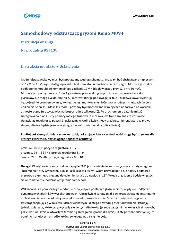 www.conrad.pl Samochodowy odstraszacz gryzoni Kemo M094 Instrukcja obsługi Nr produktu 857138 Instrukcja montażu + Ustawienia Moduł ultradźwiękowy musi być podłączany według schematu. Może on być obsługiwany napięciami od 12 V do 15 V prądu stałego (pojazd lub akumulator samochodu ciężarowego). Możliwe jest także podłączenie modułu do komercyjnego zasilania 12 V = (dopływ prądu przy 12 V = < 50 mA). Możliwe jest podłączenie od 1 do 4 głośników piezoelektrycznych. Przewody prowadzące do głośników nie mogą być dłuższe niż 50 metrów. Biorąc pod uwagę, iż fale ultradźwiękowe wykazują bezpośrednie promieniowanie, konieczne jest montowanie głośników w różnych miejscach (w celu uniknięcia "cienia"). Głośniki i moduł powinny być montowane w miejscach odpornych na warunki atmosferyczne (nie wystawiać na bezpośrednią wilgotność). Po uruchomieniu zacznie migać zintegrowana dioda. Przy pomocy małego śrubokręta możliwa jest także zmiana częstotliwości. Ustawiając regulator w pozycji 1, usłyszymy wysoki dźwięk . Przy przekręcaniu regulatora w prawą stronę, dźwięk będzie jeszcze wyższy, aż w końcu niesłyszalny (ultradźwięk). Poniżej pokażemy doświadczalne wartości, pokazujące, które częstotliwości mogą być używane dla którego zwierzęcia, aby osiągnąć najlepsze rezultaty: ptaki. ok. 10 kHz: pozycja regulatora 1 ... 2 gryzonie. 24 ... 32 kHz: pozycja regulatora 8 ... 9 owady. 27 ... 35 kHz: pozycja regulatora 9 ... 10 Uwaga! W większości samochodów napięcie "15" jest zamieniane automatycznie z pozytywnego na "uziemienie" przy wyłączaniu silnika. Jeśli jest tak też w Twoim przypadku, to nie należy podłączać przewodu ujemnego bieguna do uziemienia, ale do napięcia "15". Wtedy urządzenie będzie włączać się automatycznie podczas wyłączania samochodu. Wskazówka: Za pomocą tego modułu można jedynie podłączyć głośniki piezo, nigdy nie podłączać dynamicznych głośników wysokotonowych! Ultradźwięki oznaczają dla zwierząt wyłącznie nieznaczne molestowanie, ale nie szkodzą im w jakikolwiek sposób fizycznie. Strach i dźwięki ostrzegawcze u zwierząt znajdują się w zakresie ultradźwiękowym i dlatego powodują efekt odpychania. Istnieją jednak zwierzęta, które przyzwyczaiły się do tych dźwięków (przede wszystkim w okresach zimowych, gdzie warunki życia w otwartym terenie są szczególnie groźne dla życia). Dlatego może zdarzyć się, że pomimo istniejących ultradźwięków, zwierzęta nadal się nie boją. Strona 1 z 4 Dystrybucja Conrad Electronic Sp. z o.o., Copyright © Conrad Electronic 2011, Kopiowanie, rozpowszechnianie, zmiany bez zgody zabronione. www.conrad.pl www.conrad.pl Uwaga! Jeśli kuny był już w samochodzie i umieścił jego "ślady zapachowe", mycie silnika jest absolutnie konieczne. Również nawierzchni pod samochodem powinna być wyczyszczona środkami czyszczącymi, aby usunąć znaki zapachowe. Instrukcje bezpieczeństwa dla modułów K E M O. Instrukcje powinny być przeczytane przed podłączeniem modułu! Moduły Kemo są produkowane zgodnie z DIN EN 60065 i są zgodne z wymogami bezpieczeństwa producenta. Wszystkie elementy bezpieczeństwa niezbędne do montażu końcowego są wymienione w instrukcji montażu i nie mogą być pominięte. Montaż i uruchomienie mogą być wykonywane tylko przez uprawnione osoby, które mogą być również pociągnięte do odpowiedzialności za ewentualne szkody. Instrukcja montażu dostarczona przez producenta muszą być przestrzegane. Wszystkie części muszą zostać zainstalowane do pracy ciągłej i nie mogą być ignorowane dla osobistego bezpieczeństwa. To samo odnosi się do instrukcji obsługi wymienionej w instrukcji producenta. Moduł ten nie jest przeznaczony dla osób poniżej 14 roku życia (nie posiada akceptacji CE jako zabawka dla dzieci). Moduł nie może być narażony na ekstremalne temperatury (ponad 50 ° C) i wilgotność. Przepisy dotyczące zapobiegania wypadkom w instalacjach elektrycznych i materiały operacyjne stowarzyszenia ubezpieczeń od odpowiedzialności cywilnej muszą być przestrzegane w zakładach przemysłowych. W szkołach, ośrodkach szkolenia i warsztatach, działania tych modułów muszą być nadzorowane przez przeszkolony personel. Do wszystkich zestawów i modułów, które wchodzą w kontakt z napięciem wyższym niż 25 V, muszą być przestrzegane instrukcje VDE! Pierwsze uruchomienie może być wykonywane jedynie przez ekspertów! Najważniejsze wskazówki dotyczące bezpieczeństwa to: Ochrona przed przypadkowym kontaktem ze wszystkimi metalowymi częściami, które mogą przewozić prąd większy niż 25 V. Rozprostuj zagięcia na wszystkich kablach! W przypadku awarii, część lub moduł może pęknąć! Dlatego urządzenie musi być zainstalowane w taki sposób, aby w tym przypadku, jak również w przypadku pożaru nie została wyrządzona żadna szkoda (instalacja w uziemionych metalowych szafkach lub uziemione metalowych obudowach). Strona 2 z 4 Dystrybucja Conrad Electronic Sp. z o.o., Copyright © Conrad Electronic 2011, Kopiowanie, rozpowszechnianie, zmiany bez zgody zabronione. www.conrad.pl www.conrad.pl Uwaga! Urządzenie wymaga bezpiecznika (ok. 2.5 A). Bezpiecznik nie jest dołączony do zestawu Strona 3 z 4 Dystrybucja Conrad Electronic Sp. z o.o., Copyright © Conrad Electronic 2011, Kopiowanie, rozpowszechnianie, zmiany bez zgody zabronione. www.conrad.pl www.conrad.pl Przeznaczenie: Generacja fal ultradźwiękowych w celu odstraszania kun i myszy od pojazdów silnikowych, magazynów, strychów itp. Uwaga: Niektóre ultradźwiękowe częstotliwości mogą mieć wpływ na zdrowie osób wrażliwych i spowodować np. ból głowy. Proszę zwrócić na to uwagę podczas instalacji. Odstraszacz M094… ... produkuje intensywnie pulsujące ultradźwięki, które dla kun i podobnych gryzoni są szczególnie nie do zniesienia, a zatem