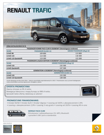 CENA KATALOGOWA W ZŁ SILNIK 2.0 dCi 90 2.0 dCi 115 2.0 dCi 115 Quickshift SILNIK 2.0 dCi 115 2.0 dCi Quickshift PASSENGER KOMBI PACK CLIM 9-OSOBOWY (Homologacja osobowa) GRAND PASSENGER (długi L2) PASSANGER (krótki L1) 113 800 118 300 123 300 109 800 114 300 119 300 PASSENGER SL BLACK EDITION 9-OSOBOWY (Homologacja osobowa) GRAND PASSENGER (długi L2) 132 500 137 500 GENERATION 6-OSOBOWY (Homologacja osobowa) GENERATION (krótki L1) SILNIK 2.0 dCi 115 2.0 dCi 115 Quickshift 133 500 138 500 Cennik obowiązuje od dnia 29.01.2014 r. i dotyczy samochodów wyprodukowanych w 2013 r. Prezentowane ceny są cenami katalogowymi. Liczba samochodów w promocji ograniczona. Szczegóły w salonie. OFERTA PROMOCYJNA Opony zimowe za 99 zł netto. Nawigacja fabryczna z mapą Europy za 990 zł netto. Sprawdź także ofertę rabatową w salonie! PROMOCYJNE FINANSOWANIE: • Kredyt 50/50 • Kredyt 4x25 • Kredyt Ulgowy • Leasing od 102% z ubezpieczeniem 2,9% • Leasing z ubezpieczeniem 2,9% • Leasing 3 raty gratis • Leasing od 102% • Leasing All-in-one WERSJE PACK CLIM Klimatyzacja i radiooodtwarzacz CD, MP3, Bluetooth z gniazdem USB i jack w standardzie. WYPOSAŻENIE PASSENGER Pack Clim 9-osobowy PASSENGER Black Edition 9-osobowy GENERATION 6-osobowy ● - ● 1200 ● 1200 1218 2450 2120 ● 2450 2120 ● 2450 2120 ● ● ● 2010 ● 2010 ● ● 3850 1060 0 ● ● 3850 1060 ● ● ● ● 1060 ● ● ● ● 530 1170 ● ● 530 1170 ● ● ● 530 530 530 270 220 ● 270 220 ● 270 ● ● 850 220 ● 220 ● 220 540 ● ● ● ● 3200 ● ● - ● ● - ● ● ● ● ● ● ● 115 ● 80 220 ● - ● ● 80 ● ● - ● ● 80 ● ● ● 1060 ● 2120 ● ● - ● ● 10500 ● 2120 2660 - 2660 4250 ● 4250 3720 5300 120 530 590 - - 3720 1060 ● ● 590 - 120 ● 590 330 DESIGN ZEWNĘTRZNY Pa ki et el ementów l a ki erowa nych : zderza k przedni w kol orze na dwozi a (l i s twa w zdrza ku s za ra ) i tyl ny próg l a ki erowa ny Pa ki et ozdobny kompl etny : l a ki erowa na l i s twa ochronna w zderza ku, l i s twy boczne, l us terka zewnętrzne, el ementy poni żej i powyżej ś wi a teł tyl nych Pa ki et promocyjny PACK NAV: na wi ga cja fa bryczna TomTom LIVE wra z z ma pą Europy La ki er meta l i zowa ny Fel gi a l umi ni owe (4s zt.) 16" 5-ra mi enne wzór l xta r BEZPIECZEŃSTWO ABS + EBV (El ektroni czny korektor s i ły ha mowa ni a ) + AFU (Ws poma ga ni e Na głego Ha mowa ni a ) + 4 ha mul ce ta rczowe Sys tem kontrol i tra kcji ESP (oprócz wers ji Qui cks hi ft) dos tos owujący s i ę do obci ążeni a , z s ys temem ASR) Podus zka powi etrzna ki erowcy Podus zka powi etrzna dl a 2 pa s a żerów, z możl i woś ci ą wyłączeni a w cel u i ns ta l a cji fotel i ka Boczne podus zki powi etrzne (1 l ub 2 gdy pojedynczy fotel dl a pa s a żera z przodu) + kurtyny Podus zki kurtynowe na mi ejs ca ch tyl nych (koni eczne kurtyny przedni e i na pi na cze pa s ów) Na pi na cze pa s ów w ka na pi e w drugi m / trzeci m rzędzi e (tyl ko z kompl etnym zes ta wem Sys tem ISOFIX do mocowa ni a fotel i ka dzi ecęcego - na mi ejs cu ś rodkowym ka na py tyl nej w drugi m rzędzi e (Genera ti on: na pojedynczych fotel ech w drugi m rzędzi e) Regul a tor / ogra ni czni k prędkoś ci (tempoma t) Ws poma ga ni e cofa ni a (4 czujni ki ) Centra l ny za mek zda l ni e s terowa ny fa l a mi ra di owymi z funkcją bl okowa ni a drzwi w cza s i e ja zdy Centra l ny za mek zda l ni e s terowa ny z bl oka dą a ntywła ma ni ową (uni emożl i wi a otwa rci e drzwi od wewnątrz) Za pa s owy trzeci kl uczyk do s ta cyjki Kl uczyk 3-przyci s kowy z funkcją s el ektywnego otwi era ni a drzwi Koło za pa s owe 16" umi es zczone pod podwozi em WIDOCZNOŚĆ I OŚWIETLENIE Świ a tła przeci wmgłowe Świ a tła a utoma tyczni e włącza ne po uruchomi eni u s i l ni ka Czujni k des zczu: wyci era czki "i ntel i gentne" (a utoma tyczne włączni e z a utoma tyczną regul a cją częs totl i woś ci pra cy) PROWADZENIE POJAZDU Ws poma ga ni e ki erowni cy Skrzyni a bi egów 6-bi egowa , dźwi gni a zmi a ny bi egów umi es zczona w des ce rozdzi el czej Ta chogra f cyfrowy (kos zt ta chogra fu ni e obejmuje kos ztu ka rt i ka l i bra cji ) Ws ka źni ki : l i czni k i obrotomi erz; przebi eg ca łkowi ty i częś ci owy; pozi om pa l i wa ; pozi om ol eju przy urochomi eni u s i l ni ka Komputer pokła dowy: ś redni a prędkoś ć, s pa l a ni e ca łkowi te/ś redni e/chwi l owe, przewi dywa ny za s i ęg KOMFORT Szyby przedni e el ektryczni e s terowa ne Szyby el ektryczni e s terowa ne z włączni ki em i mpul s owym po s troni e ki erowcy Zewnętrzne l us terka regul owa ne el ektryczni e i podgrzewa ne Za pa l ni czka w des ce rozdzi el czej i przenoś na popi el ni czka (zes ta w dl a pa l ących) Gni a zdo 12V w częś ci tyl nej (2 s zt w wers ji Genera ti on) La mpki pods ufi towe: 1 w ka bi ni e + 2 w częś ci tyl nej La mpki pods ufi towe: 1 w ka bi ni e + 2 potrójne w częś ci tyl nej KOMFORT TERMICZNY Sys tem ogrzewa ni a przedni ego z recyrkul a cją z 4 prędkoś ci a mi Ogrzewa ni e tyl ne zwi ęks zonej wyda jnoś ci (+2kW), tyl ne na wi ewy z regul a cją s i ły na wi ewu Ni eza l eżne progra mowa ne ogrzewa ni e pos tojowe, z pa nel em s terującym i wyś wi etl a czem LCD Kl i ma tyza cja przedni a ma nua l na Kl i ma tyza cja przedni a ma nua l na + doda tkowa na grzewni ca 5kW Kl i ma tyza cja przedni a ma nua l na + kl i ma tyza cja tyl na , z na wi ewa mi ki erunkowymi w s ufi ci e i regul a cją s i ły na wi ewu Kl i ma tyza cja przedni a ma nua l na + kl i ma tyza cja tyl na + doda tkowa na grzewni ca (wyma ga OGRZWD, PRZBAG w wer. 9-os obowy, w Genera ti on: BATDOD POSTOG SCHAD) (kod opcji : KLIBUS) Kl i ma tyza cja regul owa na przedni a i tyl na bez doda tkowej na grzewni cy Kl i ma tyza cja regul owa na przedni a i tyl na z doda tkową na grzewni cą 5kW Fi l tr przeci wpyłkowy Szyby w ś ci a na ch bocznych i z tyłu doda tkowo przyci em