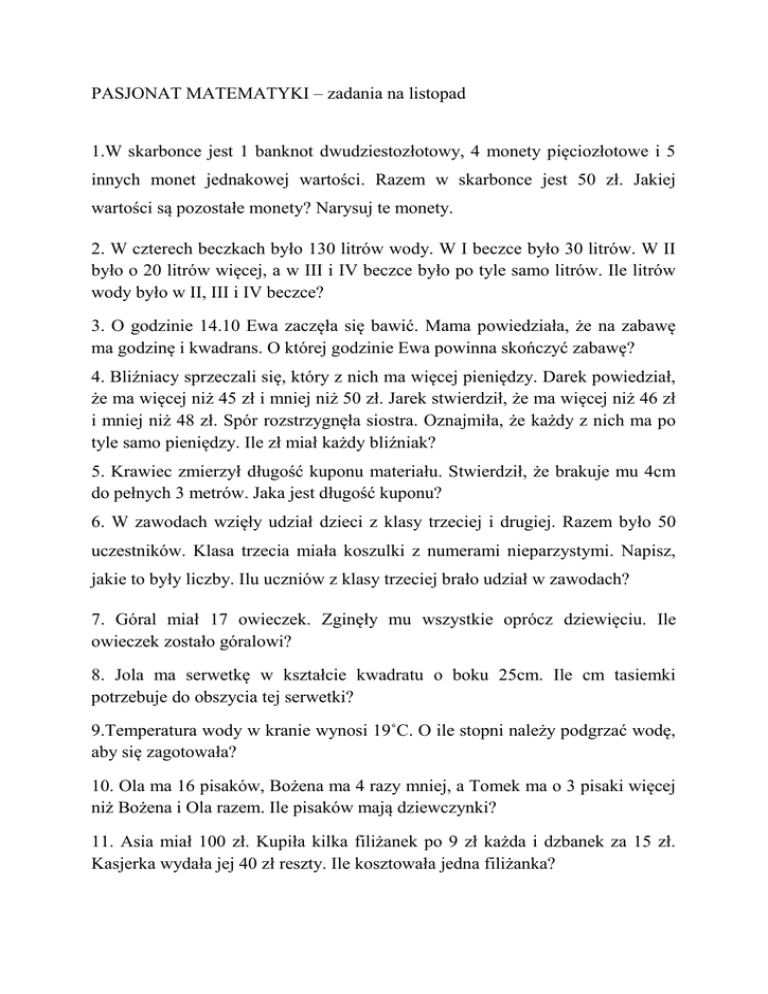 PASJONAT MATEMATYKI – zadania na listopad 1.W skarbonce jest 1 banknot dwudziestozłotowy, 4 monety pięciozłotowe i 5 innych monet jednakowej wartości. Razem w skarbonce jest 50 zł. Jakiej wartości są pozostałe monety? Narysuj te monety. 2. W czterech beczkach było 130 litrów wody. W I beczce było 30 litrów. W II było o 20 litrów więcej, a w III i IV beczce było po tyle samo litrów. Ile litrów wody było w II, III i IV beczce? 3. O godzinie 14.10 Ewa zaczęła się bawić. Mama powiedziała, że na zabawę ma godzinę i kwadrans. O której godzinie Ewa powinna skończyć zabawę? 4. Bliźniacy sprzeczali się, który z nich ma więcej pieniędzy. Darek powiedział, że ma więcej niż 45 zł i mniej niż 50 zł. Jarek stwierdził, że ma więcej niż 46 zł i mniej niż 48 zł. Spór rozstrzygnęła siostra. Oznajmiła, że każdy z nich ma po tyle samo pieniędzy. Ile zł miał każdy bliźniak? 5. Krawiec zmierzył długość kuponu materiału. Stwierdził, że brakuje mu 4cm do pełnych 3 metrów. Jaka jest długość kuponu? 6. W zawodach wzięły udział dzieci z klasy trzeciej i drugiej. Razem było 50 uczestników. Klasa trzecia miała koszulki z numerami nieparzystymi. Napisz, jakie to były liczby. Ilu uczniów z klasy trzeciej brało udział w zawodach? 7. Góral miał 17 owieczek. Zginęły mu wszystkie oprócz dziewięciu. Ile owieczek zostało góralowi? 8. Jola ma serwetkę w kształcie kwadratu o boku 25cm. Ile cm tasiemki potrzebuje do obszycia tej serwetki? 9.Temperatura wody w kranie wynosi 19˚C. O ile stopni należy podgrzać wodę, aby się zagotowała? 10. Ola ma 16 pisaków, Bożena ma 4 razy mniej, a Tomek ma o 3 pisaki więcej niż Bożena i Ola razem. Ile pisaków mają dziewczynki? 11. Asia miał 100 zł. Kupiła kilka filiżanek po 9 zł każda i dzbanek za 15 zł. Kasjerka wydała jej 40 zł reszty. Ile kosztowała jedna filiżanka? 12. Remont domu miał trwać cały maj i jeszcze 5 dni w czerwcu. Trwał o tydzień krócej. Ile dni trwał remont? 13. Bilet do teatru kosztuje 8 zł. Dzieci płacą połowę tej kwoty. Ile zapłaci za bilety rodzina składająca się z rodziców i trojga ich dzieci? 14. Zosia ma pełną skarbonkę monet. Obliczyła ich sumę – jest 76 zł. Wymieniła te pieniądze u mamy na 2 banknoty i 2 monety? Jakie banknoty i monety dostała? 15. Wpisz liczby według zauważonej zasady. 1, 3, 5, 7, ...., ......, ....., ....., ....., 12, 21, 13, 31, ....., ....., ....., ....., 13, 23, 33, ....., ...., ....., ....., …… 2, 4, 7, 11, 16, 22, … , ….., ……, ……, 2, 7, 4, 9, 6, 11,8, .…, .…., .…., .…., 10, 21, 33, 46, 60, .…., .….., .….., .….. 17. Kasia obliczyła, że za swoje pieniądze może kupić babci na urodziny albo 6 tulipanów po 4 zł każdy, albo 3 róże. Wybrała róże. Ile kosztowała 1 róża? 18. W lesie rosło 55 drzew iglastych i 34 liściaste. Wichura powaliła 2 brzozy i 12 sosen. Ile drzew iglastych rośnie dalej w lesie? 19. Czworo dzieci pojechało w odwiedziny do babci na wieś. Za przejazd autobusem zapłaciły 32zł. Z powrotem wracało tylko troje dzieci, bo jedno zostało u babci. Ile musiały mieć pieniędzy na autobus? 20. Przed lekcjami uczniowie pewnej klasy dzielili się na czteroosobowe zespoły. Ile takich zespołów powstało, jeśli wiadomo, że wszystkich uczniów klasie było 31, a jeden zespół liczył tylko 3 uczniów? 21.Słoik miodu waży 65 dag. Pusty słoik waży 15 dag. Ile dekagramów miodu mieści się w trzech słoikach? 22. Kasia miała w skarbonce zaoszczędzone pieniądze. Tata dał jej i siostrze 28 zł do równego podziału. Po przeliczeniu wszystkich pieniędzy okazało się, że Kasia ma teraz 81 zł. Ile pieniędzy Kasia miała w skarbonce? 23.Karol przez kwadrans robił zakupy, 2 kwadranse pływał na basenie i ćwierć godziny ćwiczył grę na skrzypcach. Ile czasu zajęły Karolowi te wszystkie zajęcia? 24.W sadzie pana Adama rośnie 30 drzew owocowych. Każdego roku przez 6 kolejnych lat ogrodnik zamierza sadzić 3 nowe drzewa. Ile drzew będzie w sadzie pana Adama za 6 lat? 25.Siedem kanapek kosztuje 56 zł. Ile należy zapłacić za 9 takich kanapek? 26.Napisz wszystkie liczby dwucyfrowe, których cyfra dziesiątek jest 2 razy większa od cyfry jedności. 27.Napisz wszystkie liczby dwucyfrowe, których cyfra dziesiątek jest o 2 większa od cyfry jedności. 28.Pies Arka ma 25 miesięcy. Ile to lat? 29. Wiewiórki przyniosły do leśnej spiżarni 91 orzechów. Do pierwszej i drugiej dziupli włożyły razem 54 orzechy, a do drugiej i trzeciej 56 orzechów. Po ile orzechów znajduje się w każdej dziupli? 30. Jacek zapłacił za książkę 48zł, a za zeszyt 8 razy mniej. Jego siostra kupiła 3 takie zeszyty. Ile pieniędzy wydała siostra? 31.Olek miał 20 złotych. Józio 5 razy mniej. Zbyszek 2 razy tyle, co obaj chłopcy razem. Zebrali wszystkie pieniądze i za 30 zł kupili model do sklejania. Resztą pieniędzy podzielili się równo. Po ile pieniędzy otrzymał każdy chłopiec? 32.Za 7 batoników Staś zapłacił 56 zł. Czekolada jest o 3 zł droższa od batona. Ile takich czekolad kupisz za 88 złotych? 33.Wstaw pomiędzy liczbami odpowiednie znaki działań, aby otrzymać liczbę 100. 1 2 3 4 5 = 100 34.Para koni przebiegła wciągu godziny 20 km. Ile km przebiegł w ciągu godziny jeden koń? 35.Kij do hokeja i 3 krążki kosztują 57 zł. Kij i jeden krążek kosztują 39 zł. Jaka jest cena kija do hokeja, a jaka krążka? 36.Olek odrabiał lekcje 2 kwadranse, Aldona pół godziny, a Emil 37 minut. Kto odrabiał najdłużej lekcje? Ile czasu poświęcili razem na odrabianie lekcji? 37.Wpisz liczby, aby otrzymać kwadraty magiczne. XI 2 IX VI VII 50 40 10 28 30 70 54 80 60 30 40 50 70