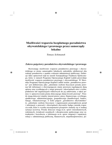 Możliwości wsparcia bezpłatnego poradnictwa obywatelskiego i prawnego przez samorządy lokalne Tomasz Schimanek Zakres pojęciowy poradnictwa obywatelskiego i prawnego Rozważając możliwości wsparcia poradnictwa prawnego i obywatelskiego ze strony samorządów lokalnych, należałoby zdefiniować oba rodzaje poradnictwa z punktu widzenia administracji publicznej. Definicje takie opracował rząd na użytek Europejskiego Funduszu Społecznego, który w ramach Programu Operacyjnego Kapitał Ludzki przewiduje możliwość wsparcia poradnictwa prawnego i obywatelskiego. W Słowniku Programu Operacyjnego Kapitał Ludzki termin „poradnictwo prawne” jest definiowany jako „udzielanie osobom fizycznym porady prawnej lub informacji o obowiązującym stanie prawnym regulującym daną sprawę oraz wynikających z niego prawach i obowiązkach oraz o trybie, podmiocie lub organizacjach właściwych do jej załatwienia, a także pomoc w opracowywaniu pisma dotyczącego danej kwestii prawnej”. Porady mogą dotyczyć między innymi prawa: pracy, finansowego, cywilnego, spadkowego, administracyjnego, gospodarczego (handlowego), budowlanego, własnościowego. Z kolei pojęcie „poradnictwo obywatelskie” to „udzielanie osobom fizycznym i organizacjom pozarządowym porad i informacji o prawach i obowiązkach obywatela będące metodą wsparcia osób, które w wyniku nieznajomości przepisów znalazły się w trudnej sytuacji życiowej. Porady dotyczyć mogą m.in. spraw mieszkaniowych, rodzinnych, świadczeń socjalnych i ubezpieczenia społecznego oraz zatrudnienia i bezrobocia, a informacje m.in. spraw imigracji i repatriacji, relacji z administracją publiczną, finansowych, niepełnosprawności, po- 04_Schimanek.indd 73 2009-09-15 09:15:19 Tomasz Schimanek 74 zbawienia wolności, spraw spadkowych, konsumenckich i własnościowych”1. Definicje zawarte w Słowniku Programu Operacyjnego Kapitał Ludzki nie uwzględniają jednego z istotnych aspektów poradnictwa – jego bezpłatności. Świadczone porady prawne i obywatelskie nie wiążą się bowiem z żadną formą odpłatności ze strony osoby z nich korzystającej, nie są także przedmiotem działalności zarobkowej podmiotu udzielającego porady. Zakres podmiotowy Bezpłatne poradnictwo prawne i obywatelskie – zwłaszcza tak szeroko rozumiane, jak w przytoczonych wyżej definicjach – mogą świadczyć różne podmioty zajmujące się informacją, poradnictwem i pomocą obywatelom. Dotyczy to głównie administracji publicznej, zarówno rządowej, jak i samorządowej. Coraz częściej bezpłatnych porad udzielają także korporacje i samorządy prawnicze. Klasyczne poradnictwo prawne i obywatelskie opiera się jednak na dobrowolności i niedochodowości, jest więc związane przede wszystkim z organizacjami pozarządowymi oraz ruchem uniwersyteckich poradni prawnych, zwanych także często klinikami prawa. W praktyce poradnictwem obywatelskim i prawnym zajmują się najczęściej stowarzyszenia lub fundacje mające osobowość prawną oraz uniwersyteckie poradnie prawne, którym osobowości prawnej udzielają uczelnie wyższe. Poradnictwo prawne i obywatelskie jest także prowadzone w ramach realizacji zadań własnych przez jednostki publiczne i organizacje samorządu prawniczego (na przykład izby radców prawnych). Niniejszy tekst dotyczy poradnictwa świadczonego przez stowarzyszenia i fundacje oraz uniwersyteckie poradnie prawne. Wsparcie finansowe poradnictwa prawnego i obywatelskiego Samorządy lokalne (gmina, powiat) nie mają swobody w zakresie wydatkowania środków publicznych – pełna autonomia finansowa należy wyłącznie do państwa. Oznacza to, po pierwsze, że nikt oprócz państwa nie może stanowić prawa w zakresie finansów publicznych, po drugie, że samorządy mogą wydawać pieniądze publiczne jedynie w formach 1 04_Schimanek.indd 74 http://www.efs.gov.pl/Slownik [dostęp: 4 sierpnia 2009 roku]. 2009-09-15 09:15:20 Możliwości wsparcia bezpłatnego poradnictwa obywatelskiego... 75 przewidzianych prawem (nie mogą robić w tym zakresie niczego, co nie jest dozwolone prawem). Samorządy lokalne wydają pieniądze publiczne na dwa rodzaje zadań: zdania własne i zadania zlecone przez administrację rządową. W zakresie zadań własnych określonych ustawowo samorządy mogą same definiować konkretne działania i wskazywać sposoby ich realizacji lub powierzać realizację tych zadań podmiotom spoza sektora publicznego. Zgodnie z ustawą o finansach publicznych jednostki samorządu terytorialnego mogą udzielać dotacji na cele publiczne związane z realizacją swoich zadań podmiotom niezaliczanym do sektora finansów publicznych i niedziałającym w celu osiągnięcia zysku2. Oznacza to, że o dotacje mogą się ubiegać fundacje i stowarzyszenia prowadzące poradnictwo prawne i obywatelskie, ale nie państwowe szkoły wyższe, należą one bowiem do sektora finansów publicznych. W wypadku niepaństwowych szkół wyższych sytuacja jest mniej jednoznaczna. Istniejące interpretacje skłaniają się ku temu, aby uznać, że warunek niedziałania w celu osiągnięcia zysku spełniają te szkoły wyższe, które zostały utworzone przez podmioty niedziałające w celu osiągnięcia zysku. Jeśli założycielem szkoły jest przedsiębiorca, to warunek ten nie jest spełniony3. Powyższe kryteria oznaczają, że większość uczelni wyższych, w ramach których działają uniwersyteckie poradnie prawne, nie może ubiegać się o dotacje z budżetu samorządów terytorialnych4. Jako podstawową regulację, która powinna być stosowana przy udzielaniu dotacji, ustawa o finansach publicznych wskazuje ustawę o działalności pożytku publicznego i o wolontariacie5. Możliwość zlecania zadań własnych została również przewidziana w samorządowych ustawach kompetencyjnych (ustawa o samorządzie gminnym i ustawa o samorządzie powiatowym)6. Na podstawie ustawy o działalności pożytku publicz2 Ustaw