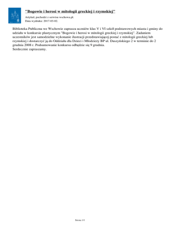 "Bogowie i herosi w mitologii greckiej i rzymskiej" Artykuł‚ pochodzi z serwisu wschowa.pl. Data wydruku: 2017-03-02. Biblioteka Publiczna we Wschowie zaprasza uczniów klas V i VI szkół podstawowych miasta i gminy do udziału w konkursie plastycznym "Bogowie i herosi w mitologii greckiej i rzymskiej". Zadaniem uczestników jest samodzielne wykonanie ilustracji przedstawiającej postać z mitologii greckiej lub rzymskiej i dostarczyć ją do Oddziału dla Dzieci i Młodzieży BP ul. Daszyńskiego 2 w terminie do 2 grudnia 2008 r. Podsumowanie konkursu odbędzie się 9 grudnia. Serdecznie zapraszamy. Strona 1/1 Powered by TCPDF (www.tcpdf.org)