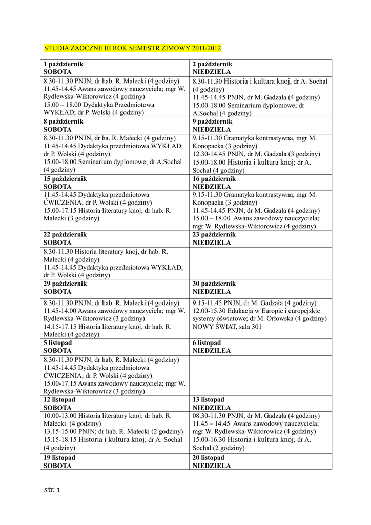 STUDIA ZAOCZNE III ROK SEMESTR ZIMOWY 2011/2012 1 październik SOBOTA 8.30-11.30 PNJN; dr hab. R. Małecki (4 godziny) 11.45-14.45 Awans zawodowy nauczyciela; mgr W. Rydlewska-Wiktorowicz (4 godziny) 15.00 – 18.00 Dydaktyka Przedmiotowa WYKŁAD; dr P. Wolski (4 godziny) 8 październik SOBOTA 8.30-11.30 PNJN, dr ha. R. Małecki (4 godziny) 11.45-14.45 Dydaktyka przedmiotowa WYKŁAD; dr P. Wolski (4 godziny) 15.00-18.00 Seminarium dyplomowe; dr A.Sochal (4 godziny) 15 październik SOBOTA 11.45-14.45 Dydaktyka przedmiotowa ĆWICZENIA, dr P. Wolski (4 godziny) 15.00-17.15 Historia literatury knoj, dr hab. R. Małecki (3 godziny) 22 październik SOBOTA 8.30-11.30 Historia literatury knoj, dr hab. R. Małecki (4 godziny) 11.45-14.45 Dydaktyka przedmiotowa WYKŁAD; dr P. Wolski (4 godziny) 29 październik SOBOTA 8.30-11.30 PNJN; dr hab. R. Małecki (4 godziny) 11.45-14.00 Awans zawodowy nauczyciela; mgr W. Rydlewska-Wiktorowicz (3 godziny) 14.15-17.15 Historia literatury knoj, dr hab. R. Małecki (4 godziny) 5 listopad SOBOTA 8.30-11.30 PNJN, dr hab. R. Małecki (4 godziny) 11.45-14.45 Dydaktyka przedmiotowa ĆWICZENIA; dr P. Wolski (4 godziny) 15.00-17.15 Awans zawodowy nauczyciela; mgr W. Rydlewska-Wiktorowicz (3 godziny) 12 listopad SOBOTA 10.00-13.00 Historia literatury knoj, dr hab. R. Małecki (4 godziny) 13.15-15.00 PNJN; dr hab. R. Małecki (2 godziny) 15.15-18.15 Historia i kultura knoj; dr A. Sochal (4 godziny) 19 listopad SOBOTA str. 1 2 październik NIEDZIELA 8.30-11.30 Historia i kultura knoj, dr A. Sochal (4 godziny) 11.45-14.45 PNJN, dr M. Gadzała (4 godziny) 15.00-18.00 Seminarium dyplomowe; dr A.Sochal (4 godziny) 9 październik NIEDZIELA 9.15-11.30 Gramatyka kontrastywna, mgr M. Konopacka (3 godziny) 12.30-14.45 PNJN, dr M. Gadzała (3 godziny) 15.00-18.00 Historia i kultura knoj; dr A. Sochal (4 godziny) 16 październik NIEDZIELA 9.15-11.30 Gramatyka kontrastywna, mgr M. Konopacka (3 godziny) 11.45-14.45 PNJN, dr M. Gadzała (4 godziny) 15.00 – 18.00 Awans zawodowy nauczyciela; mgr W. Rydlewska-Wiktorowicz (4 godziny) 23 październik NIEDZIELA 30 październik NIEDZIELA 9.15-11.45 PNJN, dr M. Gadzała (4 godziny) 12.00-15.30 Edukacja w Europie i europejskie systemy oświatowe; dr M. Orłowska (4 godziny) NOWY ŚWIAT, sala 301 6 listopad NIEDZILEA 13 listopad NIEDZIELA 08.30-11.30 PNJN, dr M. Gadzała (4 godziny) 11.45 – 14.45 Awans zawodowy nauczyciela; mgr W. Rydlewska-Wiktorowicz (4 godziny) 15.00-16.30 Historia i kultura knoj; dr A. Sochal (2 godziny) 20 listopad NIEDZIELA 8.30 – 11.30 Historia literatury knoj; dr hab. R. Małecki (4 godziny) 11.45-14.45 PNJN; dr hab. R Małecki (4 godziny) 15.00-18.00 Seminarium dyplomowe; dr A. Sochal (4 godziny) 26 listopad SOBOTA 8.30-11.30 PNJN, dr hab. R. Małecki (4 godziny) 11.45-14.45 Awans zawodowy nauczyciela; mgr W. Rydlewska-Wiktorowicz (4 godziny) 15.00-18.45 Seminarium dyplomowe, dr A. Sochal (4 godziny) 3 grudzień SOBOTA 8.30-11.30 Historia literatury knoj, dr hab. R. Małecki (4 godziny) 11.45 -14.45 Dydaktyka przedmiotowa WYKŁAD; dr P.Wolski (4 godziny) 15.00-18.00 Seminarium dyplomowe, dr A. Sochal (4 godziny) 10 grudzień SOBOTA 8.30-11.30 Dydaktyka przedmiotowa WYKŁAD, dr P. Wolski (4 godziny) 11.45-14.45 Awans zawodowy nauczyciela; mgr W. Rydlewska-Wiktorowicz (4 godziny) 15.00 – 18.00 Historia i kultura knoj; dr A. Sochal (4 godziny) 17 grudzień SOBOTA 8.30-11.30 Dydaktyka przedmiotowa WYKŁAD, dr P. Wolski (4 godziny) 11.45-14.45 Awans zawodowy nauczyciela; mgr W. Rydlewska-Wiktorowicz (4 godziny) 24 grudzień SOBOTA WOLNE – BoŜe Narodzenie 31 grudzień SOBOTA WOLNE – Nowy Rok 7 styczeń SOBOTA 8.30 – 10.00 Dydaktyka przedmiotowa WYKŁAD, dr P. Wolski; (2 godziny) 10.15-13.15 Dydaktyka przedmiotowa ĆWICZENIA; dr P. Wolski (4 godziny) 13.30-18.00 Seminarium dyplomowe, dr A. Sochal (6 godzin) 14 styczeń SOBOTA str. 2 8.30-10.45 Gramatyka kontrastywna, mgr M. Konopacka (3 godziny) 12.00-15.30 Edukacja w Europie i europejskie systemy oświatowe; dr M. Orłowska (4 godziny) NOWY ŚWIAT, sala 301 27 listopad NIEDZIELA 4 grudzień NIEDZIELA 12.00-15.30 Edukacja w Europie i europejskie systemy oświatowe; dr M. Orłowska (4 godziny) NOWY ŚWIAT, sala 301 11 grudzień NIEDZIELA 8.30-11.30 Historia i kultura knoj; dr A. Sochal (4 godziny) 11.45-14.45 PNJN, dr M. Gadzała (4 godziny) 15.00-18.00 Historia literatury knoj; dr hab. R. Małecki (4 godziny) 18 grudzień NIEDZIELA 8.30-10.45 Gramatyka kontrastywna, mgr M. Konopacka (3 godziny) 12.00-15.30 Edukacja w Europie i europejskie systemy oświatowe; dr M. Orłowska (4 godziny) NOWY ŚWIAT, sala 301 25 grudzień NIEDZIELA WOLNE – BoŜe Narodzenie 1 styczeń NIEDZIELA WOLNE 8 styczeń NIEDZIELA 8.30-11.30 PNJN, dr hab. R. Małecki (4 godziny) 11.45-14.45 PNJN, dr M. Gadzała (4 godziny) 15 styczeń NIEDZIELA 8.30-11.30 Dydaktyka przedmiotowa WYKŁAD, dr P. Wolski (4 godziny) 11.45-14.45 Historia i kultura knoj, dr A. Sochal (4 godziny) 15.00-17.15 Historia literatury knoj, dr hab. R. Małecki (3 godziny) 21 styczeń SOBOTA 9.15-11.30 Dydaktyka przedmiotowa ĆWICZENIA, dr P. Wolski (3 godziny) 11.45-14.45 Seminarium dyplomowe, dr A. Sochal (4 godziny) 15.00-18.00 Historia i kultura knoj, dr A. Sochal (4 godziny) SESJA ZIMOWA 23.01.2012 – 05.02.2012 str. 3 8.30-10.45 Gramatyka kontrastywna, mgr M. Konopacka (3 godziny) 12.00-15.30 Edukacja w Europie i europejskie systemy oświatowe; dr M. Orłowska (4 godziny) NOWY ŚWIAT, sala 301 22 styczeń NIEDZIELA 8.30-10.45 PNJN; dr M. Gadzała (3 godziny) 12.00-15.30 Edukacja w Europie i europejskie systemy oświatowe; dr M. Orłowska (4 godziny) NOWY ŚWIAT, sala 301