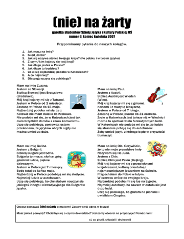(nie) na Ŝarty gazetka studentów Szkoły Języka i Kultury Polskiej UŚ numer 6, koniec kwietnia 2007 Przypominamy pytania do naszych kolegów. 1. 2. 3. 4. 5. 6. 7. 8. 9. Jak masz na imię? Skąd jesteś? Jak się nazywa stolica twojego kraju? (Po polsku i w twoim języku) Z czym/kim kojarzy się twój kraj? Jak długo jesteś w Polsce? Jak długo tu będziesz? Co ci się najbardziej podoba w Katowicach? A co najmniej? Dlaczego uczysz się polskiego? Mam na imię Zuzana. Jestem ze Słowacji. Stolicą Słowacji jest Bratysława (Bratislava). Mój kraj kojarzy mi się z Tatrami. Jestem w Polsce od 2 miesięcy. Zostanę w Polsce do 15 maja. Najbardziej podoba mi się, Ŝe z Katowic nie mam daleko do Krakowa. Nie podoba mi się, Ŝe w Katowicach jest tak duŜo brzydkich domów z czasu komunizmu. Uczę się polskiego, poniewaŜ jestem przekonana, Ŝe języków obcych nigdy nie moŜna umieć za duŜo. Mam na imię Galina. Jestem z Bułgarii. Stolicą Bułgarii jest Sofia. Bułgaria to morze, słońce, góry, gościnni ludzie, piękne dziewczyny. Jestem w Polsce juŜ 7 miesięcy. Będę tutaj do końca maja. Najbardziej w Polsce podobają mi się słodycze. Najmniej ludzie w autobusach. Uczę się polskiego, bo chciałabym nauczyć się jakiegoś innego i nietradycyjnego dla Bułgarów języka. Mam na imię Paul. Jestem z Austrii. Stolicą Austrii jest Wiedeń (Wien). Mój kraj kojarzy mi się z górami, z nartami i z muzyką klasyczną. Jestem w Polsce od 7 lutego. Zostanę w Polsce jeszcze do 31 czerwca. śycie w Katowicach jest tańsze niŜ w Wiedniu i moŜna tu spotkać wielu fantastycznych ludzi. W Katowicach nie podoba mi się to, Ŝe ludzie się strasznie pchają się do autobusów. śeby umieć język, z którego będę w przyszłości tłumaczył. Mam na imię Ola. Oczywiście, Ŝe to nie moje prawdziwe imię Nazywam się He Juan. Jestem z Chin. Stolicą Chin jest Pekin (Beijing). Mój kraj kojarzy mi się z przepięknymi krajobrazami, kulturą orientalną i najsmaczniejszym jedzeniem na świecie. Przyjechałam do Polski w lutym. W czerwcu wrócę do swojego kraju. Najbardziej podoba mi się las na Ligocie. Najmniej autobusy, bo zawsze w autobusie jest duŜo ludzi. Uczę się polskiego, bo grałam na pianinie i uwielbiam Chopina. Chcesz dostawać (nie) na Ŝarty e-mailem? Zostaw swój adres w biurze! Masz jakieś pomysły? Chciałbyś się o czymś dowiedzieć? Jesteśmy otwarci na propozycje! PomóŜ nam! ci, co pisali, składali i drukowali Jedna z grup, chce nam opowiedzieć o... Przeczytajcie! Chcę opowiedzieć o Mołdawii, o moim kraju. Tam jest bardzo ładnie. Ludzie są bardzo szczęśliwi i gościnni. Ogólnie oni są sympatyczni i szczerzy. W moim kraju przyroda jest ładna i waŜna dla mnie. Tam jest bardzo duŜo owoców. Lubię mój kraj. Rodica z Mołdawii Chcę opowiedzieć o moim pokoju. Mój pokój jest mały, ale ładny. Mam tam łóŜko, stół i dwa krzesła. Na stole jest bardzo duŜy nieporządek. Tam jest komputer, ksiąŜki, lampa i inne rzeczy. W rogu pokoju stoi gitara. Taki jest mój pokój. Kaspars z Łotwy Chcę opowiedzieć o mojej koleŜance. Moja koleŜanka nazywa się Petra. Studiuje w tej samej szkole co ja. Mieszka na Słowacji w małym mieście, które się nazywa Dubnica. Ma brata, oni są bliźniakami. Petra jest bardzo dobrą, miłą, sympatyczną dziewczyną. Lubi podróŜować. W zeszłym roku podróŜowałyśmy po Polsce. Byłyśmy w Wadowicach, Krakowie, Częstochowie i Kalwarii Zebrzydowskiej. Bardzo piękne miejsca. Potem byłyśmy w Medjugorie. Tam był Festiwal MłodzieŜy. Monika ze Słowacji Mój pies jest mały i muskularny. On jest francuskim buldogiem. Lubię chodzić z nim na przechadzki i dawać mu jeść. Mieszka z nami w domu, jest bardzo kochany, bo zachowuje się, jak małe dziecko. Lubi bawić się z naszym drugim psem. Psy biegają razem w naszym ogrodzie i są szczęśliwe. Drugi pies ma na imię Akima i jest starszy, wychowuje młodszego, który ma na imię Kolja. Nikola z Czech Chcę opowiedzieć o moim pokoju. To jest dobry pokój. Ma jedno łóŜko i jedną szafę. Ma tylko jedno okno, ale widzę przez nie trzy drzewa. To fajnie. Pokój ma na imię Piotr i jest moim przyjacielem. PoniewaŜ często jestem na uniwersytecie, on często jest smutny. Szkoda. Tom z Niemiec Chcę opowiedzieć o moich podróŜach po Polsce. Najpierw niemal spóźniłyśmy się z Moniką na pociąg w Ostrawie, poniewaŜ pierwszy pociąg miał awarię. Pierwszy tydzień minął bardzo szybko i na weekend, w sobotę byłyśmy w Krakowie. Kraków jest bardzo ładnym miastem. Stare budynki bardzo mi się podobają. Potem przyjechał do Katowic mój chłopak. Zuzana ze Słowacji Chcę opowiedzieć o swoim misiu. Dostałam go na urodziny. Jest bardzo duŜy i mięciutki. Kiedy oglądam horror i boję się, trzymam go mocno. Jest dobrym przyjacielem. Wszędzie biorę go ze sobą. Zawsze mieszkamy razem. Paulína z Czech Opowiem o mojej przyjaciółce. Ona ma na imię Birthe. Znam ją juŜ bardzo długo. Kiedy byłyśmy małymi dziećmi, zawsze bawiłyśmy się razem. Teraz ona mieszka i studiuje w Kolonii (Köln). Mimo tego często się spotykamy i długo rozmawiamy. Miriam z Niemiec Chcę opowiedzieć o moim tacie. Mój tata ma na imię Pintilie. On jest inŜynierem. On jest pracowity. Bardzo lubię grać z nim w szachy. Dla mnie on jest najlepszym ojcem na świecie. Lilia z Mołdawii Olimpiada języka polskiego Wszyscy uczestnicy nocowali w tym samym schronisku w Szklarskiej Porębie. My z Katowic dojechaliśmy tam dzień wcześniej niŜ uczestnicy z innych miast. (Na olimpiadę nauczyciele oraz studenci przyjechali z Wrocławia, Lublina i Katowic.) W Katowicach wtedy juŜ nie było śniegu, ale tam jeszcze zostało go duŜo. Dlatego, mimo Ŝe dojechaliśmy po 22.00 w nocy i byliśmy zmęczeni, bardzo się cieszyliśmy i chcieliśmy się bawić. Pomimo zmęczenia przez chwilę rzucaliśmy śnieŜkami. Następnego dnia po śniadaniu poszliśmy do sklepu