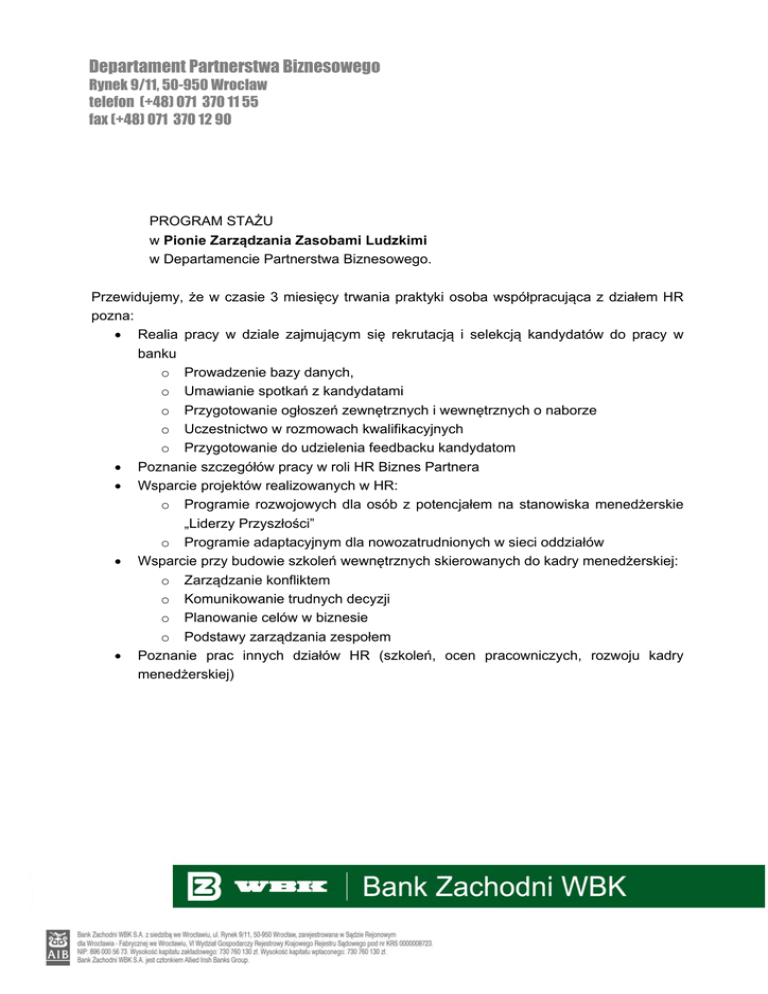 Departament Partnerstwa Biznesowego Rynek 9/11, 50-950 Wrocław telefon (+48) 071 370 11 55 fax (+48) 071 370 12 90 PROGRAM STAŻU w Pionie Zarządzania Zasobami Ludzkimi w Departamencie Partnerstwa Biznesowego. Przewidujemy, że w czasie 3 miesięcy trwania praktyki osoba współpracująca z działem HR pozna: • Realia pracy w dziale zajmującym się rekrutacją i selekcją kandydatów do pracy w banku o Prowadzenie bazy danych, o Umawianie spotkań z kandydatami o Przygotowanie ogłoszeń zewnętrznych i wewnętrznych o naborze o Uczestnictwo w rozmowach kwalifikacyjnych o Przygotowanie do udzielenia feedbacku kandydatom • Poznanie szczegółów pracy w roli HR Biznes Partnera • Wsparcie projektów realizowanych w HR: o Programie rozwojowych dla osób z potencjałem na stanowiska menedżerskie „Liderzy Przyszłości” o Programie adaptacyjnym dla nowozatrudnionych w sieci oddziałów • Wsparcie przy budowie szkoleń wewnętrznych skierowanych do kadry menedżerskiej: o Zarządzanie konfliktem o Komunikowanie trudnych decyzji o Planowanie celów w biznesie o Podstawy zarządzania zespołem • Poznanie prac innych działów HR (szkoleń, ocen pracowniczych, rozwoju kadry menedżerskiej)
