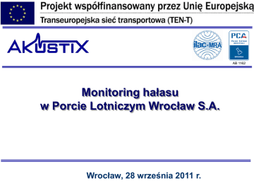 Monitoring hałasu w Porcie Lotniczym Wrocław S.A. Wrocław, 28 września 2011 r. Monitoring hałasu lotniczego w Porcie Lotniczym Wrocław S.A. Podstawa prawna Do 22 lipca 2011 r.: Rozporządzenie Ministra Środowiska z dnia 2 października 2007 r. w sprawie wymagań w zakresie prowadzenia pomiarów poziomów w środowisku substancji lub energii przez zarządzającego drogą, linią kolejową, linią tramwajową, lotniskiem, portem (Dz. U. nr 192, poz. 1392) www.akustix.pl Od 22 lipca 2011 r.: Rozporządzenie Ministra Środowiska z dnia 16 czerwca 2011 r. w sprawie wymagań w zakresie prowadzenia pomiarów poziomów w środowisku substancji lub energii przez zarządzającego drogą, linią kolejową, linią tramwajową, lotniskiem, portem (Dz. U. nr 140, poz. 824) Monitoring hałasu lotniczego w Porcie Lotniczym Wrocław S.A. Analiza zmian w Rozporządzeniu (cd.) Załącznik 1: Referencyjna metodyka wykonywania ciągłych pomiarów poziomów hałasu wprowadzanego do środowiska przez starty, lądowania oraz przeloty statków powietrznych w związku z eksploatacją lotnisk oraz kryteria lokalizacji punktów pomiarowych www.akustix.pl Załącznik 2: Referencyjna metodyka wykonywania okresowych pomiarów poziomów hałasu wprowadzanego do środowiska przez starty, lądowania oraz przeloty statków powietrznych w związku z eksploatacją lotnisk oraz kryteria lokalizacji punktów pomiarowych Monitoring hałasu lotniczego w Porcie Lotniczym Wrocław S.A. Analiza zmian w Rozporządzeniu (cd.) Zgodnie z nowym Rozporządzeniem: Raport miesięczny: wskaźniki jednodobowe (równoważny poziom dźwięku dla pory dziennej, LAeq,D oraz pory nocnej, LAeq,N) www.akustix.pl Raport roczny: długookresowy średni poziom dźwięku LDWN (dzienno-wieczorono-nocny) oraz długookresowy średni poziom dźwięku LN (dla pory nocnej) – możliwość wyznaczania wskaźników długookresowych bez podziału operacji lotniczych na klasy Monitoring hałasu lotniczego w Porcie Lotniczym Wrocław S.A. Analiza zmian w Rozporządzeniu (cd.) Zmiany dot. warunków atmosferycznych, w których można prowadzić pomiary akustyczne w środowisku: – minimalna temperatura powietrza zmieniona z -40 C na -10C – maksymalna dopuszczalna prędkość wiatru zmieniona z 16m/s na 5 m/s www.akustix.pl – zakres dopuszczalnego ciśnienia atmosferycznego zmieniony z 940-1060 na 900-1100 hPa – zmiana wysokości pomiaru warunków meteo z 10 metrów na wysokość od 3.5 do 10 metrów – wprowadzono konieczność rejestracji opadów atmosferycznych Monitoring hałasu lotniczego w Porcie Lotniczym Wrocław S.A. Cel monitoringu www.akustix.pl Wymóg prawny monitoring (raporty) • ocena stanu aktualnego • śledzenie trendów • reakcja na skargi • redukcja hałasu Zintegrowany system zarządzania środowiskiem model obliczeniowy • analiza porealizacyjna • OOU • ROŚ / przegląd ekologiczny • mapa akustyczna + POH • redukcja hałasu Monitoring hałasu lotniczego w Porcie Lotniczym Wrocław S.A. Wykorzystanie monitoringu do redukcji hałasu www.akustix.pl • optymalizacja tras dolotowych i odlotowych (minimalizacja liczby osób narażonych) • profile startów i lądowań • analiza scenariuszy (zmiana typu statku, godziny operacji) •… Monitoring hałasu lotniczego w Porcie Lotniczym Wrocław S.A. Kto może prowadzić monitoring hałasu? Art. 147a ustawy z dnia 27 kwietnia 2001 r. Prawo Ochrony Środowiska z późn. zm. (Dz. U. Nr 25, poz. 150, 2008 r.): „Prowadzący instalację oraz użytkownik urządzenia są obowiązani zapewnić wykonanie pomiarów wielkości emisji lub innych warunków korzystania ze środowiska przez: www.akustix.pl „…akredytowane laboratorium w rozumieniu ustawy z dnia 30 sierpnia 2002 r. o systemie oceny zgodności (Dz. U. z 2004 r. Nr 204, poz. 2087, z późn. zm.)” Monitoring hałasu lotniczego w Porcie Lotniczym Wrocław S.A. Kto może prowadzić monitoring hałasu? (cd.) Art. 15 pkt. 1. ustawy z dnia 30 sierpnia 2002 r. o systemie oceny zgodności (Dz. U. z 2004 r. Nr 204, poz. 2087, z późn. zm.): „Akredytacja jest udzielana przez Polskie Centrum Akredytacji…, po dokonaniu ich oceny i potwierdzeniu, że spełniają wymagania i warunki określone w odpowiednich Polskich Normach…” www.akustix.pl Art. 16 pkt. 1. ww. ustawy: „Dokumentem potwierdzającym udzielenie akredytacji jest certyfikat akredytacji” Monitoring hałasu lotniczego w Porcie Lotniczym Wrocław S.A. Laboratorium akredytowane System zarządzania Laboratorium Badawczego AkustiX jest zgodny z normą PN-EN ISO/IEC 17025:2005 www.akustix.pl • Prawidłowość i wiarygodność badań (kompetencje, wiedza, doświadczenie, wyposażenie, kontrola wewnętrzne i zewnętrzne, itp.) • Metody badań i ich walidacja (stosowanie metod określonych w polskich i europejskich normach oraz Rozporządzeniach Ministra Środowiska, udział w porównaniach międzylaboratoryjnych ) • Systematyczne kontrole (audit PCA – przynajmniej 1 raz w roku) Monitoring hałasu lotniczego w Porcie Lotniczym Wrocław S.A. Dopuszczalne poziomy hałasu w środowisku Rozporządzenie Ministra Środowiska z dnia 14 czerwca 2007 r. w sprawie dopuszczalnych poziomów hałasu w środowisku (Dz. U. Nr 120, poz. 826) – dla startów, lądowań i przelotów statków powietrznych Dopuszczalny poziom dźwięku A [dB] www.akustix.pl Lp Rodzaj terenu a) Strefa ochronna „A” uzdrowiska b) Tereny szpitali, domów opieki społecznej 1 c) Tereny zabudowy zwiàzanej ze stałym lub czasowym pobytem dzieci i młodzieży a) Tereny zabudowy mieszkaniowej jedno- i wielorodzinnej oraz zabudowy zagrodowej i zamieszkania zbiorowego 2 b) Tereny rekreacyjno-wypoczynkowe c) Tereny mieszkaniowo-usługowe d) Tereny w strefie śródmiejskiej miast powyżej 100 tys. mieszkańców LAeq D LAeq N przedział czasu przedział czasu odniesienia równy odniesienia równy 16 godzinom 8 godzinom 60 50 60 50 Monitoring hałasu lotniczego w Porcie Lotniczym Wrocław S.A. www.a