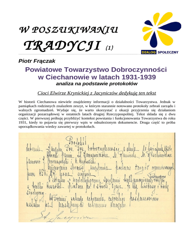 W POSZUKIWANIU TRADYCJI (1) Piotr Frączak Powiatowe Towarzystwo Dobroczynności w Ciechanowie w latach 1931-1939 analiza na podstawie protokołów Cioci Elwirze Krynickiej z Jacyniczów dedykuję ten tekst W historii Ciechanowa niewiele znajdziemy informacji o działalności Towarzystwa. Jednak w pamiątkach rodzinnych znalazłem zeszyt, w którym starannie notowano protokoły zebrań zarządu i walnych zgromadzeń. Wydaje się, że warto skorzystać z okazji przyjrzenia się działaniom organizacji pozarządowej w ostatnich latach drugiej Rzeczypospolitej. Tekst składa się z dwu części. W pierwszej próbuję przybliżyć kontekst powstania i funkcjonowania Towarzystwa do roku 1931, kiedy to pojawia się pierwszy wpis w odnalezionym dokumencie. Druga część to próba uporządkowania wiedzy zawartej w protokołach. Towarzystwo przed 1931 Towarzystwa dobroczynności to forma organizacyjna działalności charytatywnej na ziemiach zaboru rosyjskiego na przełomie wieków. Pierwsze Towarzystwo Dobroczynności powstało w Warszawie jeszcze w roku 1783 z inicjatywy masonerii i działało pod patronatem Stanisława Augusta. Pod zaborami pierwsze Towarzystwa Dobroczynności powstały na Kresach – w Wilnie i w Brześciu Litewskim – w 1807 roku. Właśnie mija 200 lat od założenia Warszawskiego Towarzystwa Dobroczynności1 Kolejne, po warszawskim, to m.in. lubelskie (1815) i krakowskie (1816)2. Dla naszej opowieści ważne jest jeszcze powstanie Towarzystwa Dobroczynności w Płocku w roku 18823. Jego działalność przejęła w 1932 roku Caritas Diecezji Płockiej4. W samym Ciechanowie Towarzystwo Dobroczynności powstało w roku 1903, a więc przed rewolucją 1905 roku i wprowadzeniem ułatwień przy rejestracji stowarzyszeń. Założyła je grupa lokalnych społeczników z małżeństwem Rajkowskich na czele. Zresztą nazwisko doktora Franciszka Rajkowskiego znajdziemy w opisach działalności różnych organizacji przełomu wieków – od straży pożarnej poczynając, a na organizacjach kulturalnych i edukacyjnych kończąc. Towarzystwo już w pierwszym roku zorganizowało choinkę dla 300 dzieci. W roku 1905 otworzono przytułek dla starców (siedmioro bezdomnych) i Sale Zajęć (połączona z nauką rzemiosła tajna szkoła w języku polskim). Towarzystwo było podzielone na dwa wydziały: wsparć i dochodów niestałych i działało w 12 okręgach opiekuńczych w mieście. „Dochody w skali jednego roku 1 2 3 4 Zob. Historya Waszawskiego Towarzystwa Dobroczynności, w: FederalistKa nr 1/2014. Czesław Kępski, Lubelskie Towarzystwo Dobroczynności (1815-1952), KUL 2011. Na stronie płockiej Caritas widnieje data 1881 i informacja, że starania o rejestrację rozpoczęto w roku 1836, czyli zabiegi trwały z górą lat czterdzieści. Andrzej Gretkowski, Działalność Katolickiego Towarzystwa Dobroczynności na terenie diecezji płockiej w latach 1882-1932, w: Notatki Płockie 47/2002. wynosiły 1962 ruble, z tego od członków 891 rb., od trzech dożywotnich po 100 rb., od 181 członków rzeczywistych po 3 rb., a 47 protektorów złożyło się po – 1 rb. Anonimowy ofiarodawca przekazał Towarzystwu 100 rubli. Ważne też były dary w naturze, jak kapusta, kartofle, kasza, mąka, groch, drewno itd. Ich roczną wartość oszacowano na 194 ruble”5. Działalność Towarzystwa w pierwszym okresie była bardzo intensywna. Przypadła mu też „na mocy darowizny testamentalnej Tomasza Dąbrowskiego (...) nieruchomość Nr 208, położona w mieście Ciechanowie”6. Wiemy, że w roku 1910 majątek Towarzystwa zamykał się w niebagatelnej kwocie 6,8 tys. rubli. Przychody z samych składek wyniosły w tym roku 1962 rubli przy wydatkach w wysokości 3085 rubli7. Towarzystwo prowadziło ochronkę, szkołę. Podejmowało różnorodne inicjatywy, m.in. utworzyło Fundację „Kropla Mleka”. Czas wojny to zjednoczenie wszystkich sił społecznych pod szyldem Komitetów Obywatelskich, gdzie różne stowarzyszenia realizowały poszczególne zadania publiczne. W Płocku Towarzystwo Dobroczynności w dużym stopniu przejęło zadania tworzenia systemu pomocy społecznej8, zapewne i ciechanowskie Towarzystwo nie było w tym czasie bezczynne, ale z powodu skąpych danych na temat Komitetu w Ciechanowie nie wiemy, kto prowadził wówczas ochronki9. Kontynuujące 5 6 7 8 9 Edward Lewandowski, Doktor Franciszek Rajkowski i jego Ciechanów, Ciechanów 2001, s. 66. Mariusz Mysiakowski, Ciechanowskie i Mławskie Towarzystwo Dobroczynności – http://mysiakowski.pl/index.php/artykuly/69ciechanowskie-i-mlawskie-towarzystwodobroczynnosci. Edward Lewandowski, Doktor Franciszek Rajkowski i jego Ciechanów, Ciechanów 2001, s. 66. „By łatwiej i skuteczniej Sekcja dobroczynna Komitetu mogła działać – złączyła się odrazu w pewnym zakresie z istniejącym tu oddawna Towarzystwem Dobroczynności Płockiej”, za: Działalność Komitetu Obywatelskiego miasta Płocka w ciągu 5-ciu miesięcy jego pracy, Płock 1915, s. 13. Wg sprawozdania delegata Centralnego Komitetu Obywatelskiego, sporządzonego 19 kwietnia 1915 r. „W Ciechanowe obecnie egzystuje jedna ochrona dla dzieci, licząca ich 140, w nieodpowiednim dla takiej działalność pomocową Komitetów Obywatelskich Rady Opiekuńcze (z Główną Radą Opiekuńczą na czele) przygotowywały podstawy pod przyszły system pomocy oparty na samorządzie. „W celu ujednolicenia działalności instytucji dobroczynnych powołano przy Ciechanowskim Sejmiku Powiatowym Komisję Dobroczynności Publicznej, na czele której stanął ks. Gutkowski z Lekowa. W styczniu 1920 roku, na swym kolejnym posiedzeniu Komisja przejęła w posiadanie dom (...) Wbrew zapowiedziom nie doszło jednak w Ciechanowie do konsolidacji prywatnych i samorządowych instytucji dobroczynnych. Pod kuratelą samorządu powiatowego pozostawało tylko jedno, powiatowe i elitarne schronisko dla sierot o bardzo ograniczonej ilości miejsc noclegowych. Nieco później, bo w 1923 roku,