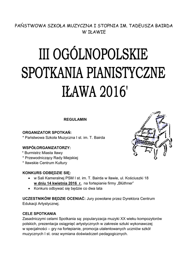 PAŃSTWOWA SZKOŁA MUZYCZNA I STOPNIA IM. TADEUSZA BAIRDA W IŁAWIE REGULAMIN ORGANIZATOR SPOTKAŃ: * Państwowa Szkoła Muzyczna I st. im. T. Bairda WSPÓŁORGANIZATORZY: * Burmistrz Miasta Iławy * Przewodniczący Rady Miejskiej * Iławskie Centrum Kultury KONKURS ODBĘDZIE SIĘ: w Sali Kameralnej PSM I st. im. T. Bairda w Iławie, ul. Kościuszki 18 w dniu 14 kwietnia 2016 r. na fortepianie firmy „Blüthner” Konkurs odbywać się będzie co dwa lata UCZESTNIKÓW BĘDZIE OCENIAĆ: Jury powołane przez Dyrektora Centrum Edukacji Artystycznej. CELE SPOTKANIA Zasadniczymi celami Spotkania są: popularyzacja muzyki XX wieku kompozytorów polskich, prezentacja osiągnięć artystycznych w zakresie sztuki wykonawczej w specjalności – gry na fortepianie, promocja utalentowanych uczniów szkół muzycznych I st. oraz wymiana doświadczeń pedagogicznych. WARUNKI UCZESTNICTWA: W spotkaniach mogą uczestniczyć uczniowie klas II – IV cykl 6 – letni i klasy I – II cyklu 4 – letniego oraz klasa V – VI cyklu 6 – letniego i klasy III – IV cyklu 4 – letniego. Uczestnicy Spotkań Pianistycznych będą oceniani w następujących kategoriach: Kategoria I – klasa II – IV cykl 6 – letni i klasy I – II cyklu 4 – letniego Kategoria II – klasa V – VI cyklu 6 – letniego i klasy III – IV cyklu 4 – letniego Uczestników obowiązuje następujący program: Kategoria I – dwa utwory kompozytora polskiego XX wieku z elementami kontrastującymi (np. utwory J. Garścia, F. Rybickiego, T. Z. Kasserna, K. Serockiego, J. Matuszkiewicza, Z. Popielskiego, P. Perkowskiego,) Kategoria II – dwa utwory kompozytor polskiego XX wieku z elementami kontrastującymi (np. utwory T. Bairda, J. Matuszkiewicza, Z. Popielskiego, P. Perkowskiego, A. Kurylewicza, T. Szeligowski) Program musi być wykonany z pamięci i nie może być niższy od przewidzianego cyklem nauczania. Przesłuchania uczestników konkursu mają przebieg jednoetapowy. Przesłuchania odbywają się w Sali Kameralnej PSM I st., ul. Kościuszki 18 na fortepianie firmy Blüthner. Szkoła zapewnia wszystkim uczestnikom możliwość ćwiczenia w salach dydaktycznych szkoły na fortepianach „Calisia” i „Blüthner” oraz pianinach. JURY KONKURSU: Jury pracować będzie według Regulaminu Pracy Jury. Decyzje Jury są ostateczne. Komisja podejmująca decyzje w sprawie oceniania i nagradzania pracuje w trybie jawnym. NAGRODA: Nagrodą Główną jest Puchar Burmistrza Miasta Iławy i Przewodniczącego Rady Miejskiej. Osoby wyróżnione otrzymają tytuł Laureata i nagrody rzeczowe. Wszyscy uczestnicy Spotkania otrzymają dyplomy uczestnictwa. O przyznaniu i podziale nagród decydować będzie JURY SPOTKAŃ PIANISTYCZNYCH. ORGANIZACJA SPOTKAŃ Zgłoszenia uczniów do udziału w Spotkaniach należy przesłać na adres: Państwowa Szkoła Muzyczna I st. im. T. Bairda ul. Kościuszki 18 14 – 200 Iława e-mali [email protected] do dnia 11 marca 2016 r. Koszty przejazdu, wyżywienia uczestników i osób towarzyszących pokrywają szkoły zgłaszające. W zgłoszeniu należy określić ilość osób zamierzających wykupić obiady. Informacji udziela Sekretariat Szkoły tel. 89 648-40-29 Uprzejmie informujemy, że wpisowe Spotkań wynosi 80 zł od uczestnika. Wpłaty należy dokonać do dnia 11 marca 2016 r. na konto: Rada Rodziców przy PSM w Iławie BS w Iławie nr 95 8831 0002 5001 0111 7623 0001 KARTA ZGŁOSZENIA OGÓLNOPOLSKIE SPOTKANIA PIANISTYCZNE IŁAWA 2016’ IŁAWA, 14 KWIETNIA 2016 R. NAZWISKO I IMIĘ UCZESTNIKA ……………………………………………………………………………… DATA URODZENIA ………………………………………………………………………………………………………….. KLASA ……………………………………………………… CYKL …………………………………………………………… KATEGORIA ………………………………………………………………………………………………………………………… NAUCZYCIEL ……………………………………………………………………………………………………………………… SZKOŁA: ………………………………………………………………………………………………………………………………... ………………………………………………………………………………………………………………………………………………… ADRES: ………………………………………………………………………………………………………………………………... e – mail: ………………………………………………………………………………………………………………………………… PROGRAM: KOMPOZYTOR UTWÓR CZAS 1. ………………………………………. …………………………………………………….. …………………….. 2. ………………………………………. …………………………………………………….. …………………….. ............................................................................. (pieczęć i podpis dyrektora szkoły) WYŻYWIENIE: OBIADY: ............................................ *Formularz zgłoszenia prosimy wypełnić pismem komputerowym lub maszynowym. ZGODA NA PRZETWARZANIE DANYCH OSOBOWYCH ............................................................ miejscowość, data ............................................................................................. Imię i Nazwisko Wyrażam zgodę na przetwarzanie moich danych osobowych, zamieszczonych w zgłoszeniu do II Ogólnopolskiego Spotkania Pianistycznego, przez Organizatorów w/w Konkursu w celu udostępnienia jako informacji zamieszczonych: w informatorach imprezy, na tablicach informacyjnych, na stronach internetowych Organizatorów, w informacjach prasow