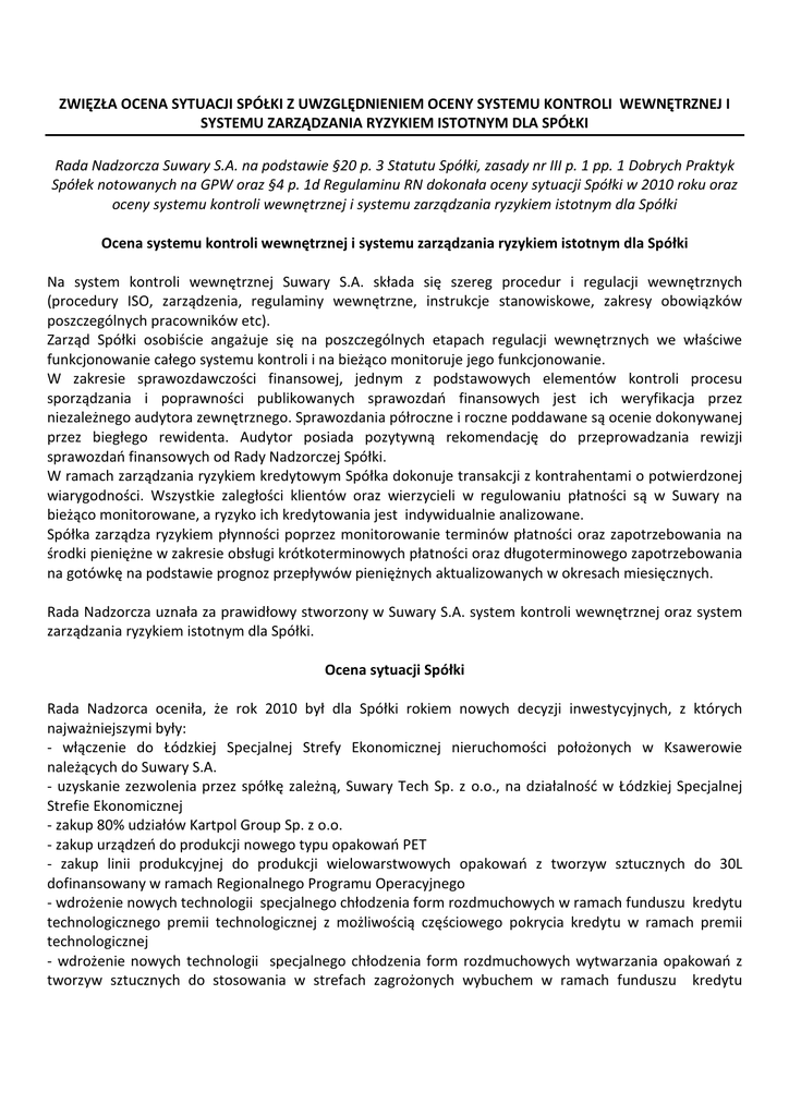 ZWIĘZŁA OCENA SYTUACJI SPÓŁKI Z UWZGLĘDNIENIEM OCENY SYSTEMU KONTROLI WEWNĘTRZNEJ I SYSTEMU ZARZĄDZANIA RYZYKIEM ISTOTNYM DLA SPÓŁKI Rada Nadzorcza Suwary S.A. na podstawie §20 p. 3 Statutu Spółki, zasady nr III p. 1 pp. 1 Dobrych Praktyk Spółek notowanych na GPW oraz §4 p. 1d Regulaminu RN dokonała oceny sytuacji Spółki w 2010 roku oraz oceny systemu kontroli wewnętrznej i systemu zarządzania ryzykiem istotnym dla Spółki Ocena systemu kontroli wewnętrznej i systemu zarządzania ryzykiem istotnym dla Spółki Na system kontroli wewnętrznej Suwary S.A. składa się szereg procedur i regulacji wewnętrznych (procedury ISO, zarządzenia, regulaminy wewnętrzne, instrukcje stanowiskowe, zakresy obowiązków poszczególnych pracowników etc). Zarząd Spółki osobiście angażuje się na poszczególnych etapach regulacji wewnętrznych we właściwe funkcjonowanie całego systemu kontroli i na bieżąco monitoruje jego funkcjonowanie. W zakresie sprawozdawczości finansowej, jednym z podstawowych elementów kontroli procesu sporządzania i poprawności publikowanych sprawozdań finansowych jest ich weryfikacja przez niezależnego audytora zewnętrznego. Sprawozdania półroczne i roczne poddawane są ocenie dokonywanej przez biegłego rewidenta. Audytor posiada pozytywną rekomendację do przeprowadzania rewizji sprawozdań finansowych od Rady Nadzorczej Spółki. W ramach zarządzania ryzykiem kredytowym Spółka dokonuje transakcji z kontrahentami o potwierdzonej wiarygodności. Wszystkie zaległości klientów oraz wierzycieli w regulowaniu płatności są w Suwary na bieżąco monitorowane, a ryzyko ich kredytowania jest indywidualnie analizowane. Spółka zarządza ryzykiem płynności poprzez monitorowanie terminów płatności oraz zapotrzebowania na środki pieniężne w zakresie obsługi krótkoterminowych płatności oraz długoterminowego zapotrzebowania na gotówkę na podstawie prognoz przepływów pieniężnych aktualizowanych w okresach miesięcznych. Rada Nadzorcza uznała za prawidłowy stworzony w Suwary S.A. system kontroli wewnętrznej oraz system zarządzania ryzykiem istotnym dla Spółki. Ocena sytuacji Spółki Rada Nadzorca oceniła, że rok 2010 był dla Spółki rokiem nowych decyzji inwestycyjnych, z których najważniejszymi były: - włączenie do Łódzkiej Specjalnej Strefy Ekonomicznej nieruchomości położonych w Ksawerowie należących do Suwary S.A. - uzyskanie zezwolenia przez spółkę zależną, Suwary Tech Sp. z o.o., na działalność w Łódzkiej Specjalnej Strefie Ekonomicznej - zakup 80% udziałów Kartpol Group Sp. z o.o. - zakup urządzeń do produkcji nowego typu opakowań PET - zakup linii produkcyjnej do produkcji wielowarstwowych opakowań z tworzyw sztucznych do 30L dofinansowany w ramach Regionalnego Programu Operacyjnego - wdrożenie nowych technologii specjalnego chłodzenia form rozdmuchowych w ramach funduszu kredytu technologicznego premii technologicznej z możliwością częściowego pokrycia kredytu w ramach premii technologicznej - wdrożenie nowych technologii specjalnego chłodzenia form rozdmuchowych wytwarzania opakowań z tworzyw sztucznych do stosowania w strefach zagrożonych wybuchem w ramach funduszu kredytu technologicznego premii technologicznej z możliwością częściowego pokrycia kredytu w ramach premii technologicznej Rada Nadzorcza ocenia, że Spółka zarządzana jest prawidłowo i skutecznie. Poprawne i zadowalające wyniki w zakresie sprzedaży, dodatni wynik finansowy oraz właściwa struktura finansowa przejawiająca się w wielkościach wskaźników finansowych pozwalają Radzie Nadzorczej na pozytywną ocenę działania Zarządu Spółki.