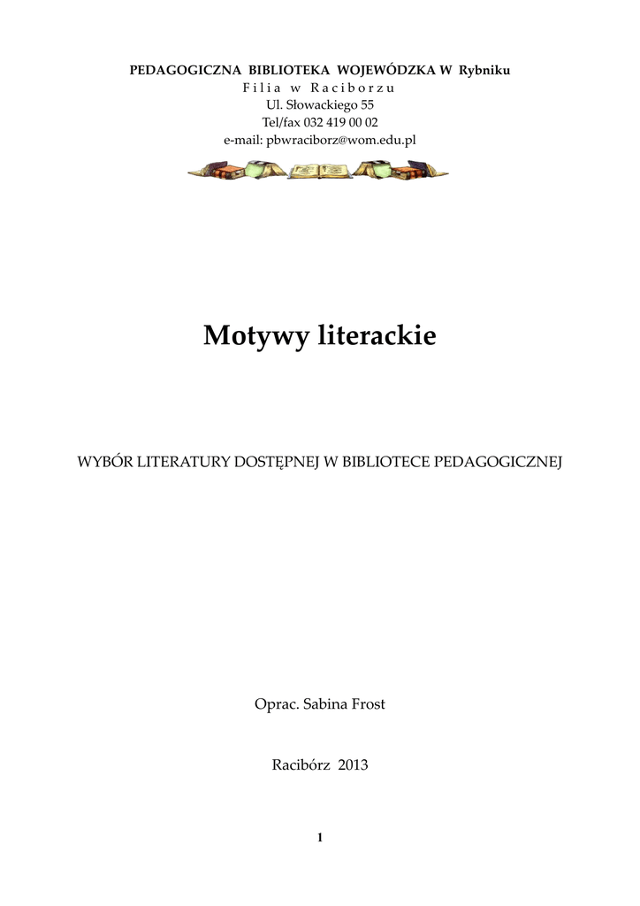 PEDAGOGICZNA BIBLIOTEKA WOJEWÓDZKA W Rybniku Filia w Raciborzu Ul. Słowackiego 55 Tel/fax 032 419 00 02 e-mail: [email protected] Motywy literackie WYBÓR LITERATURY DOSTĘPNEJ W BIBLIOTECE PEDAGOGICZNEJ Oprac. Sabina Frost Racibórz 2013 1 Spis treści A...........................................................................................................................................................7 ALKOHOLIZM...............................................................................................................................7 ANIOŁ.............................................................................................................................................7 ANTYUTOPIA................................................................................................................................7 ARCHITEKTURA..........................................................................................................................7 ARKADIA.......................................................................................................................................7 ARTYSTA........................................................................................................................................8 ASCETYZM....................................................................................................................................8 B...........................................................................................................................................................8 BANAŁ............................................................................................................................................8 BEZDOMNOŚĆ..............................................................................................................................8 BIBLIA............................................................................................................................................8 BIEDA...........................................................................................................................................10 BIESIADA.....................................................................................................................................10 BOHATER.....................................................................................................................................10 BOŻE NARODZENIE..................................................................................................................10 BÓG...............................................................................................................................................11 BRZYDOTA..................................................................................................................................11 BUNT.............................................................................................................................................11 BUTY.............................................................................................................................................11 C.........................................................................................................................................................12 CHLEB..........................................................................................................................................12 CHRYSTUS...................................................................................................................................12 CIAŁO...........................................................................................................................................12 CIERPIENIE..................................................................................................................................12 CISZA............................................................................................................................................13 CZAROWNICE.............................................................................................................................13 CZAS.............................................................................................................................................13 CZŁOWIEK...................................................................................................................................13 D.........................................................................................................................................................13 DAR...............................................................................................................................................13 DETEKTYW.................................................................................................................................13 DIABEŁ, SZATAN........................................................................................................................13 DIALOG........................................................................................................................................14 DOBRY DZIKUS..........................................................................................................................14 DOM..............................................................................................................................................14 DROGA.........................................................................................................................................15 DUSZA..........................................................................................................................................15 DWÓR...........................................................................................................................................15 DZIADEK.......................................................................