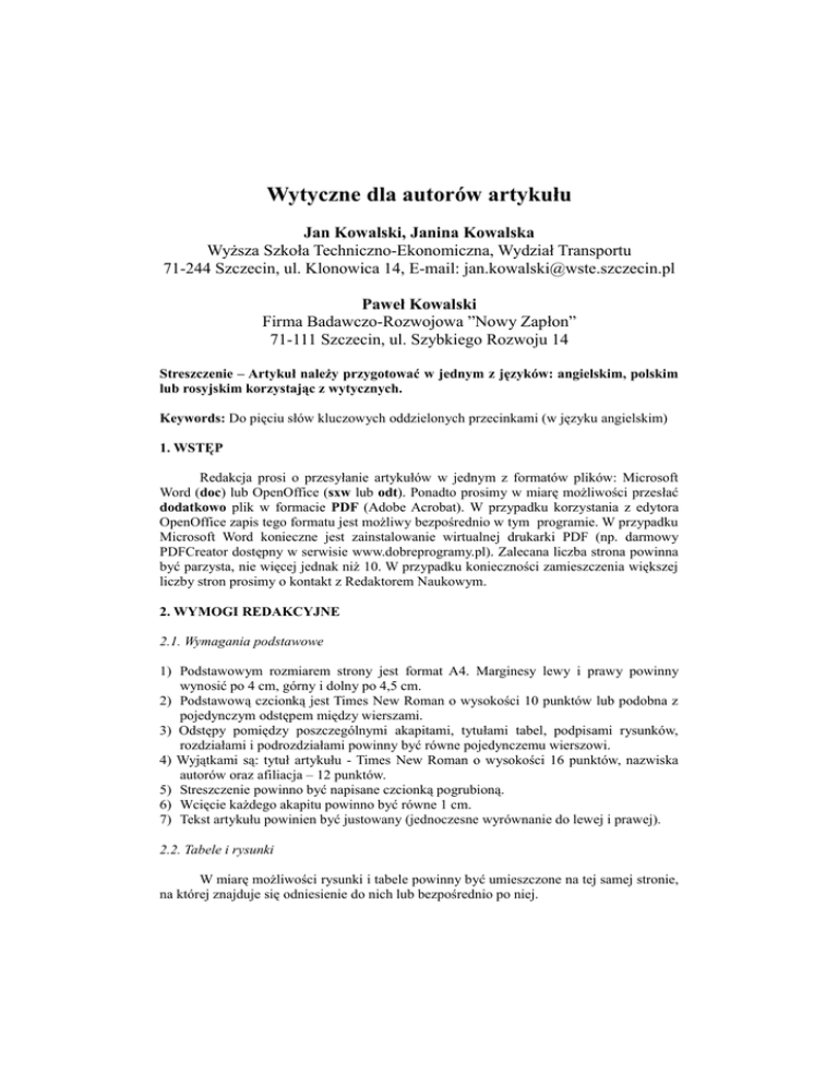 Wytyczne dla autorów artykułu Jan Kowalski, Janina Kowalska Wyższa Szkoła Techniczno-Ekonomiczna, Wydział Transportu 71-244 Szczecin, ul. Klonowica 14, E-mail: [email protected] Paweł Kowalski Firma Badawczo-Rozwojowa ”Nowy Zapłon” 71-111 Szczecin, ul. Szybkiego Rozwoju 14 Streszczenie – Artykuł należy przygotować w jednym z języków: angielskim, polskim lub rosyjskim korzystając z wytycznych. Keywords: Do pięciu słów kluczowych oddzielonych przecinkami (w języku angielskim) 1. WSTĘP Redakcja prosi o przesyłanie artykułów w jednym z formatów plików: Microsoft Word (doc) lub OpenOffice (sxw lub odt). Ponadto prosimy w miarę możliwości przesłać dodatkowo plik w formacie PDF (Adobe Acrobat). W przypadku korzystania z edytora OpenOffice zapis tego formatu jest możliwy bezpośrednio w tym programie. W przypadku Microsoft Word konieczne jest zainstalowanie wirtualnej drukarki PDF (np. darmowy PDFCreator dostępny w serwisie www.dobreprogramy.pl). Zalecana liczba strona powinna być parzysta, nie więcej jednak niż 10. W przypadku konieczności zamieszczenia większej liczby stron prosimy o kontakt z Redaktorem Naukowym. 2. WYMOGI REDAKCYJNE 2.1. Wymagania podstawowe 1) Podstawowym rozmiarem strony jest format A4. Marginesy lewy i prawy powinny wynosić po 4 cm, górny i dolny po 4,5 cm. 2) Podstawową czcionką jest Times New Roman o wysokości 10 punktów lub podobna z pojedynczym odstępem między wierszami. 3) Odstępy pomiędzy poszczególnymi akapitami, tytułami tabel, podpisami rysunków, rozdziałami i podrozdziałami powinny być równe pojedynczemu wierszowi. 4) Wyjątkami są: tytuł artykułu - Times New Roman o wysokości 16 punktów, nazwiska autorów oraz afiliacja – 12 punktów. 5) Streszczenie powinno być napisane czcionką pogrubioną. 6) Wcięcie każdego akapitu powinno być równe 1 cm. 7) Tekst artykułu powinien być justowany (jednoczesne wyrównanie do lewej i prawej). 2.2. Tabele i rysunki W miarę możliwości rysunki i tabele powinny być umieszczone na tej samej stronie, na której znajduje się odniesienie do nich lub bezpośrednio po niej. Podpisy tabel powinny być umieszczane nad tabelami, wycentrowane. Również tabele powinny być wycentrowane. Tabela 1 Przykładowa tabela Zmienna Wartość Opis x 1 Współrzędna X y 2 Współrzędna Y z 3 Współrzędna Z Podpisy rysunków powinny być umieszczone pod rysunkami, wycentrowane. Rysunki powinny być również wycentrowane. Rys. 1. Przykładowy rysunek Jeśli rysunek zawiera oznaczenia np. literowe, skrótowe należy objaśnić je bezpośrednio pod rysunkiem, chyba że są wyjaśnione w podpisie rysunku. Zdjęcia, rysunki i tabele mogą być kolorowe. W przypadku wersji drukowanej będą one jednak zamienione na czarno-białe, natomiast wersja elektroniczna artykułu zawierać będzie wariant kolorowy. Do wersji elektronicznej można również dołączyć krótkie pliki wideo (preferowane pliki avi i mov, mpeg1, mpeg2, mpeg4), które zostaną umieszczone na serwerze razem z dokumentem elektronicznym. W przypadku wklejania zdjęć i rysunków z wykorzystaniem edytora Microsoft Word prosimy o zwrócenie uwagi na sposób wklejania ich przez schowek (powinna być użyta opcja „Wklej specjalnie”) jako Device Independent Bitmap (Mapa Bitowa niezależna od urządzenia) dla zdjęć i Enhanced Metafile (Rozszerzony Metaplik) dla rysunków. W niektórych edytorach możliwe jest bezpośrednie rysowanie rysunków, jednak sugerujemy wykorzystanie programów takich jak np. komercyjne Microsoft Visio, Corel Draw lub darmowy OpenOffice Draw które pozwalają na szybsze i wygodniejsze tworzenie rysunków. 2.3. Równania Wzory należy wyrównywać do lewego marginesu dokumentu. Wzory muszą być numerowane z prawej strony kolejnymi liczbami. Dopuszczalne jest numerowanie wzorów z użyciem dodatkowych liter, jak w poniższym przykładzie ∑ i ⋅ X i, j xc = round i, j ∑ X i, j i, j ∑ j ⋅ X i, j yc = round i, j ∑ X i, j i, j (1a) (1b) Odstęp pomiędzy tekstem a wzorami powinien wynosić jeden wiersz. 2.4. Pozostałe wymagania 1) Używane skróty powinny być rozwinięte w pierwszym miejscu ich użycia. 2) Jednostki powinny być zgodne z Międzynarodowym Układem Jednostek SI. 3) Cytowaną literaturę powinno się umieszczać w nawiasach kwadratowych, przykładowo dla pojedynczych cytowań [1] lub dla grupowych [2-4,6]. 4) Wszystkie pozycje literatury powinny być cytowane, a kolejność pozycji literaturowych w ich spisie powinna wynikać z kolejności cytowań. 5) Prosimy podawać możliwie dokładne informacje o pozycjach literatury, w szczególności numery stron artykułów z czasopism lub materiałów konferencyjnych. 6) Format literatury dla książek, raportów: Pierwsze litery imion, Nazwisko, Tytuł, (Miejsce wydania: Wydawnictwo, rok) strony. 7) Format literatury dla czasopism, konferencji. Pierwsze litery imion, Nazwisko, Tytuł artykułu. Tytuł czasopisma z numerem lub tytuł konferencji (Miejsce wydania: Wydawnictwo, rok) strony. 8) Jeśli dana pozycja literatury jest także dostępna w Internecie, można uzupełnić wpis o adres URL (na końcu). 9) Jeśli artykuł jest w języku angielskim prosimy nie umieszczać dodatkowego tytułu i abstraktu na jego końcu . Jeśli artykuł jest w innym języku, jest to konieczne. 3. LITERATURA [1] J. Kowalski, J. Kowalska, A Low Cost Car Detector, Technical Report no. 315, (Szczecin: Wydawnictwo Nowy Zapłon, 2006) 45-67. [2] J. Kowalski, J. Kowalska, Vision based Car Detector, Proceedings of 10th International Conference on Image Recognition – Paris 2006 (International Conference Publisher, 2006) 15-17. [3] P. Kowalski, Advances in Car Detection, ITS Journal no. 9 Sept. (International Publisher, 2005) 57-78. http://its.wste.szczecin.pl/itsj/2005/9/Kowalski_5.pdf [4] J. Kowalski, J. Kowalska, Vision based Car Detector in Hanbook of Vision Systems (International Publisher, 2006) 78-102. TYTUŁ W JĘZYKU ANGIELSKIM (dla artyk