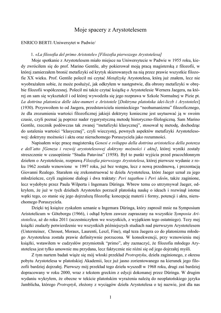 Moje spacery z Arystotelesem ENRICO BERTI /Uniwersytet w Padwie/ 1. «La filosofia del primo Aristotele» [Filozofia pierwszego Arystotelesa] Moje spotkanie z Arystotelesem miało miejsce na Uniwersytecie w Padwie w 1955 roku, kiedy zwróciłem się do prof. Marino Gentile, aby pokierował moją pracą magisterską z filozofii, w której zamierzałem bronić metafizyki od krytyk skierowanych na nią przez prawie wszystkie filozofie XX wieku. Prof. Gentile polecił mi czytać Metafizykę Arystotelesa, którą już znałem, lecz nie wyobrażałem sobie, że może posłużyć, jak odkryłem w następstwie, dla obrony metafizyki w obrębie filozofii współczesnej. Polecił mi także czytać książkę o Arystotelesie Wernera Jaegera, na której on sam się wykształcił i od której wywodziła się jego rozprawa w Szkole Normalnej w Pizie pt. La dottrina platonica delle idee-numeri e Aristotele [Doktryna platońska idei-liczb i Arystoteles] (1930). Przyswoiłem to od Jaegera, przedstawiciela niemieckiego “neohumanizmu” filozoficznego, że dla zrozumienia wartości filozoficznej jakiejś doktryny konieczne jest usytuować ją w swoim czasie, czyli poznać ją poprzez nader rygorystyczną metodę historyczno-filologiczną. Sam Marino Gentile, rzecznik podówczas tak zwanej “metafizyki klasycznej”, stosował tę metodę, dochodząc do ustalenia wartości “klasycznej”, czyli wieczystej, pewnych aspektów metafizyki Arystotelesowej: doktryny możności i aktu oraz nieruchomego Poruszyciela jako rozumności. Napisałem więc pracę magisterską Genesi e sviluppo della dottrina aristotelica della potenza e dell’atto [Geneza i rozwój arystotelesowej doktryny możności i aktu], której wyniki zostały streszczenie w czasopiśmie “Studia Patavina” (1958). Był to punkt wyjścia przed pracochłonnym dziełem o Arystotelesie, rozprawą Filozofia pierwszego Arystotelesa, której pierwsze wydanie z roku 1962 zostało wznowione w 1997 roku, już bez wstępu, lecz z nową przedmową, i prezentacją Giovanni Realego. Starałem się zrekonstruować te dzieła Arystotelesa, które Jaeger uznał za jego młodzieńcze, czyli zaginione dialogi i dwa traktaty: Peri tagathou i Peri ideôn, także zaginione, lecz wydobyte przez Paula Wilperta i Ingemara Düringa. Wbrew temu co utrzymywał Jaeger, odkryłem, że już w tych dziełach Arystoteles porzucił platońską naukę o ideach i rozwinął istotne wątki tego, co stanie się jego dojrzalszą filozofią: koncepcję materii i formy, potencji i aktu, nieruchomego Poruszyciela. Dzięki tej książce zyskałem uznanie u Ingemara Düringa, który zaprosił mnie na Symposium Aristotelicum w Göteborgu (1966), i odtąd byłem zawsze zapraszany na wszystkie Symposia Aristotelica, aż do roku 2011 (uczestniczyłem we wszystkich, z wyjątkiem tego ostatniego). Tezy mej książki znalazły potwierdzenie we wszystkich późniejszych studiach nad pierwszym Arystotelesem (Untersteiner, Chroust, Moraux, Laurenti, Leszl, Fine), stąd teza Jaegera co do platonizmu młodego Arystotelesa została prawie definitywnie porzucona. W konsekwencji, przy wznowieniu mej książki, wstawiłem w cudzysłów przymiotnik “primo”, aby zaznaczyć, że filozofia młodego Arystotelesa jest tylko umownie mu przydana, lecz faktycznie nie różni się od jego dojrzałej myśli. Z tym nurtem badań wiąże się mój włoski przekład Protreptyku, dzieła zaginionego, z okresu pobytu Arystotelesa w platońskiej Akademii, lecz już jasno zorientowanego na kierunek jego filozofii bardziej dojrzałej. Pierwszy mój przekład tego dzieła wyszedł w 1968 roku, drugi zaś bardziej dopracowany w roku 2000, wraz z tekstem greckim z edycji dokonanej przez Düringa. W drugim wydaniu wykryłem, że obecne w tekście platońskim wyrażenia należą do neoplatońskiego języka Jamblicha, którego Protreptyk, złożony z wyciągów dzieła Arystotelesa o tej nazwie, jest dla nas 1 najważniejszym źródłem dla jego rekonstrukcji. Wraz z przekładem Protreptyku zamyka się faza mego zainteresowania zaginionymi pismami Arystotelesa, gdyż odkryłem o wiele bardziej interesujące jego dzieła zachowane. 2. «L’unità del sapere in Aristotele» [Jedność wiedzy u Arystotelesa] Nadal na życzenie Marino Gentilego, którego w międzyczasie stałem się asystentem, poświęciłem się badaniu jedności wiedzy u Arystotelesa, a wyniki zostały opublikowane w książce o tymże tytule w roku 1965. Dociekając przede wszystkim arystotelesowskiej teorii nauki, wyłożonej w I księdze Analityk wtórych, doszedłem do wniosku, że dla Arystotelesa wiedza składa się z wielości nauk, autonomicznych wzajemnie, podług teorii dowodu jako dedukcji z pierwszych niedowodliwych zasad, która nie dopuszcza metabasis eis allo genos [przejścia z jednego rodzaju na drugi]. Niezależnie od tej wielości, która wywodzi się na swój sposób z “wieloznaczności” (homonimii) bytu, Arystoteles przyjmuje pewną naukę, czyli filozofię pierwszą, która bada pierwsze przyczyny całej rzeczywistości i zdoła ustanowić swe własne zasady. Jedność filozofii pierwszej, nazwanej w następstwie “metafizyką”, stała się możliwa przez to, że homonimia bycia nie jest totalna, lecz relatywna, czyli “względem czegoś jednego” (pros hen), wszystkich kategorii względem substancji. Stąd metafizyka staje się nie jednością wiedzy – jak chyba oczekiwał mój mistrz Marino Gentile – lecz “wiedzą jedności”. Z książki tej uznaje nadal za prawomocną teorię wielości nauk i teorię homonimii pros hen, a także obronę, jaka wtedy podjąłem, utożsamienia wiedzy o bycie jako bycie z wiedzą “teologiczną”, którą Arystoteles ustala w VI księdze Metafizyki. Nie uznaję już za prawomocną aplikację, jaką wtedy czyniłem bez poparcia tekstem Arystotelesa, relacji pros hen względem substancji obdarzonej ruchem, czyli zmysłowej, i substancji nieruchomej, oraz wynikającej stąd redukcji