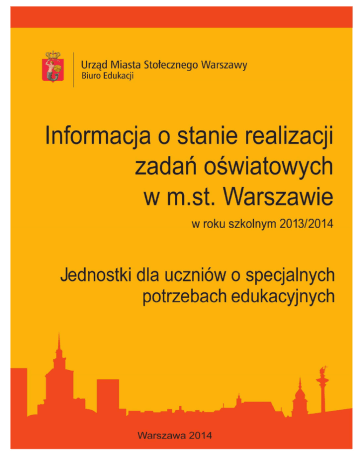 Informacja o stanie realizacji zadań oświatowych w m.st. Warszawie w roku szkolnym 2013/2014 Spis treści 1. Wprowadzenie .................................................................................................... 5 1. Typy jednostek specjalnych.......................................................................................................... 5 2. Rekrutacja..................................................................................................................................... 8 3. Informacje ogólne dot. kształcenia specjalnego .............................................................................. 9 2. Informacje dotyczące placówek kształcenia specjalnego prowadzonych przez m.st. Warszawę ......................................................................................................... 12 1. Dane wg arkuszy organizacji (stan na 31 marca 2014 r.) ............................................................. 12 2. Infrastruktura .................................................................................................................................. 18 3. Własne programy nauczania i innowacje pedagogiczne ............................................................... 20 4.Zajęcia dodatkowe .......................................................................................................................... 22 5. Osiągnięcia .................................................................................................................................... 24 7. Współpraca międzynarodowa........................................................................................................ 30 8. Inne istotne informacje o placówkach specjalnych prowadzonych przez m.st. Warszawę ........... 31 3.Realizacja projektów w ramach Programu Rozwoju Edukacji w latach 2013-2020 37 1. Serwis Pomoc Dziecku ............................................................................................................... 37 2. System wczesnego wspomagania rozwoju dziecka .................................................................. 37 3. Specjalistyczne Punkty Konsultacyjne ....................................................................................... 38 4. Przeciwdziałanie niskiemu poziomowi wykształcenia uczniów zagrożonych niedostosowaniem społecznym ........................................................................................................................................ 41 5. Program „Zima i Lato w mieście” ................................................................................................ 41 6. Młodzieżowa Rada m.st. Warszawy........................................................................................... 41 7. E-pracownie warszawskie .......................................................................................................... 42 4.Wykazy przedszkoli, szkół i placówek specjalnych ................................................ 43 1. Wykaz przedszkoli specjalnych prowadzonych przez m. st. Warszawę .................................... 43 2. Wykaz szkół specjalnych prowadzonych przez m. st. warszawę w roku szk. 2013/2014 ......... 43 Warszawski System Wczesnego Wspomagania Rozwoju Dziecka - wykaz placówek .................... 50 Specjalistyczne punkty konsultacyjne ............................................................................................... 51 3 Informacja o stanie realizacji zadań oświatowych w m.st. Warszawie w roku szkolnym 2013/2014 4 Informacja o stanie realizacji zadań oświatowych w m.st. Warszawie w roku szkolnym 2013/2014 1. Wprowadzenie W szkołach specjalnych kształcą się wyłącznie dzieci i młodzież niepełnosprawne, niedostosowane społecznie i zagrożone niedostosowaniem społecznym, posiadające orzeczenie o potrzebie kształcenia specjalnego. Wszyscy nauczyciele mają specjalne przygotowanie do pracy z dzieckiem niepełnosprawnym pedagogika specjalna, zgodnie z rodzajem niepełnosprawności dzieci. Szkoły są wyposażone w odpowiednie pomoce dydaktyczne i sprzęt służący pracy z dziećmi i młodzieżą zgodnie z ich potrzebami i możliwościami psychofizycznymi. Liczba dzieci w oddziale specjalnym w przedszkolu, szkole podstawowej, gimnazjum, szkole ponadgimnazjalnej jest niewielka i wynosi od 2 do 16 uczniów w zależności od rodzaju niepełnosprawności. 1. Typy jednostek specjalnych Miasto stołeczne Warszawa prowadzi dla dzieci i młodzieży niepełnosprawnych oraz niedostosowanych społecznie, wymagających stosowania specjalnej organizacji nauki i metod pracy przedszkola specjalne, szkoły specjalne i placówki: • przedszkola specjalne – 9, • szkoły specjalne wszystkich typów, w tym szkoły przysposabiające do pracy oraz szkoły, w których prowadzone są grupy rewalidacyjno - wychowawcze dla dzieci i młodzieży upośledzonych umysłowo w stopniu głębokim – 105, • placówki – 16. Przedszkola, szkoły specjalne i placówki prowadzone są przez Biuro Edukacji. Ponadto 6 przedszkoli specjalnych prowadzą Dzielnice m.st. Warszawy. Zasady organizacji roku szkolnego ww. przedszkoli oraz ich grafik dyżurów wakacyjnych ustala i zatwierdza Dyrektor Biura Edukacji. Przedszkola, szkoły i placówki specjalne prowadzone bezpośrednio przez Biuro Edukacji funkcjonują samodzielnie lub w zespołach pod 46 adresami: • przedszkole specjalne- 1 • szkoły specjalne - 2 • zespoły szkół specjalnych – 26, w tym w 1 zespole szkół funkcjonuje przedszkole • specjalne ośrodki szkolno - wychowawcze – 5, w tym w 1 ośrodku funkcjonuje przedszkole • zespół placówek szkolno-wychowawczo-rewalidacyjnych wychowawczy oraz ośrodek rewalidacyjno-wychowawczy) - 1 (specjalny ośrodek szkolno- • młodzieżowe ośrodki wychowawcze – 3, • młodzieżowe ośrodki socjoterapii – 6, • zespół placówek opiekuńczo-wychowawczych (młodzieżowy ośrodek socjoterapii i bursa) - 1 • specj