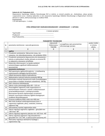 ZAŁĄCZNIK NR 1 DO ZAPYTANIA OFERTOWEGO RCZ/PPR/68/2016 Zadanie Nr 10 / Podzadanie 10.2 Wyposażenie Szpitalnego Oddziału Ratunkowego RCZ w Lubinie, w ramach projektu pn. „Rozbudowa, zakup sprzętu i wyposażenia wraz z budową lądowiska w celu utworzenia Szpitalnego Oddziału Ratunkowego w Regionalnym Centrum Zdrowia w Lubinie, dofinansowanego ze środków POIiŚ. Przeznaczenie: 1.25 sala operacyjna – 1 sztuka STÓŁ OPERACYJNY OGÓLNOCHIRURGICZNY- UNIWERSALNY - 1 SZTUKA ………………………………………………………………………. ( nazwa sprzętu) Typ/model ……………………………………………………………………… Producent ………………………………………………………………………. Kraj Producenta………………………………………………………………… PARAMETRY TECHNICZNE odpowiedź szczegółowy opis parametrów Wykonawcy oferowanego sprzętu TAK/NIE 3 4 lp parametry techniczne –warunki graniczne. 1 1 2 2 ogólne Przedmiot zamówienia fabrycznie nowy, nie używany, nie rekondycjonowany, rok produkcji 2016 Przedmiot zamówienia dopuszczony do stosowania i obrotu w jednostkach służby zdrowia na terenie RP, w załączeniu stosowne certyfikaty Materiały informacyjne ( w języku polskim) potwierdzające zgodność deklarowanych parametrów parametry techniczne Stół operacyjny ogólnochirurgiczny , z możliwością wykonywania zabiegów bariatrycznych Układ sterowania elektro-hydrauliczny Maksymalna nośność kolumny powyżej 400 kg Minimalna nośność dynamiczna stołu (umożliwiająca prace blatu w każdym skrajnym ustawieniu) 350 kg Stół z kolumna teleskopową Zakres ruchu pionowego blatu 60 – 115 cm Poszczególne segmenty stołu wyposażone w demontowane materace z pianki o właściwościach przeciwodleżynowych, z pamięcią kształtu. Bezszwowe łączenia zapewniające szczelność i łatwość czyszczenia materacy ogólnie dostępnymi środkami dezynfekującymi Przesuw wzdłużny blatu stołu min 430 mm Blat stołu budowy wielosegmentowej (min 4 segmenty)-zagłówek, plecy, siedzisko, dzielony segment nóg Zatrzaskowy montaż segmentów stołu Zakres regulacji segmentu zagłówka - góra/dół min +30°/max -90° Zakres regulacji segmentu pleców min +65°/min -40° Zakres regulacji segmentu nóg (niezależnie) – góra/dół min +15°/-90°, w płaszczyźnie poziomej 45° Manualna regulacja odchylenia każdego z segmentów nóg 3 4 5 6 7 8 9 10 11 12 13 14 15 16 17 18 19 podać źródło nr strony oferty 5 1 ZAŁĄCZNIK NR 1 DO ZAPYTANIA OFERTOWEGO RCZ/PPR/68/2016 20 21 22 23 24 25 26 27 28 29 30 31 32 33 34 35 36 37 38 39 40 41 42 43 44 45 46 47 48 49 50 51 Przechył boczny blatu min +/- 20° Trendelenburg/ anty-Trendelenburg min +/- 30° Możliwość uzyskania pozycji blatu względem kolumny normalnej i odwrotnej (180°) System zapobiegający kolizjom elementów ruchomych Sterowanie wszystkimi funkcjami stołu za pomocą pilota Wskaźniki na pilocie: -włącz/wyłącz -stół zablokowany/odblokowany -tryb pozycji odwrotnej -tryb awaryjny -osiągnięcia pozycji skrajnej ruchu segmentów -stan naładowania akumulatora Na pilocie przycisk automatycznego zerowania pozycji blatu Prowadnica kasety RTG na całej długości blatu Przezierność blatu na całej długości Całkowita długość blatu minimum 2100 mm Szerokość blatu minimum 520 mm Na bokach blatu relingi do mocowania dodatkowych akcesoriów . Możliwość swobodnego przesuwania stołu względem podłoża System blokowania stołu oparty na wysuwanych nogach z automatyczna kompensacją nierówności podłoża Dodatkowy pilot awaryjny W przypadku awarii zasilania możliwość sterowania manualnego podstawowymi funkcjami stołu Układ zasilania stołu oparty na akumulatorach Minimalny czas pracy na akumulatorach minimum 3 dni Maksymalny czas ładowania akumulatorów do pełnej sprawności 12 godzin Obudowa stołu uniemożliwiająca penetracje wody natryskiwanej Podpórka pod rękę z opaską mocującą Wsporniki bariatryczne teleskopowe do nóg z systemem mocowania stóp Poszerzenia boczne blatu stołu 4 szt Przesłona anestezjologiczna Pas do mocowania tułowia Pasy mocujące do ud 2 szt Podpory pod stopy mocowane do segmentów nóg Podpory pod nogi typu Goepel umożliwiające przeprowadzanie zabiegów w pozycji litotomijnej Podpory pionowe montowane do bocznych relingów 2 szt pozostałe – warunki gwarancji Termin gwarancji przedmiotu zamówienia min. 24 miesiące ( podać) Przegląd techniczny przedmiotu zamówienia w okresie gwarancji 1 x w roku, bez odrębnej zapłaty wg zaleceń producenta z użyciem elementów- części 2 ZAŁĄCZNIK NR 1 DO ZAPYTANIA OFERTOWEGO RCZ/PPR/68/2016 52 53 54 55 56 57 58 59 60 61 62 63 64 65 66 67 68 niezbędnych do wymiany podczas przeglądu serwisowego, bez odrębnej zapłaty. Czas reakcji serwisu technicznego na zgłoszenie usterki do 48 h od momentu zgłoszenia ( za wyjątkiem dni wolnych od pracy) Czas naprawy w przypadku konieczności wymiany części zamiennych z importu max 5 dni roboczych Bezpłatne użyczenie zastępczego aparatu w przypadku naprawy trwającej dłużej niż 5 dni roboczych W przypadku trzykrotnej naprawy gwarancyjnej tego samego istotnego podzespołu, wymiana aparatu na fabrycznie nowy Wykaz podmiotów upoważnionych przez producenta sprzętu do świadczenia obsługi serwisowej w okresie gwarancji i po gwarancji oraz do sprzedaży części zamiennych i eksploatacyjnych( podać) Zapewnienie po upływie gwarancji dostępu do części zamiennych przez okres co najmniej 10 lat Koszt eksploatacji przedmiotu zamówienia – aktualna lista części, materiałów eksploatacyjnych oraz okresowych części zamiennych ( podać z nazwy, nr katalogowego i cen jednostkowych netto, stawkę podatku VAT i wartość brutto) Instrukcja obsługi w wersji pisemnej i w wersji elektronicznej Karta gwarancyjna Paszport techniczny Przekazanie przedmiotu zamówienia na podstawie 