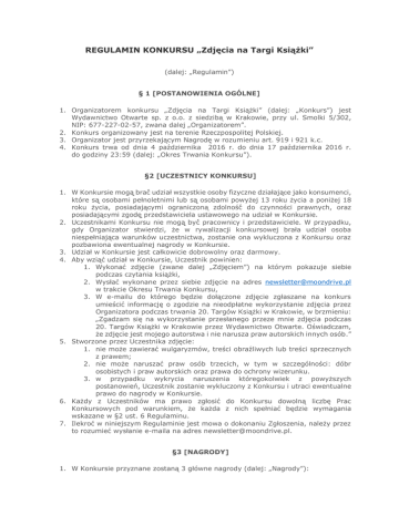 REGULAMIN KONKURSU „Zdjęcia na Targi Książki” (dalej: „Regulamin”) § 1 [POSTANOWIENIA OGÓLNE] 1. Organizatorem konkursu „Zdjęcia na Targi Książki” (dalej: „Konkurs”) jest Wydawnictwo Otwarte sp. z o.o. z siedzibą w Krakowie, przy ul. Smolki 5/302, NIP: 677-227-02-57, zwana dalej „Organizatorem”. 2. Konkurs organizowany jest na terenie Rzeczpospolitej Polskiej. 3. Organizator jest przyrzekającym Nagrodę w rozumieniu art. 919 i 921 k.c. 4. Konkurs trwa od dnia 4 października 2016 r. do dnia 17 października 2016 r. do godziny 23:59 (dalej: „Okres Trwania Konkursu”). §2 [UCZESTNICY KONKURSU] 1. W Konkursie mogą̨ brać́ udział wszystkie osoby fizyczne działające jako konsumenci, które są̨ osobami pełnoletnimi lub są̨ osobami powyżej 13 roku życia a poniżej 18 roku życia, posiadającymi ograniczoną zdolność́ do czynności prawnych, oraz posiadającymi zgodę̨ przedstawiciela ustawowego na udział w Konkursie. 2. Uczestnikami Konkursu nie mogą̨ być́ pracownicy i przedstawiciele. W przypadku, gdy Organizator stwierdzi, że w rywalizacji konkursowej brała udział osoba niespełniająca warunków uczestnictwa, zostanie ona wykluczona z Konkursu oraz pozbawiona ewentualnej nagrody w Konkursie. 3. Udział w Konkursie jest całkowicie dobrowolny oraz darmowy. 4. Aby wziąć udział w Konkursie, Uczestnik powinien: 1. Wykonać zdjęcie (zwane dalej „Zdjęciem”) na którym pokazuje siebie podczas czytania książki, 2. Wysłać wykonane przez siebie zdjęcie na adres [email protected] w trakcie Okresu Trwania Konkursu, 3. W e-mailu do którego będzie dołączone zdjęcie zgłaszane na konkurs umieścić informację o zgodzie na nieodpłatne wykorzystanie zdjęcia przez Organizatora podczas trwania 20. Targów Książki w Krakowie, w brzmieniu: „Zgadzam się na wykorzystanie przesłanego przeze mnie zdjęcia podczas 20. Targów Książki w Krakowie przez Wydawnictwo Otwarte. Oświadczam, że zdjęcie jest mojego autorstwa i nie narusza praw autorskich innych osób.” 5. Stworzone przez Uczestnika zdjęcie: 1. nie może zawierać wulgaryzmów, treści obraźliwych lub treści sprzecznych z prawem; 2. nie może naruszać praw osób trzecich, w tym w szczególności: dóbr osobistych i praw autorskich oraz prawa do ochrony wizerunku. 3. w przypadku wykrycia naruszenia któregokolwiek z powyższych postanowień, Uczestnik zostanie wykluczony z Konkursu i utraci ewentualne prawo do nagrody w Konkursie. 6. Każdy z Uczestników ma prawo zgłosić do Konkursu dowolną liczbę Prac Konkursowych pod warunkiem, że każda z nich spełniać będzie wymagania wskazane w §2 ust. 6 Regulaminu. 7. Ilekroć w niniejszym Regulaminie jest mowa o dokonaniu Zgłoszenia, należy przez to rozumieć wysłanie e-maila na adres [email protected]. §3 [NAGRODY] 1. W Konkursie przyznane zostaną 3 główne nagrody (dalej: „Nagrody”): 2. 3. 4. 5. 1. Pierwsza nagroda: Kubek „Wyśnione miejsca”, notatnik „Mroczne umysły” oraz 5 książek Moondrive wybranych przez Komisję (dalej: „Nagroda Główna”), 2. Druga nagroda: kubek „Never never”, notatnik „Mroczne umysły” oraz 3 książki Moondrive wybrane przez Komisję, 3. Trzecia nagroda: kubek, notatnik „Mroczne umysły” oraz 2 książki Moondrive wybrane przez Komisję. Laureaci Konkursu nie mają prawa do wymiany Nagrody na nagrodę innego rodzaju, ani żądania wypłacenia ekwiwalentu pieniężnego Nagrody. Laureat Konkursu nie ma prawa do przeniesienia prawa do Nagrody na osoby trzecie. Jednemu Uczestnikowi może zostać przyznana nie więcej niż jedna Nagroda. Organizator zastrzega sobie prawo do przyznania dodatkowych, niewymienionych w ust. 1 powyżej, nagród. §4 [PRZEBIEG KONKURSU] 1. Organizator powoła komisję konkursową (zwaną dalej „Komisją”), złożoną z 3 pracowników Organizatora, 2. Komisja spośród nadesłanych prac wybierze trzy, w jej ocenie najlepsze, którym przyzna kolejno pierwszą, drugą i trzecią nagrodę, 3. Komisja konkursowa może wyróżnić większą ilość prac, 4. W przypadku, gdy okaże się, że wśród nagrodzonych Prac Konkursowych znajduje się kilka Prac Konkursowych jednego Uczestnika, przy przyznawaniu Nagród zostanie uwzględniona wyłącznie jedna z nich, 5. Wszyscy Uczestnicy, którym przysługuje Nagroda (dalej: „Laureaci”), zostaną powiadomieni o wygranej do dnia 24 października 2016 za pomocą stosownej wiadomości email wysłanej na adres Laureata z którego zostało przysłane zgłoszenie. 6. Laureat jest zobowiązany do wysłania w terminie do dnia 31 października 2016 r. na adres [email protected] (z adresu, na który nadeszło powiadomienie o wygranej), wiadomości email zawierającej dane osobowe Laureata w postaci imienia, nazwiska, adresu do wysyłki nagrody, 7. W przypadku nieotrzymania od Laureata do dnia 31 października 2016 r. wiadomości email, o której mowa w ust. 9 powyżej, Uczestnik ten traci prawo do Nagrody. 8. Nagrody zostaną wysłane Laureatom do dnia 30 listopada 2016 w formie przesyłki kurierskiej na adres podany w nadesłanej wiadomości email. 9. W przypadku, gdy przesyłka z Nagrodą powróci do Organizatora jako nieodebrana przez Uczestnika (pomimo dwukrotnego awizowania), Uczestnik traci prawo do Nagrody. 10. Lista Laureatów (zawierająca imiona oraz nazwy miejscowości zamieszkania Laureatów) zostanie opublikowana w terminie od dnia 24 października 2016 r. na fanpage Moondrive Książki na Facebooku (znajdującym się pod adresem http:// https://www.facebook.com/MoondriveKsiazki/). §5 [REKLAMACJE] 1. Reklamacje co do przebiegu Konkursu mogą być zgłaszane e-mailowo na adres [email protected] 2. Prawo złożenia reklamacji przysługuje jedynie Uczestnikom Konkursu. 3. Wiadomość z reklamacją powinna zawierać w temacie słowo „Reklamacja” oraz zawierać: imię, nazwisko, dokładny adres Uczestnika jak również dokładny opis i wskazanie przyczyny reklamacji. 4. Reklamacje 