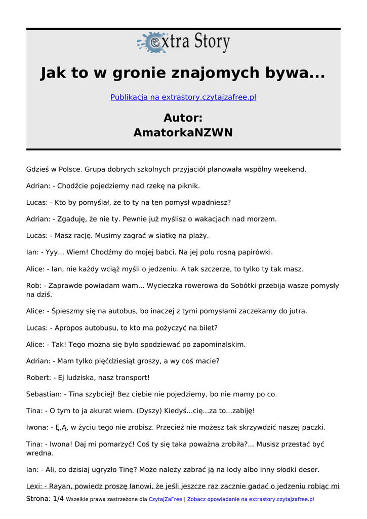 Jak to w gronie znajomych bywa... Publikacja na extrastory.czytajzafree.pl Autor: AmatorkaNZWN Gdzieś w Polsce. Grupa dobrych szkolnych przyjaciół planowała wspólny weekend. Adrian: - Chodźcie pojedziemy nad rzekę na piknik. Lucas: - Kto by pomyślał, że to ty na ten pomysł wpadniesz? Adrian: - Zgaduję, że nie ty. Pewnie już myślisz o wakacjach nad morzem. Lucas: - Masz rację. Musimy zagrać w siatkę na plaży. Ian: - Yyy... Wiem! Chodźmy do mojej babci. Na jej polu rosną papirówki. Alice: - Ian, nie każdy wciąż myśli o jedzeniu. A tak szczerze, to tylko ty tak masz. Rob: - Zaprawde powiadam wam... Wycieczka rowerowa do Sobótki przebija wasze pomysły na dziś. Alice: - Śpieszmy się na autobus, bo inaczej z tymi pomysłami zaczekamy do jutra. Lucas: - Apropos autobusu, to kto ma pożyczyć na bilet? Alice: - Tak! Tego można się było spodziewać po zapominalskim. Adrian: - Mam tylko pięćdziesiąt groszy, a wy coś macie? Robert: - Ej ludziska, nasz transport! Sebastian: - Tina szybciej! Bez ciebie nie pojedziemy, bo nie mamy po co. Tina: - O tym to ja akurat wiem. (Dyszy) Kiedyś...cię...za to...zabiję! Iwona: - Ę,Ą, w życiu tego nie zrobisz. Przecież nie możesz tak skrzywdzić naszej paczki. Tina: - Iwona! Daj mi pomarzyć! Coś ty się taka poważna zrobiła?... Musisz przestać być wredna. Ian: - Ali, co dzisiaj ugryzło Tinę? Może należy zabrać ją na lody albo inny słodki deser. Lexi: - Rayan, powiedz proszę Ianowi, że jeśli jeszcze raz zacznie gadać o jedzeniu robiąc mi Strona: 1/4 Wszelkie prawa zastrzeżone dla CzytajZaFree | Zobacz opowiadanie na extrastory.czytajzafree.pl ochotę, to nawet święty Boże mu nie pomoże. Rayan: - Myślę, że Ian nie jest głuchy, a my nie cofnęliśmy się w rozwoju, co mnie cieszy, bo zabawy w głuchy telefon nie lubiłem. Lexi: - Mogłam cię poprosić, żebyś zdzielił przez łeb Iana. To byś zrobił bez gadania. Rayan: - Ach, to fakt. Lucas: - Ta, nie chciałbym przeszkadzać w ważnej, ambitnej konwersacji, jednak nadal nie mam biletu, więc jak zobaczycie kontrolera, to kryjcie mnie. Alice: - Ech, ironio losu, dlaczego ze mnie tak drwisz? Lexi: - Zapytałabym co ci odbiło, lecz chyba wolę nie wiedzieć bo kontroler przed nami. Adrian: - No, to przymusowy przystanek. Jak rozumiem wysiadamy przy Z.O.O.? Robert: - Tina, do dzieła. Tina: - Ach, nie ma to jak ratować tyłki kumplom, którzy wcześniej czepiali się twojich tekstów sugerując, że ci odbiło. Ian: - O, przepraszam. Lexi: - Mamusiu niech mnie! To on zna to słowo? Ian: - Ooo. Też mi zabawny tekst. Robert: -Trzcigodna Alice, mogłabyś napisać do Tiny podziękowania od nas wszystkich, a w szczególności od Iana i Sebastiana? Alice: - A, jasne, że mogę. Myślę jednak, iż oni sami powinni mnie o to poprosić. Sebastian: - Oczywiście Alice gdybyś mogła wysłać Tinie podziękowania przedewszystkim za moje pośpieszanie, byłbym ci dozgonnie wdzięczny. Uczynisz to dla mnie? Alice: - Ech, nie ma sprawy. To w końcu nic takiego jak się ma numer. Adrian: - Raz zastanawiałem się, dlaczego, będąc tak skrytą osobą, dała swój numer właśnie tobie i tylko tobie. Jakoś nie rozwikłałem tej zagadki. Iwona: - I jak się z tym czujesz? Adrian: - Zasmucony. To nic miłego. Sebastian: - O! To tak jak ja się czuję, gdy wysyłacie Tinę na podryw kanara, żeby nie wypisał wam kary za jazdę bez biletu. Lexi: - Uuu. Czemu ja o tym wcześniej nic nie wiedziałam? Iwona: - Może nie zawsze musisz być pierwsza? Lexi: - Ale co do twojego bycia wredną, to Tina się nie myliła. Zmusimy cię do skończenia z Strona: 2/4 Wszelkie prawa zastrzeżone dla CzytajZaFree | Zobacz opowiadanie na extrastory.czytajzafree.pl tym. Robert: Może się mylę, lecz odniosłem wrażenie, iż nadeszła najwyższa pora, aby zmienić temat rozmów. Sebastian: - Wróćmy do weekendu. Skoro rowerami do Sobótki i pieszo po górach, to co zabieramy, żeby się na szczycie nie nudzić? No, i czy wogóle damy radę do szczytu dojść?... Włączcie się do tematu, komon. Iwona: - Na szczyt prowadzą szlaki. Najdłuższy jest zarazem najłatwiejszy, bo się idzie prostą udeptaną drogą, a w przypadku krótszych trzeba iść po skałach. Adrian: - Chodzimy najdłuższym szlakiem. Tak w skrócie. Lucas: - Ej, a co powiecie jak ogłoszę, że mogę nam załatwić zimne ognie? Lexi: - Ewentualnie oznaczałoby to szaloną imprezkę na całego. Lucas: - Ooo. W to, to wszyscy w ciemno wchodzą. Alice: - A co do zimnych ogni? Same nie wystarczą nam do szaleństw. Robert: - Wiecie, mogę przynieść kolorowe pyłki jakimi sypią się w Indiach w święto Holi. Łatwo się zmywają, a ubawu, by nie brakowało. Iwona: - Ooo. A skąd ty masz takie rzeczy? Robert: - Ym. Oficialnie, to ja ich nie mam, jednak babcia jest Hinduską i ma ich mnustwo, dlatego zaproponowałem, że mogę jej ich trochę złużyć w szkole. Lexi: - Eee. Nie kituj, że kupiła tą ściemę. Robert: - Niby, dlaczego miałaby nie uwierzyć, skoro w Indiach jest niewiele szkół i ona nie ma pojęcia jak wyglądają tutejsze szkoły i ogółem życie tu. Adrian: - Uch. Jak ja ci zazdroszczę. Też chciałbym tak mieć. Niestety cała moja rodzina ograniczyła się do mieszkania w Polsce. Nie wiem co im się tu tak podoba, bo dla mnie to przysłowiowe "zadupie". Robert: - Elo tu Ziemia. Nasz przystanek. Wysiedli. Pożegnali się na przystanku i każdy poszedł w swoją stronę. Dalszy kontakt był SMS-owy. W wiadomościach tekstowych ustalili między innymi, że na wypad zabierają aparat cyfrowy jako jedyne urządzenie, a poza tym mają być niemal jak odcięci od świata. Bez internetu, telefonów, gierek do telewizora i tym podobnych. Spotkanie po któtkiej przerwie. Sobota 8:00. Iwona: - Jak tam wszyscy żyją? Lucas: - Ą, Ę. Ja umieram, jeśli już pytasz. Iwona: - Zaspany. Odrazu wiadomo, bo pomyliłeś początek, było ę,ą, a nie odwrotnie. Strona: 3/4 Wszelkie prawa zastrzeżon