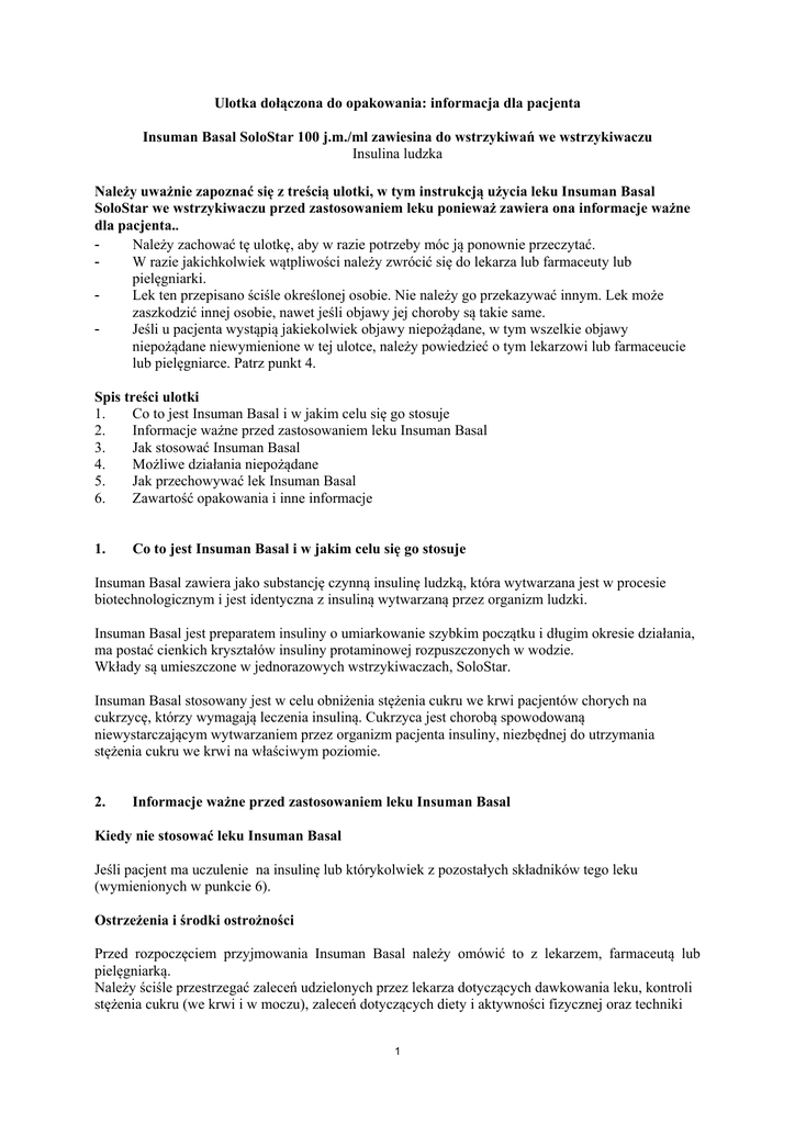 Ulotka dołączona do opakowania: informacja dla pacjenta Insuman Basal SoloStar 100 j.m./ml zawiesina do wstrzykiwań we wstrzykiwaczu Insulina ludzka Należy uważnie zapoznać się z treścią ulotki, w tym instrukcją użycia leku Insuman Basal SoloStar we wstrzykiwaczu przed zastosowaniem leku ponieważ zawiera ona informacje ważne dla pacjenta.. Należy zachować tę ulotkę, aby w razie potrzeby móc ją ponownie przeczytać. W razie jakichkolwiek wątpliwości należy zwrócić się do lekarza lub farmaceuty lub pielęgniarki. Lek ten przepisano ściśle określonej osobie. Nie należy go przekazywać innym. Lek może zaszkodzić innej osobie, nawet jeśli objawy jej choroby są takie same. Jeśli u pacjenta wystąpią jakiekolwiek objawy niepożądane, w tym wszelkie objawy niepożądane niewymienione w tej ulotce, należy powiedzieć o tym lekarzowi lub farmaceucie lub pielęgniarce. Patrz punkt 4. Spis treści ulotki 1. Co to jest Insuman Basal i w jakim celu się go stosuje 2. Informacje ważne przed zastosowaniem leku Insuman Basal 3. Jak stosować Insuman Basal 4. Możliwe działania niepożądane 5. Jak przechowywać lek Insuman Basal 6. Zawartość opakowania i inne informacje 1. Co to jest Insuman Basal i w jakim celu się go stosuje Insuman Basal zawiera jako substancję czynną insulinę ludzką, która wytwarzana jest w procesie biotechnologicznym i jest identyczna z insuliną wytwarzaną przez organizm ludzki. Insuman Basal jest preparatem insuliny o umiarkowanie szybkim początku i długim okresie działania, ma postać cienkich kryształów insuliny protaminowej rozpuszczonych w wodzie. Wkłady są umieszczone w jednorazowych wstrzykiwaczach, SoloStar. Insuman Basal stosowany jest w celu obniżenia stężenia cukru we krwi pacjentów chorych na cukrzycę, którzy wymagają leczenia insuliną. Cukrzyca jest chorobą spowodowaną niewystarczającym wytwarzaniem przez organizm pacjenta insuliny, niezbędnej do utrzymania stężenia cukru we krwi na właściwym poziomie. 2. Informacje ważne przed zastosowaniem leku Insuman Basal Kiedy nie stosować leku Insuman Basal Jeśli pacjent ma uczulenie na insulinę lub którykolwiek z pozostałych składników tego leku (wymienionych w punkcie 6). Ostrzeżenia i środki ostrożności Przed rozpoczęciem przyjmowania Insuman Basal należy omówić to z lekarzem, farmaceutą lub pielęgniarką. Należy ściśle przestrzegać zaleceń udzielonych przez lekarza dotyczących dawkowania leku, kontroli stężenia cukru (we krwi i w moczu), zaleceń dotyczących diety i aktywności fizycznej oraz techniki 1 wstrzyknięć insuliny. Należy powiadomić lekarza, jeśli pacjent ma alergię na ten lek lub na insulinę pochodzenia zwierzęcego. Szczególne grupy pacjentów Jeśli występują problemy z wątrobą lub nerkami lub pacjent jest w podeszłym wieku należy porozmawiać o tym z lekarzem gdyż może wymagać to zmniejszenia dawki. Podróże Przed udaniem się w podróż należy omówić z lekarzem następujące zagadnienia: dostępność stosowanej insuliny w kraju docelowym, zaopatrzenie w insulinę, strzykawki itd, właściwe przechowywanie insuliny w czasie podróży, czas spożywania posiłków i przyjmowania insuliny w czasie podróży, ewentualne skutki zmiany strefy czasowej, ewentualne nowe czynniki ryzyka dotyczące zdrowia w kraju docelowym, co powinno się zrobić w sytuacjach zagrożenia gdy pacjent źle się poczuje lub zachoruje. Choroby i urazy W następujących przypadkach kontrolowanie cukrzycy powinno być bardzo staranne: wystąpienie choroby lub poważny uraz mogą stać się przyczyną wzrostu stężenia cukru we krwi (hiperglikemii), w przypadku spożycia zbyt małej ilości pokarmu stężenie cukru we krwi może się obniżyć (hipoglikemia). Często konieczna jest pomoc lekarza. Pacjent powinien mieć zapewniony szybki kontakt z lekarzem. Pacjenci z cukrzycą typu 1 (cukrzyca insulinozależna) powinni przyjmować dostateczną ilość węglowodanów i kontynuować leczenie insuliną. Osoby opiekujące się pacjentem powinny być poinformowane o konieczności stosowania insuliny przez pacjenta. U niektórych pacjentów z długotrwającą cukrzycą typu 2. i chorobą serca lub przebytym wcześniej udarem mózgu, leczonych jednocześnie pioglitazonem i insuliną wystąpiła niewydolność serca. Jeśli wystąpią objawy niewydolności serca, takie jak nietypowe skrócenie oddechu lub szybki wzrost masy ciała lub miejscowe obrzęki, należy jak najszybciej poinformować o tym lekarza. Insuman Basal a inne leki Niektóre leki powodują zmiany stężenia cukru we krwi (zmniejszenie, zwiększenie albo jedno i drugie, zależnie od sytuacji). W każdym z takich przypadków konieczna może być zmiana dawki insuliny aby uniknąć zbyt małego lub zbyt dużego stężenia cukru we krwi. Wskazane jest zachowanie ostrożności podczas rozpoczynania stosowania innego leku lub podczas kończenia jego przyjmowania. Należy powiedzieć lekarzowi o wszystkich lekach przyjmowanych przez pacjenta obecnie lub ostatnio, a także o lekach, które pacjent planuje przyjmować. Przed zastosowaniem nowego leku należy ustalić z lekarzem, jaki wpływ może mieć ten lek na stężenie cukru we krwi i jakie, jeśli zajdzie potrzeba, środki zaradcze należy podjąć. Do leków, które mogą powodować zmniejszenie stężenia cukru we krwi (hipoglikemia) należą: wszystkie inne leki w leczeniu cukrzycy, inhibitory enzymu konwertazy angiotensyny (ACE) (stosowane w leczeniu niektórych chorób serca lub wysokiego ciśnienia krwi), dyzopiramid (stosowany w leczeniu niektórych chorób serca), 2 - fluoksetyna (stosowana w leczeniu depresji), fibraty (stosowane do obniżenia podwyższonego poziomu tłuszczów we krwi), inhibitory monoaminooksydazy (MAO) (stosowane w leczeniu depresji), pentoksyfilina, propoksyfen, salicylany (takie jak kwas acetylosalicylowy stosowany w łagodzeniu bólu i obniżaniu gorączki), antybiotyki sulfonamidowe. D