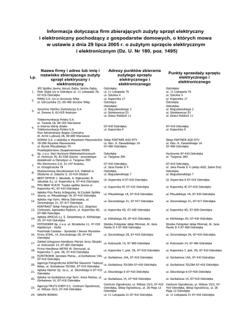 Informacja dotycząca firm zbierających zużyty sprzęt elektryczny i elektroniczny pochodzący z gospodarstw domowych, o których mowa w ustawie z dnia 29 lipca 2005 r. o zużytym sprzęcie elektrycznym i elektronicznym (Dz. U. Nr 180, poz. 1495) Lp. 1. 2. 3. 4. 5. 6. 7. 8. 9. 10. 11. 12. 13. 14. 15. 16. 17. 18. 19. 20. 21. 22. 23. Nazwa firmy i adres lub imię i nazwisko zbierającego zużyty sprzęt elektryczny i elektroniczny JPZ Spółka Jawna Janusz Zięba, Janina Zięba, Piotr Zięba z/s w Ostrołęce ul. 11 Listopada 76; 07-410 Ostrołęka MARS S.A. z/s w Gorzowie Wlkp ul. Górczyńska 23; 66-400 Gorzów Wlkp. Jeronimo Martins Dystrybucja S.A. ul. Żniwna 5; 62-025 Kostrzyn Telekomunikacja Polska S.A. ul. Twarda 18, 00-105 Warszawa w imieniu której działa: Telekomunikacja Polska S.A. Pion Administracji Region Centralny Al. Armii Ludowej 28, 00-609 Warszawa DOMAX S.A. z siedzibą w Wysokiem Mazowieckim 18-200 Wysokie Mazowieckie ul. Rynek Piłsudskiego 79 Przedsiębiorstwo Zaopatrzeniowe MORS Sp. z o.o. Sieć Hurtowni Elektrotechnicznych ul. Hutnicza 35; 81-038 Gdynia - prowadząca działalność w Ostrołęce ul. Targowa 39H Mix Electronics S.A. 31-147 Kraków, ul. Grzegórzecka 79 Wydawnictwa Akcydensowe S.A. Oddział w Olsztynie ul. Żelazna 3; 10-419 Olsztyn BEST-OFFICE J. Jakubiak, A. Dąbrowski, B. Jakubiak S.j. ul. Kopernika 6, 07-410 Ostrołęka PHU B&W W.B.M. Tyszka spółka Jawna ul. Kopernika 4C, 07-410 Ostrołęka Apteka Przy Parku A.Bogucka, W.Czubek Spółka Jawna, ul. Piłsudskiego 19, 07-410 Ostrołęka Apteka mgr farm. Albina Żebrowska, ul. Żeromskiego 21, 07-417 Ostrołęka KONTRAST Sklep Fotograficzny S.C. Zbigniew Cichowski, Agnieszka Pędzich, ul. Kopernika 4D, 07-400 Ostrołęka Apteka AMICUS s.j. E. Deisenberg ul. Kilińskiego 29, 07-410 Ostrołęka FOTOJOKER Sp. z o.o. ul. Strzelecka 11, 47-230 Kędzierzyn - Koźle Prachniak Czesław - Sprzedaż i Serwis Wyrobów Firmy STIHL, Ul. Żeromskiego 29, 07-410 Ostrołęka Zakład Usługowo-Handlowy Marian Jerzy Obojski ul. Kościuszki 14, 07-400 Ostrołęka Firma Handlowa ARTES W. Domurad, ul. Kopernika 7, pok. 59, 07-410 Ostrołęka ELEKTRONIK Jarosław Piersa , ul.Gorbatowa 14A, 07-410 Ostrołęka Agencja Fotograficzna KONTRA Sławomir Tadeusz Balas, ul. Gorbatowa 7D/26A, 07-410 Ostrołęka Apteka Klemer Sp. zo.o., ul. Sikorskiego 6 07-410 Ostrołęka Apteka na Gorbatowa mgr farm. Anna Pietras, ul. Gorbatowa 14, 07-410 Ostrołęka Agencja FRUTI-CHEM S.C. Centrum Ogrodnicze, ul. Witosa 15/3, 07-410 Ostrołęka 24. GRUPA RONDO Adresy punktów zbierania zużytego sprzętu elektrycznego i elektronicznego Punkty sprzedaży sprzętu elektrycznego i elektronicznego Ostrołęka: ul. 11 Listopada 76 ul. Szkolna 4 ul. Kopernika 17 Ostrołęce Ostrołęka: ul. Bogusławskiego 2 ul. Sienkiewicza 53 ul. Dzieci Polskich 11 Ostrołęka: ul. 11 Listopada 76 ul. Szkolna 4 ul. Kopernika 17 Ostrołęka Ostrołęka: ul. Bogusławskiego 2 ul. Sienkiewicza 53 ul. Dzieci Polskich 11 07-410 Ostrołęka ul. Kopernika 9 07-410 Ostrołęka ul. Kopernika 9 Sklep PARTNER AGD RTV ul. Gen. A. Zawadzkiego 1A 07-400 Ostrołęka Sklep PARTNER AGD RTV ul. Gen. A. Zawadzkiego 1A 07-400 Ostrołęka Ostrołęka ul. Targowa 39h Hurtownia 07-410 Ostrołęka ul. Targowa 39H 07-410 Ostrołęka, ul. Jana Pawła II 4 Ostrołęka ul. Bogusławskiego 7 07-410 Ostrołęka, ul. Jana Pawła II 4 (sklep AGD, Salon Era) Ostrołęka ul. Bogusławskiego 7 Ul. Kopernika 6 07-410 Ostrołęka Ul. Kopernika 6 07-410 Ostrołęka ul. Kopernika 4C 07-410 Ostrołęka ul. Kopernika 4C 07-410 Ostrołęka ul. Piłsudskiego 19, 07-410 Ostrołęka ul. Piłsudskiego 19, 07-410 Ostrołęka ul. Żeromskiego 21, 07-417 Ostrołęka ul. Żeromskiego 21, 07-417 Ostrołęka ul. Kopernika 4D, 07-400 Ostrołęka ul. Kopernika 4D, 07-400 Ostrołęka ul. Kilińskiego 29, 07-410 Ostrołęka ul. Kilińskiego 29, 07-410 Ostrołęka Stoisko Fotojoker sklep Minimal, Al. Jana Pawła II 4 07-400 Ostrołęka Stoisko Fotojoker sklep Minimal, Al. Jana Pawła II 4 07-400 Ostrołęka ul. Żeromskiego 29, 07-410 Ostrołęka ul. Żeromskiego 29, 07-410 Ostrołęka ul. Kościuszki 14, 07-400 Ostrołęka ul. Kościuszki 14, 07-400 Ostrołęka ul. Kopernika 7, pok. 59, 07-410 Ostrołęka ul. Kopernika 7, pok. 59, 07-410 Ostrołęka ul. Gorbatowa 14A, 07-410 Ostrołęka ul. Gorbatowa 14A, 07-410 Ostrołęka ul. Gorbatowa 7D/26A 07-410 Ostrołęka ul. Gorbatowa 7D/26A 07-410 Ostrołęka ul. Sikorskiego 6 07-410 Ostrołęka ul. Sikorskiego 6 07-410 Ostrołęka ul. Gorbatowa 14, 07-410 Ostrołęka ul. Gorbatowa 14, 07-410 Ostrołęka Centrum Ogrodnicze, ul. Witosa 15/3, 07-410 Ostrołęka, Sklep Ogrodniczy, ul. 26 Maja 12 Ostrołęka ul. 11 Listopada 21 07-410 Ostrołęka Centrum Ogrodnicze, ul. Witosa 15/3, 07410 Ostrołęka, Sklep Ogrodniczy, ul. 26 Maja 12 Ostrołęka ul. 11 Listopada 21 07-410 Ostrołęka 25. 26. 27. 28. EL-SAM B.Szlachetka, J. Zalewski Spółka Jawna ul. 11 Listopada 21, 07-410 Ostrołęka PP.H.U. "AVI" Mariusz Chełchowski ul. Prądzyńskiego 4/27, 07-410 Ostrołęka Handel Artykułami Przemysłowymi Andrzej Z. Śniadała Plus Discount Sp. z o.o ul. Roosevelta 18, 60-829 Poznań AVANS Centrum Wschód Sp. z o.o. ul. Domaniewska 48, 02-672 Warszawa ul. Prądzyńskiego 4/27 07-410 Ostrołęka ul. Bartosza Głowackiego 44 07-410 Ostrołęka ul. Steyera 2D 07-410 Ostrołęka ul. Łubińska 1A 05-532 Baniocha ul. Prądzyńskiego 4/27 07-410 Ostrołęka ul. Bartosza Głowackiego 44 07-410 Ostrołęka u. Steyera 2D 07-410 Ostrołęka ul. I Armii Wojska Polskiego 22 07-410 Ostrołęka