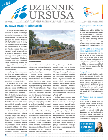 ISSN: 1425-2996 b e z p ł a t n e p i s m o u r z ę d u d z i e l n i c y u r s u s m . s t. w a r s z a w y nr 8/238, sierpień 2013 Budowa stacji Niedźwiadek Kolejna wystawa z cyklu „Rody Ursusa” Skąd pochodzi rodzina Wallów? Kto w czasie powstania walczył w słynnym Zgrupowaniu AK „Radosław”? Kto był jednym z pierwszych rolników na terenie obecnego Ursusa? Odpowiedzi na te i wiele innych pytań przyniesie trzecia wystawa plenerowa z cyklu „Rody Ursusa”. s.2 W związku z zakończeniem prac torowych w rejonie budowanego przystanku Warszawa Ursus Niedźwiadek, z dniem 2 września br. ruch pociągów na odcinku Warszawa Włochy-Pruszków wróci do normy. Nie oznacza to jednak, że przystanek zostanie oddany do eksploatacji. Pozostaje jeszcze dużo pracy fot. E. Kowalewska na samej wyspie peronowej oraz w przejściu podziemnym. Widać już bryłę peronu, podpory wiaty, latarnie. Trzeba jeszcze dobudować brakującą część wyspy peronowej, ułożyć nawierzchnię, wykonać ele- Wyspa peronowa wację przejścia podziemnego, zain- tych utrudnień jest zamknięcie sta- ścia podziemnego wychodzi pro- stalować windy dla niepełnospraw- cji Warszawa Lotnisko Chopina dla stopadle do osi torów w kierunku nych i oświetlenie. naprawy torów po czerwcowym skrzyżowania ulic: Orląt Lwowskich wykolejeniu pociągu. i Keniga, vis-a-vis pętli autobuso- Dodatkową dobrą wiadomością jest, że w tym samym terminie zo- utrudnienia wej. Południowa klatka schodowa staną zakończone prace torowe na w ruchu pociągów regionalnych Niestety, pewne jest usytuowana równolegle do moście średnicowym, co zakończy na linii Warszawa- Grodzisk Mazo- torów, z wyjściem w kierunku Pia- utrudnienia w ruchu pociągów. wiecki-Skierniewice będą występo- stowa. Schody wyprowadzające W związku z tym zostaną przy- wać. Rozpoczyna się bowiem kolej- na peron skierowane są w stronę wrócone do kursowania obecnie ny etap modernizacji linii kolejowej obecnego przystanku Warszawa odwołane pociągi Kolei Mazowiec- nr 1: Warszawa-Katowice. Wiąże Ursus. Przystanek ma być połączo- kich. Linia SKM S1 wróci na swoją się to z koniecznością wykonania ny bezpiecznym dojściem z istnieją- trasę podstawową: Pruszków – wielu prac torowych i przebudo- cym już kompleksem parkingowym Otwock, likwidacji ulegną linie za- wą sieci trakcyjnej. Pocieszającym „Parkuj i jedź”. stępcze SKM: S11 operująca za linię może być fakt, że we wrześniu Przejście podziemne, poza oczy- S1 pomiędzy stacjami: Warszawa prace najbardziej ingerujące w ruch wistym połączeniem obu stron Zachodnia i Pruszków i S10 operu- pociągów będą wykonywane tylko torów z peronem, w znacznym jąca za linię S1 pomiędzy stacjami: w weekendy. Prace będą wymagały stopniu poprawi również bezpie- Warszawa Wschodnia i Otwock. zamknięć torów przez kilka godzin czeństwo. Miejmy nadzieję, że dzię- Na swoją trasę podstawową wróci w ciągu dnia. ki niemu zniknie lub przynajmniej również linia S2: Warszawa Lotni- A teraz kilka ciekawostek doty- radykalnie się zmniejszy ruch pie- sko Chopina-Sulejówek Miłosna, czących budowanego przystanku szych przez dzikie przejścia. Miesz- likwidacji ulegnie linia zastępcza Warszawa Ursus Niedźwiadek: pe- kańcy Niedźwiadka doskonale wie- S20, operująca w wakacje za linię ron będzie miał standardową dłu- dzą, ile ofiar pochłonęło skracanie S2 pomiędzy stacjami: Warszawa gość 200 m, umieszczony będzie sobie drogi poprzez przechodzenie Wschodnia i Sulejówek Miłosna. pomiędzy torami podmiejskimi. przez tory. A należy pamiętać, że W pierwszych dniach września, Wiata peronowa architektonicznie pociągi a dokładnie od 2 do 8 linia S2 bę- dopasowana jest do wiat na innych przez Ursus poruszają się z prędko- dzie dojeżdżała tylko do przystanku przystankach tej linii kolejowej. ścią 120 km/h. Warszawa Służewiec. Powodem Północna klatka schodowa przej- www.facebook.com/dzielnicaursus www.twitter.com/dzielnicaursus dalekobieżne Czy 100 lub 80 lat to wiek już poważny, czy jeszcze młodzieńczy Harcerstwo liczy sobie już 100 lat. Jest to jedyna w kraju organizacja o tak długim stażu. Tylko w Ursusie już od 80 lat działają harcerze, a ich pierwsze spotkanie odbyło się w 1933 r. w nowo otwartej Szkole Powszechnej przy obecnej ulicy Bohaterów Warszawy. s.3 Pożegnanie lata Mieszkańcy naszej dzielnicy zdążyli się już przyzwyczaić do dwóch dużych imprez organizowanych przez Urząd Dzielnicy. Po czerwcowych Dniach Ursusa, przyszedł czas na kolejną imprezę. Tym razem gwiazdą Pożegnania lata będzie zespół Pectus. Koncert odbędzie się 7 września o godz. 20.30 w Parku Czechowickim. s.4 RTS Widzew Łódź na stadionie „Traktorków” Po 30 latach KS Ursus mógł powtórzyć sukces swoich starszych kolegów i awansować do 1/8 Pucharu Polski. Była piękna słoneczna niedziela 18 sierpnia 2013 roku. Na stadion przy ul. Sosnkowskiego 3 przybyło prawie tysiąc osób, by wspólnie towarzyszyć i dopingować „Traktorkom” do zwycięstwa. s.7 kursujące Robert Różycki w w w. u r s u s . w a r s z a w a . p l Urząd DZIENNIK URSUSA 2 Z prac Zarządu W lipcu br. Zarząd Dzielnicy Ursus Zarząd Dzielnicy wyraził zgodę na zgodę na udzielenie bonifikaty od w budynku przy ul. Walerego Sław- czterokrotnie obradował na posie- umieszczenie w rejestrze osób ocze- opłaty rocznej z tytułu użytkowania ka 2 („Acherówka”), przeznaczonych dzeniach, ich efektem było podjęcie kujących na najem lokalu socjalnego wieczystego nieruchomości grunto- na działalność statutową (nieodpłat- uchwał i ustaleń istotnych dla bieżą- 5 osób, w związku z wyrokiem Sądu wej przeznaczonej na cele mieszka- ną) Ośrodka Kultury „Arsus”. cych spraw Dzielnicy Ursus. Rejonowego dla m.st. Warszawy. niowe. Zarząd Dzielnicy wyraził zgodę Uchwały w większości doty- Ponadto podjęto uchwałę w spra- Zarząd pr
