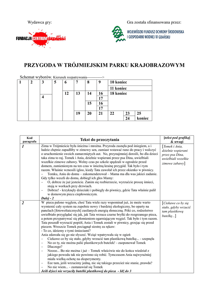 Gra została sfinansowana przez: Wydawca gry: PRZYGODA W TRÓJMIEJSKIM PARKU KRAJOBRAZOWYM Schemat wyborów. Kierunek rozpatrywania-------------> 1 2 3 5 6 7 8 9 4 12 13 14 15 19 Kod paragrafu 1 2 20 16 17 16 17 21 10 koniec 11 koniec 18 koniec 22 23 24 25 koniec Tekst do przeczytania Zima w Trójmieście była śnieżna i mroźna. Przyroda zasnęła pod śniegiem, a i ludzie chętnie zapadliby w zimowy sen, zamiast wstawać rano do pracy i walczyć o uruchomienie swoich zamarzniętych aut. No, przynajmniej dorośli, bo dla dzieci taka zima to raj. Tomek i Ania, dzielnie wspierani przez psa Dina, uwielbiali wszelkie zimowe zabawy. Wolny czas po szkole spędzali w ogrodzie przed domem, zamienionym na ten czas w śnieżną krainę przygód. Tak było i tym razem. Właśnie wznosili igloo, kiedy Tata zawołał ich przez okienko w piwnicy. Tomku, Aniu do domu – zakomenderował – Mama ma dla was jakieś zadanie. Gdy tylko weszli do domu, dobiegł ich głos Mamy: O, dobrze że już jesteście. Zanim się rozbierzecie, wyrzućcie proszę śmieci, stoją w workach przy drzwiach. Dobrze! - krzyknęły dzieciaki i pobiegły do piwnicy, gdzie Tata właśnie palił w domowym piecu ciepłowniczym. Dalej - 2 W piecu palono węglem, choć Tata wiele razy wspominał już, że może warto wymienić cały system na zupełnie nowy i bardziej ekologiczny, bo oparty na panelach [fotowoltaicznych] zasilanych energią słoneczną. Póki co, rodzeństwo uwielbiało przyglądać się jak, jak Tata wrzuca czarne bryłki do rozgrzanego pieca, a potem przypatrywać się płomieniom ogarniającym węgiel. Tak było i tym razem. Tata poszedł wyrzucić popiół, Ania i Tomek zostali w piwnicy, grzejąc się przed piecem. Wreszcie Tomek pociągnął siostrę za rękaw: - To co, idziemy z tymi śmieciami? Ania zdawała się go nie słyszeć. Wciąż wpatrywała się w ogień Ciekawe co by się stało, gdyby wrzucić tam plastikową butelkę... - szepnęła No co ty, nie można palić plastikowych butelek! - zaoponował Tomek Dlaczego? Noooo... Bo nie można i już – Tomek właściwie nie do końca wiedział z jakiego powodu tak nie powinno się robić. Tymczasem Ania najwyraźniej miała wielką ochotę na eksperymenty. Eee tam, jeśli wrzucimy jedną, nic się takiego przecież nie stanie, prawda? No nie wiem... - zastanawiał się Tomek Jeśli dzieci nie wrzuciły butelki plastikowej do pieca - Idź do 3 [tekst pod grafiką] & uwagi [Tomek i Ania, dzielnie wspierani przez psa Dina, uwielbiali wszelkie zimowe zabawy] [Ciekawe co by się stało, gdyby wrzucić tam plastikową butelkę...] 3 4 5 6 7 Jeśli dzieci zdecydowały się wrzucić plastikową butelkę do pieca - Idź do 4 Nie, nie róbmy tego. Coś mi mówi, że byłyby z tego później kłopoty – nie ustępował Tomek No dobrze – zgodziła się z nim siostra. - W takim razie chodźmy może na spacer. Weźmiemy Dina. Dobry pomysł – zgodził się jej brat. Wyszli z piwnicy, gwizdnęli na psa i założyli mu obrożę. Mamooo! - zawołali - Idziemy na spacer z Dinem. Weźmiemy śmieci. Tylko pamiętajcie, żeby wrzucić je do odpowiednich pojemników! – przestrzegła Mama Dalej - 5 Chwilę jeszcze wahali się co zrobić, w końcu ciekawość przeważyła. Ania po cichu zabrała do piwnicy jeden z worków – ten z plastikowymi odpadami. Otworzyli drzwiczki pieca i wrzucili butelkę po napoju gazowanym. Plastik skręcił się dziwacznie i stopił. Wooow... Fajnie... Może wrzucimy następną? - zaproponowała Ania. Na następnej jednak się nie skończyło. Rozochoceni spalili ostatecznie prawie wszystkie plastikowe odpadki. Został im tylko pusty worek, więc i ten wylądował w piecu. Oboje przeczuwali, że nie zachowali się właściwie, postanowili zatem nie mówić o tym rodzicom. Ten drugi worek to już wyrzućmy normalnie... A może weźmiemy Dina i pójdziemy z nim na spacer? - zaproponowała Ania Dobry pomysł – zgodził się z nią brat. Wyszli z piwnicy, gwizdnęli na psa i założyli mu obrożę. Mamooo! - zawołali - Idziemy na spacer z Dinem. Wyrzucimy też śmieci. Tylko pamiętajcie, żeby wrzucić je do odpowiednich pojemników! przestrzegła Mama Dalej - 5 Dzieci wypełniły polecenie Mamy. Już mieli ruszyć dalej, kiedy Ania przypomniała sobie, że przecież zapomniała o czymś ważnym. Poczekaj tu chwilę – zwróciła się do brata – zaraz wracam. Wpadła biegiem do domu, żeby wziąć ze sobą na spacer: SANKI lub TELEFON KOMÓRKOWY lub DŁUGOPIS po czym szybko wróciła do Tomka. - No, teraz możemy iść – oznajmiła zadowolona. Jeśli Ania wzięła SANKI - idź do 6 Jeśli Ania wzięła TELEFON KOMÓRKOWY lub DŁUGOPIS - idź do 12 Oooo!!! Sanki! - pisnął z uciechy Tomek. - To co? Idziemy na nasza górkę w lesie?! Idziemy! - przytaknęła jego siostra. Ze wszystkich domków jednorodzinnych na tym osiedlu ich dom znajdował się najbliżej lasu . Las był częścią Trójmiejskiego Parku Krajobrazowego, o czym informowały odpowiednie znaki przy wejściach. Park ten rozciągał się od Gdańska aż do Wejherowa, był domem wielu gatunków zwierząt i rzadkich roślin, często dodatkowo chronionych w odpowiednich rezerwatach na jego terenie. Przecinały go malownicze szlaki, idealne do wycieczek pieszych i rowerowych. Górka, na którą dzieci chodziły zjeżdżać na sankach znajdowała się w głębi lasu. Po drodze dzieci postanowiły spuścić Dina ze smyczy. Pies biegał wokół nich, radośnie merdając ogonem. Dalej - 7 Zjeżdżając na sankach, oboje bawili się wspaniale. Ich śmiechy rozbrzmiewały w całym lesie. W pewnym momencie biegający w pobliżu Dino zatrzymał się, podniósł łeb i zaczął nasłuchiwać. Po chwili warknął krótko i rzucił się pędem w głąb lasu, wzbijając za sobą tumany śniegu. Dinooo!!! Diiiinuś!!! Wracaj! - wołały za psem dzieci, ale na próżno. W oddali mignęła im młoda sarna, uciekająca ile sił przed Dinem. O rany, on złapał trop zwierzyny... - jęknę