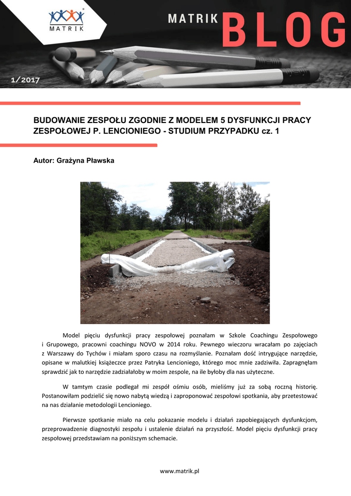 BUDOWANIE ZESPOŁU ZGODNIE Z MODELEM 5 DYSFUNKCJI PRACY ZESPOŁOWEJ P. LENCIONIEGO - STUDIUM PRZYPADKU cz. 1 Autor: Grażyna Pławska Model pięciu dysfunkcji pracy zespołowej poznałam w Szkole Coachingu Zespołowego i Grupowego, pracowni coachingu NOVO w 2014 roku. Pewnego wieczoru wracałam po zajęciach z Warszawy do Tychów i miałam sporo czasu na rozmyślanie. Poznałam dość intrygujące narzędzie, opisane w malutkiej książeczce przez Patryka Lencioniego, którego moc mnie zadziwiła. Zapragnęłam sprawdzić jak to narzędzie zadziałałoby w moim zespole, na ile byłoby dla nas użyteczne. W tamtym czasie podlegał mi zespół ośmiu osób, mieliśmy już za sobą roczną historię. Postanowiłam podzielić się nowo nabytą wiedzą i zaproponować zespołowi spotkania, aby przetestować na nas działanie metodologii Lencioniego. Pierwsze spotkanie miało na celu pokazanie modelu i działań zapobiegających dysfunkcjom, przeprowadzenie diagnostyki zespołu i ustalenie działań na przyszłość. Model pięciu dysfunkcji pracy zespołowej przedstawiam na poniższym schemacie. www.matrik.pl brak koncentracji na rezultatach unikanie odpowiedzialności brak zaangażowania strach przed konfliktem brak zaufania Dysfunkcje pokazane są tu w układzie przyczynowo skutkowym. U podstawy modelu leży zaufanie, a jego brak jest pierwszą dysfunkcją, to prowadzi do drugiej dysfunkcji - strachu przed konfliktem, co z kolei jest przyczyną trzeciej dysfunkcji - braku zaangażowania, co w konsekwencji przekłada się na powstanie czwartej dysfunkcji - unikania odpowiedzialności, co ostatecznie prowadzi do piątej dysfunkcji - braku koncentracji na rezultatach. www.matrik.pl Strona Jak zatem do wdrażania takiego modelu się zabrać? W dużym uproszczeniu, budowanie zespołu zaczyna się od diagnostyki. Lencioni daje do tego konkretne narzędzie. Zaufanie budowane jest w wyniku wzajemnego poznania i dzielenia osobistymi historiami. Lęk przed konfliktem neutralizuje się przez uświadomienie członkom zespołu, że konflikt jest czymś naturalnym i wszechobecnym. Możemy następnie uczyć się różnych strategii postępowania w sytuacjach konfliktowych. Zanim to jednak nastąpi, potrzebna jest świadomość naszych własnych preferencji. Narzędziem diagnostycznym może być na przykład test T. Kilmanna. Diagnostyka pokaże nam w jaki sposób każdy członek zespołu reaguje na konflikt i jak w związku z tym reaguje zespół. Po oswojeniu tematyki konfliktu, następuje profilowanie behawioralne, ze pośrednictwem dostępnych testów osobowości czy kompetencji psychospołecznych: MBTI, neo ffi, iPCoach121.Wyniki zestawiane są na jednej matrycy, co sprzyja pokazywaniu różnic. Korzyścią takiego podejścia jest to, że poszczególne osoby stają się bardziej wyrozumiałe zarówno dla innych, jak i dla siebie. Coś się polaryzuje. Zespół mając świadomość preferencji poszczególnych członków, zaczyna używać osobistych zasobów w sposób bardziej konstruktywny. Przy braku zaufania organizacji do tego typu narzędzi można wykorzystać badanie stylów komunikacji, czy ustalania ról zespołowych. Brak zaangażowania eliminowany jest poprzez wypracowanie wspólnych zasad, wartości, norm, poprzez wspólne spotkania i rozmawianie o tym, co działa lub co należy zmienić. Brak odpowiedzialności neutralizuje efektywna 2 Model wywrócił do góry nogami moje dotychczasowe podejście do pracy zespołowej. Uważałam, że zaufanie jest raczej wynikiem pracy zespołu i osiągania zakładanych rezultatów, a podstawą są kompetencje poszczególnych osób w zespole. Nowa koncepcja mówiła o tym, że należy zacząć od zbudowania zaufania, kompetentni pracownicy byli niejako czymś oczywistym, w innym wypadku nie zostaliby przecież zrekrutowani. komunikacja wzajemna i budowanie kultury informacji zwrotnej. Mając to wszystko, zespół w sposób naturalny interesuje się rezultatami, które świadomie wypracowuje. Rezultaty są miernikiem i potwierdzeniem jego skuteczności. Ważne, aby rezultaty były wizualizowane na tablicy wyników, aktualizowane i wspólnie omawiane. Pierwsze spotkanie z zespołem odbyło się w październiku 2014 roku, w skład zespołu wchodziło osiem osób, piastujących różne funkcje: menadżer operacyjny, specjalista ds. administracyjnych, menager ds. planowania, specjalista ds. IT, specjalista ds. zasobów ludzkich, kontroler zarządzania, koordynator projektu, kierownik działu obsługi klienta. Zakontraktowaliśmy cztery spotkania po dwie godziny. Miałam świadomość, że nie była to optymalna ilość czasu. W idealnym świecie powinniśmy przeznaczyć sześć godzin na pierwsze spotkanie, a dalsze sesje powinny trwać około cztery godziny, w tym dobrze aby jedna była wyjazdowa, na której odbyłoby się profilowanie behawioralne. Mogę więc uznać, że realizowałam dość anorektyczną wersję wdrożenia modelu, co mogło przełożyć się na finalny rezultat naszej pracy i brak wystarczającego czasu na dyskusję i wnioski. Pierwsze spotkanie przebiegło w atmosferze ciekawości i bez specjalnych zakłóceń. Każdy miał swój kwestionariusz do diagnostyki dysfunkcji zespołu. Zanim przystąpiliśmy do zbierania wyników na jednej planszy, zgodnie z metodologią Lencioniego, należało odpowiedzieć sobie na dwa zasadnicze pytania: 1- czy naprawdę jesteśmy zespołem? 2- czy jesteśmy gotowi do ciężkiej pracy? Odpowiedź na pierwsze pytanie wydawała się dość prosta. Wg definicji modelu zespół składa się z sześciu do dwunastu osób, mających wspólne cele, dzielących się zyskami i odpowiedzialnością związaną z ich osiąganiem. Problem jaki widzieliśmy związany był z przynależnością osób do kilku różnych zespołów funkcjonalnych, jak na przykład specjaliści: ds. IT, ds. zasobów ludzkich czy kontroler zarządzania. Pozostałe osoby pracowały w zespole operacyjnym. Przekładało się to na różną częstotli